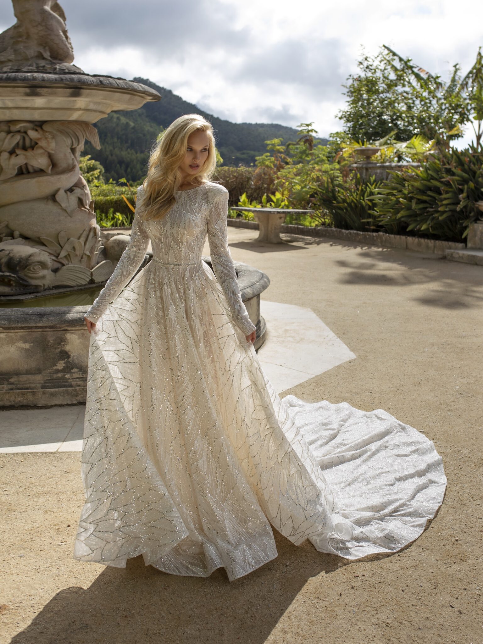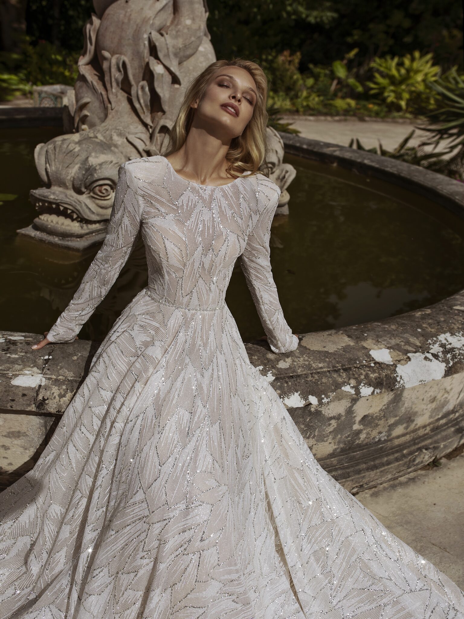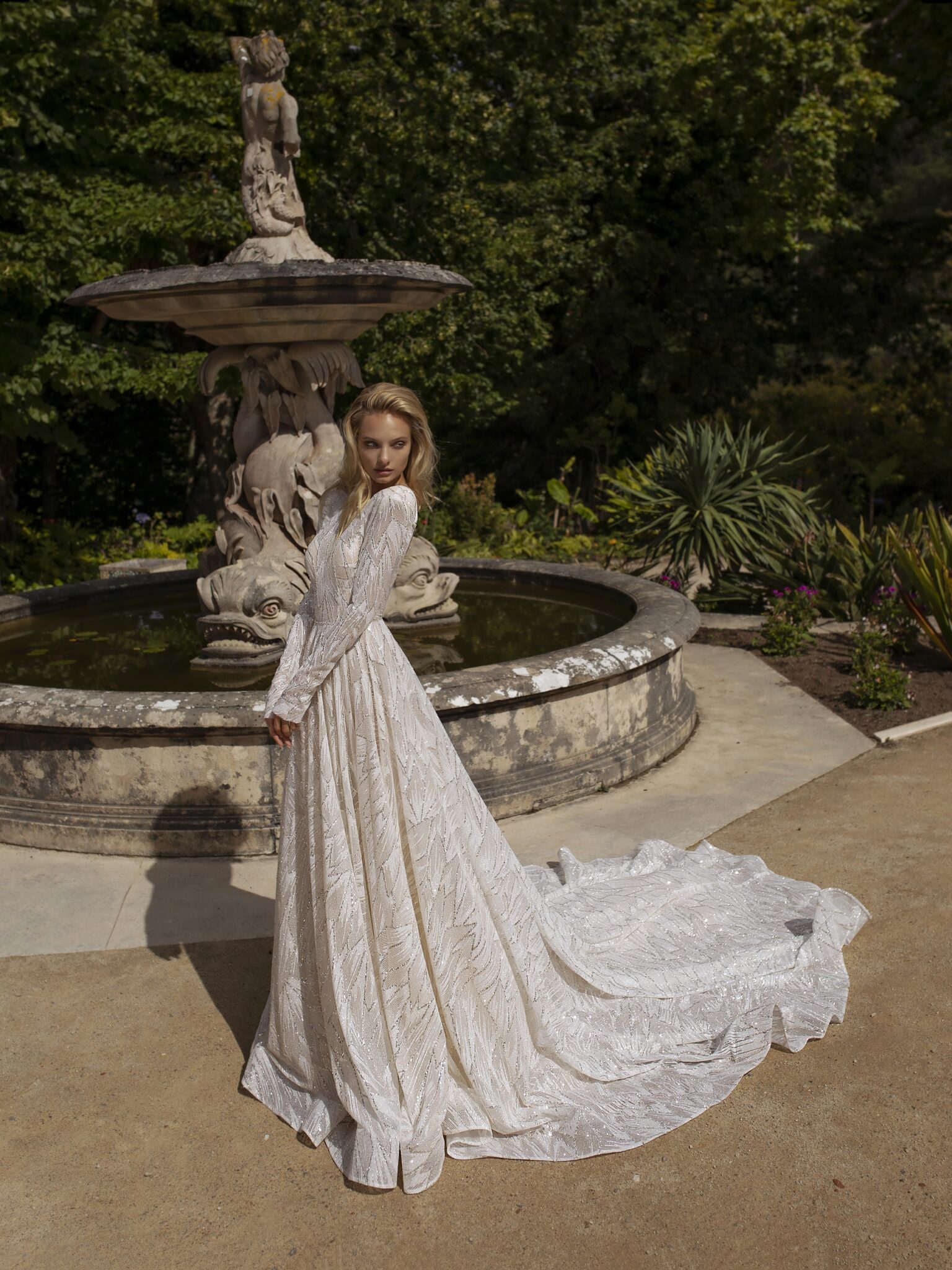 Kenzie у стилі “А-силует” – це сукня з високим вирізом, яка підкреслює фігуру нареченої та її природну красу. Весільна сукня повністю прикрашена геометричними візерунками і вишивкою з намистин. Глибокий V-подібний виріз додає відпочинку. Довгі рукава і чудовий хвіст завершують цей образ.