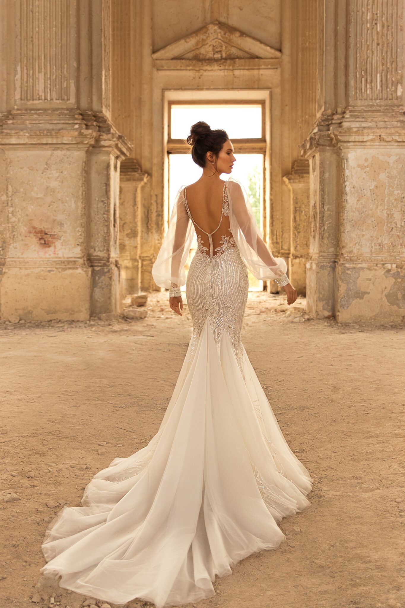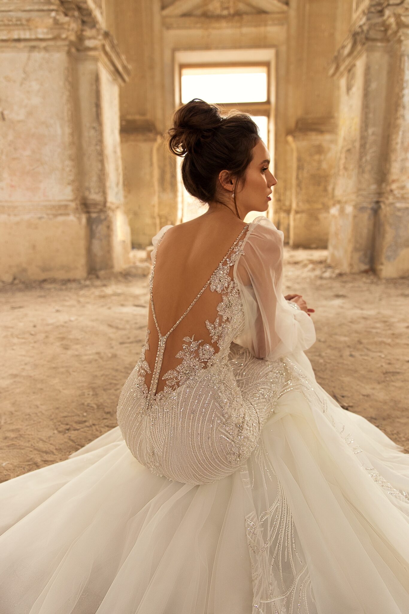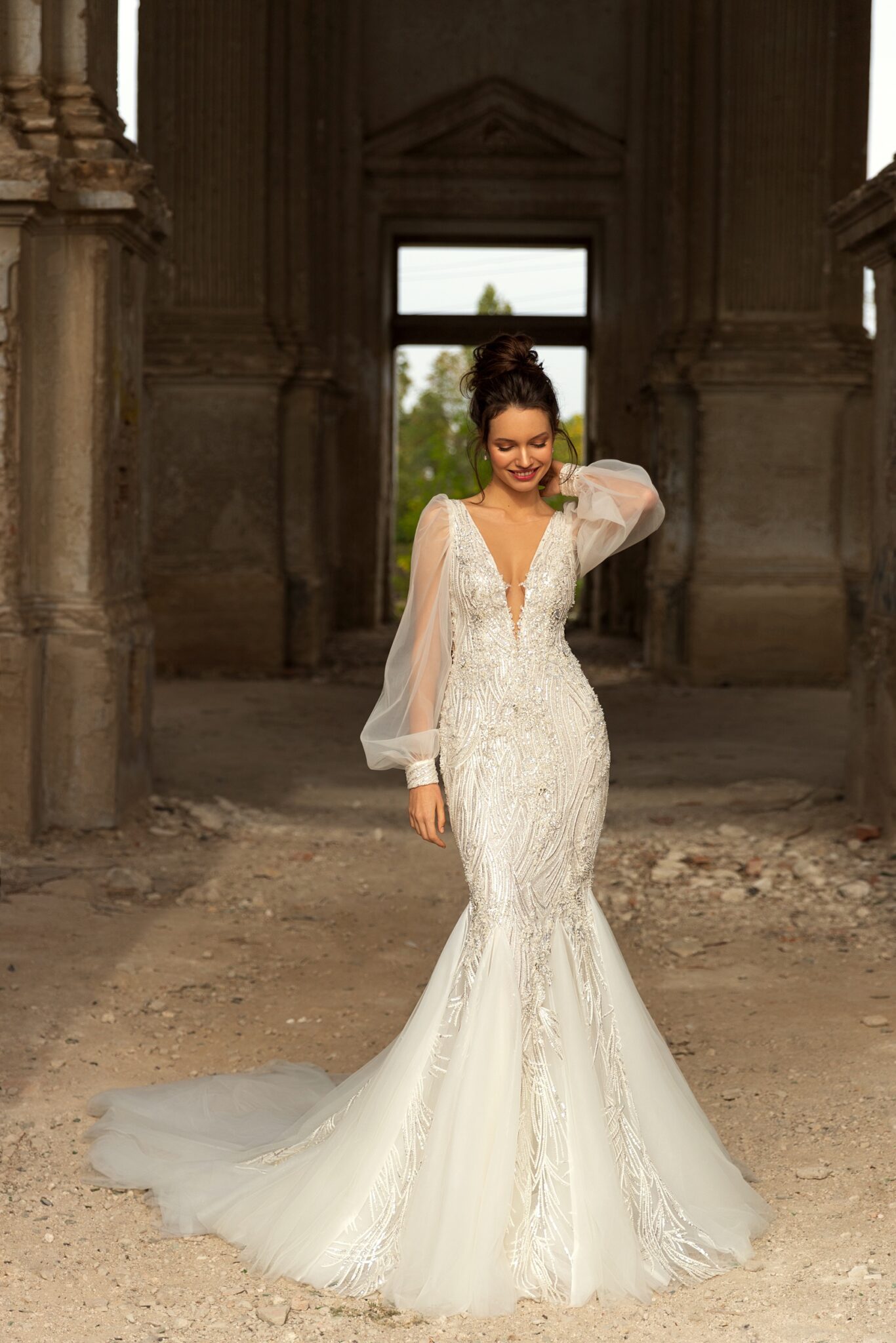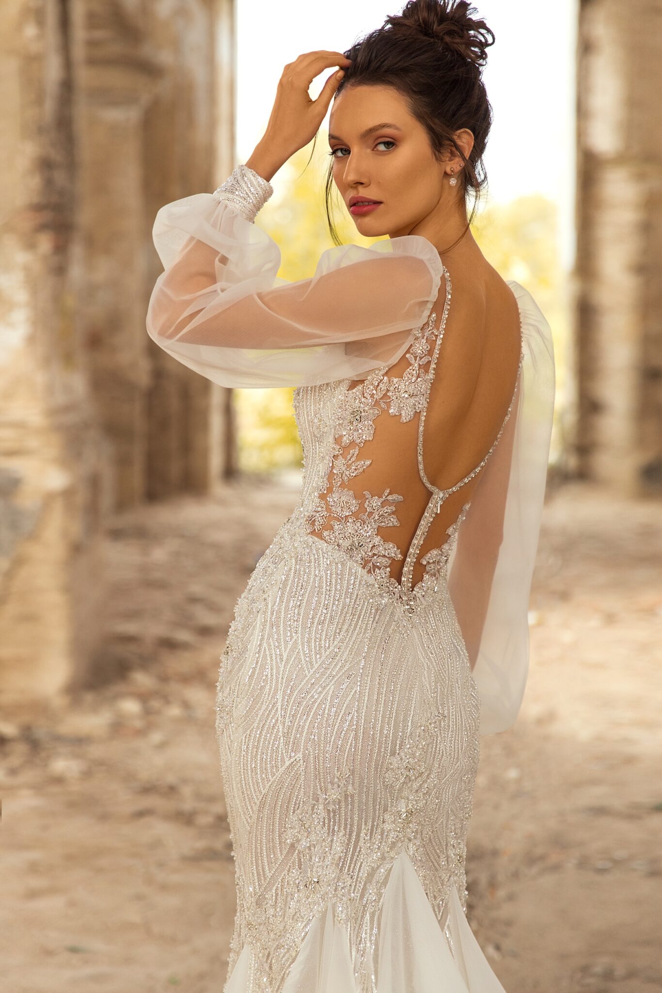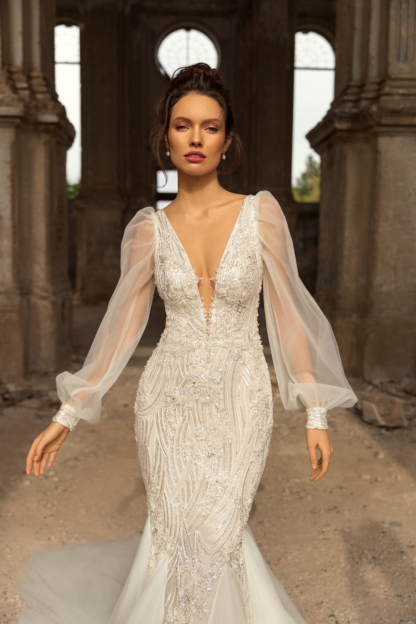 Стильна сукня Lennox – ідеальний вибір для розкішного весільного прийому. Сукня повністю прикрашена блискучим мереживом з намистинами. Довгі прозорі рукава та відкритий спин роблять образ ще більш привабливим.