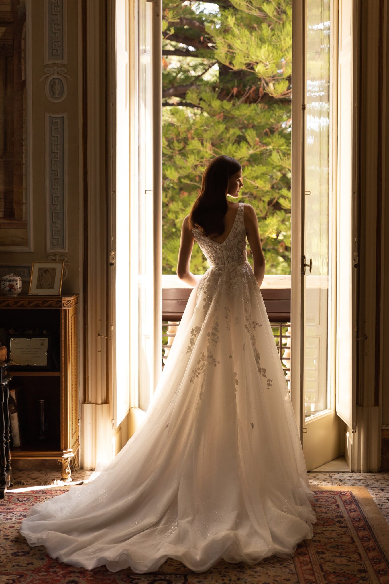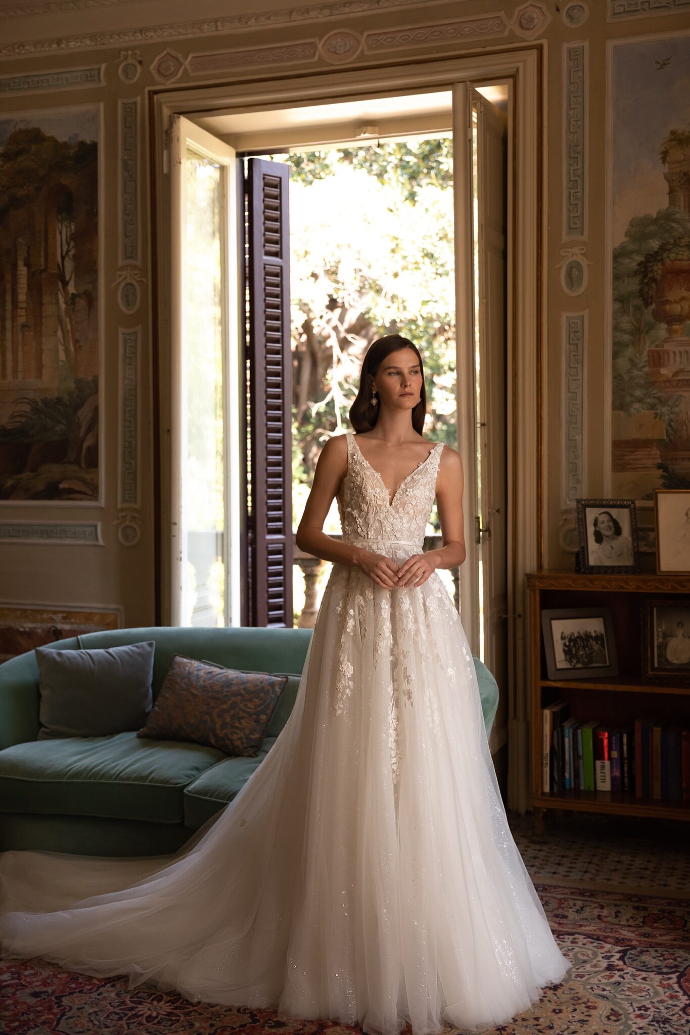Lina – справді романтична та ніжна весільна сукня в стилі A-line, виконана з мрійливого шовку та Тюлю. Сукня має виразний корсет з V-подібним вирізом і поступово звужуються бретелями, прикрашеними мініатюрними вишивками квітів. Казкові вишиті квіткові аплікації крапаються по всій довжині широкої Тюлю спідниці, яка переходить у вишуканий шлейф з Тюлю.
