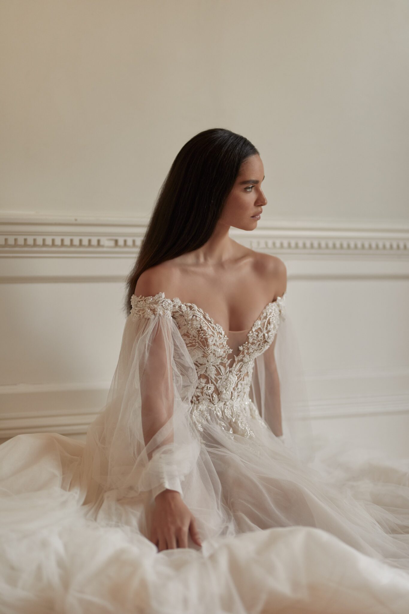 Весільна сукня Maddie – справжнє блискуче вбрання для королівського весілля. Майже повністю оголений плечевий виріз виконаний з мережива з квітковим малюнком і декорований глибоким V-подібним вирізом і прозорими широкими рукавами. Відкрита спина сукні з оголеними плечима виглядає просто фантастично. Спідниця складається з багатьох шарів вуалі і прикрашена блискітками. Чудовим доповненням є довгий фантастичний шлейф.