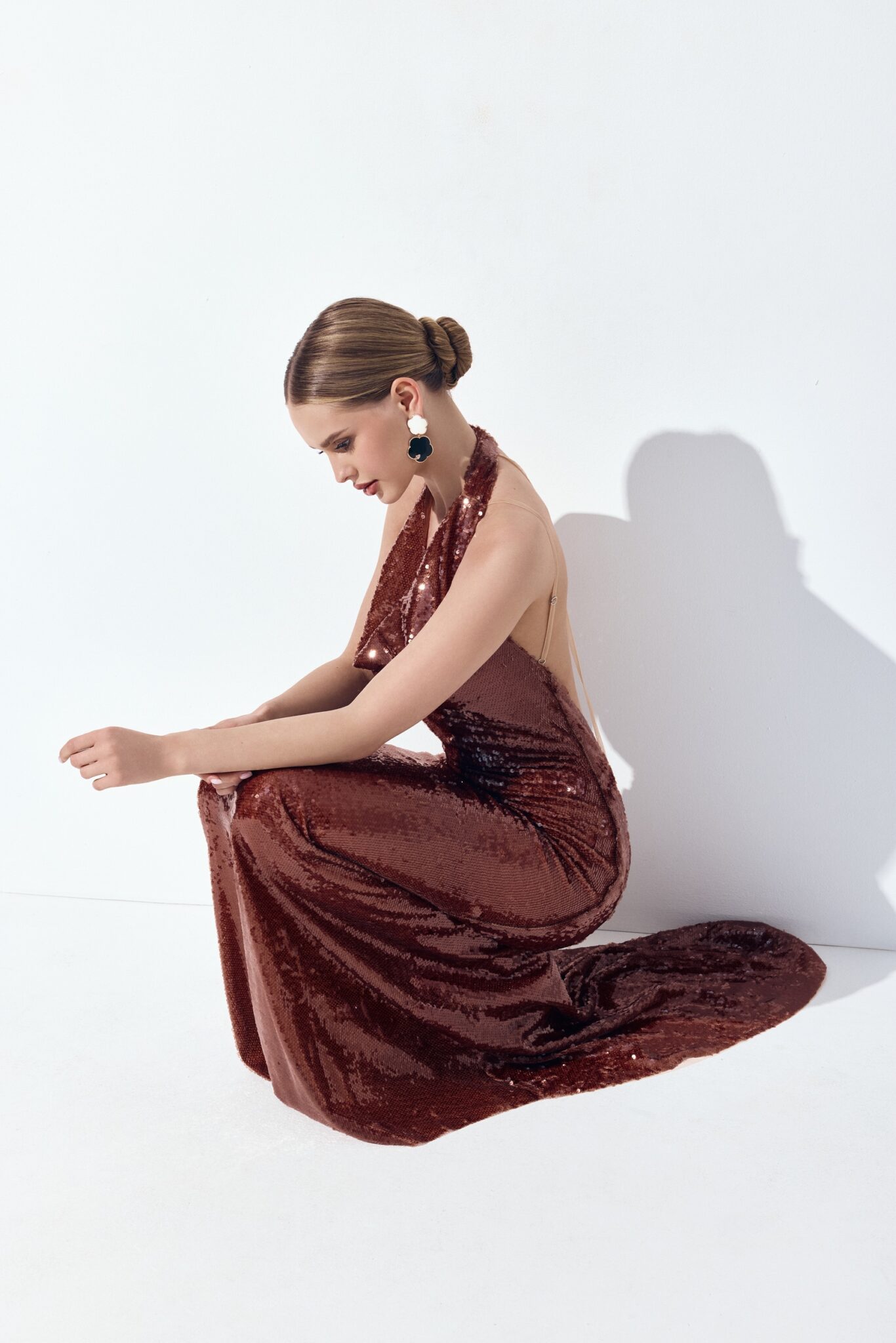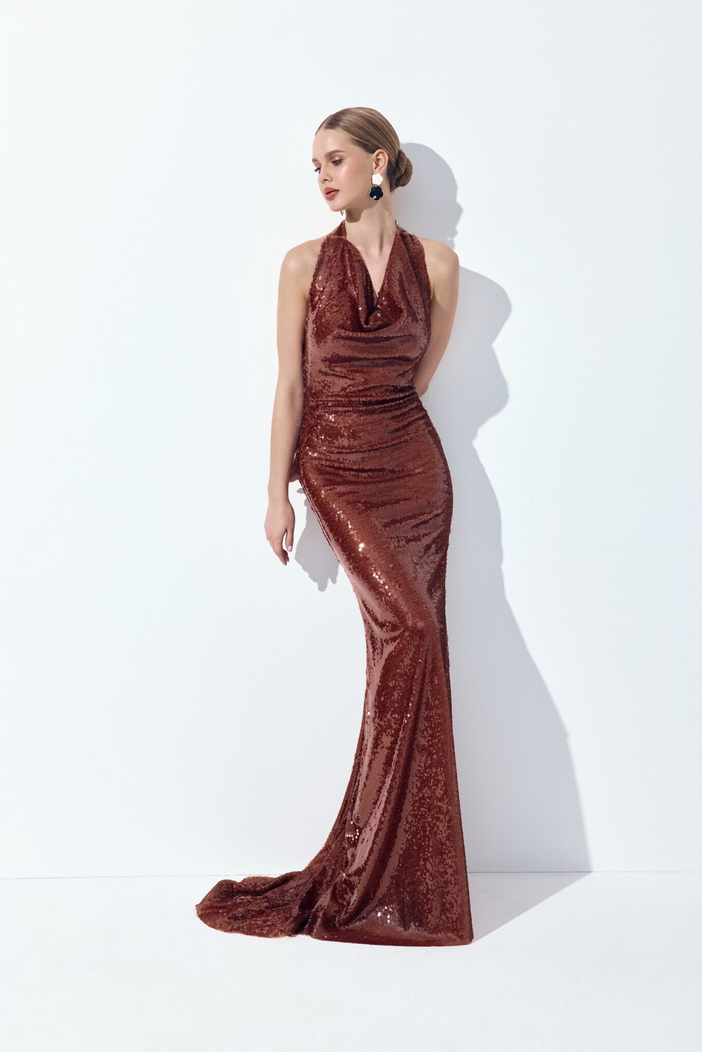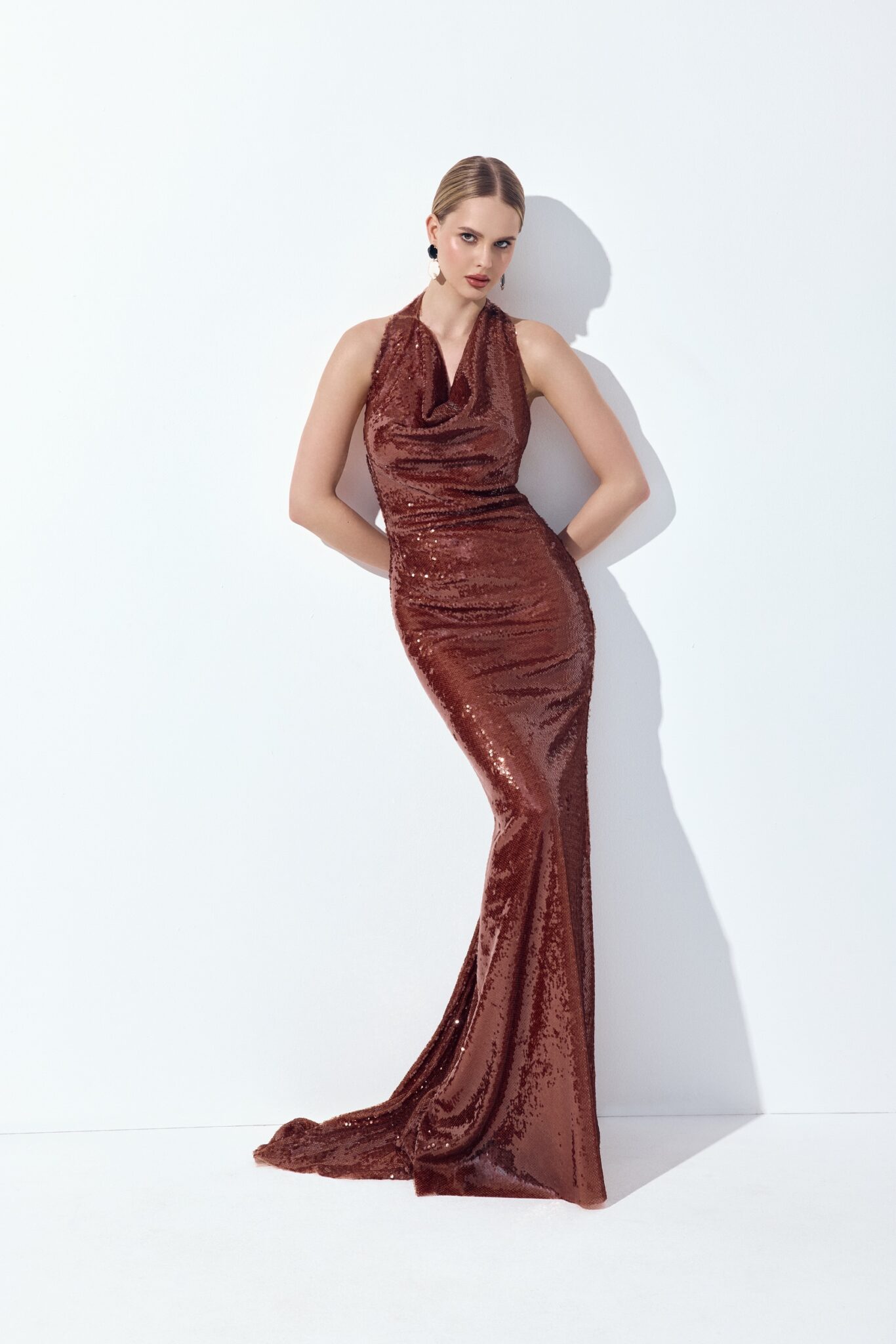 Елегантна максі-сукня з відкритими плечима та V-подібним вирізом. Уся поверхня вишита блискучими паєтками, що створюють ефект мерехтіння. Доступна у трьох відтінках: бежевому, коричневому та темно-синьому.