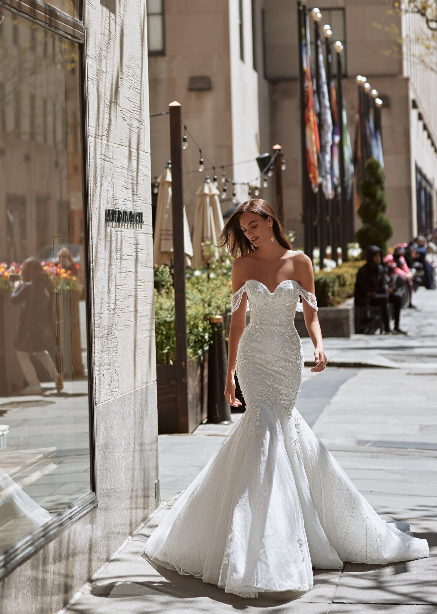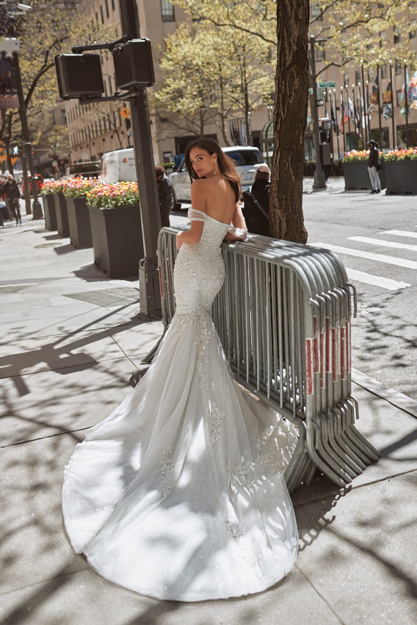 Розкішна весільна сукня Mercedes – це поєднання класичних мотивів та сучасних тенденцій. Класична сукня-рибка виконана з мережива з квітковим візерунком. Виріз у формі серця і короткі занижені рукави підкреслюють ключицнареченої. Казкова спідниця, зроблена з фатину і прикрашена мереживними квітами, переходить у ніжний шлейф.