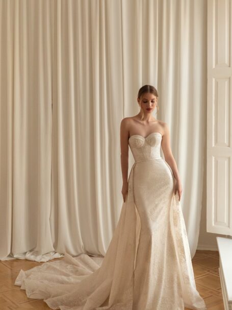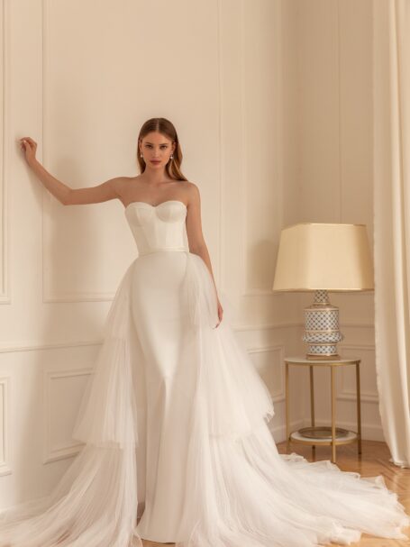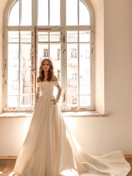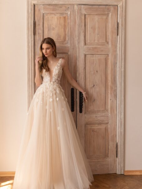 Nana – чудова весільна сукня довжини міді. Корсет має закрите декольте з високим коміром і повністю декорований вишитим мереживом. Фатин з візерунком у горошок прикрашений 3D мереживом з квітами. Весільну сукню прикрашають довгі об’ємні рукави з напівпрозорої сітки. Спідниця має довжину міді і виготовлена з шарів невагомого фатину. Талія підкреслена тонким поясом з тієї ж тканини і зав’язана на бант на спині сукні.