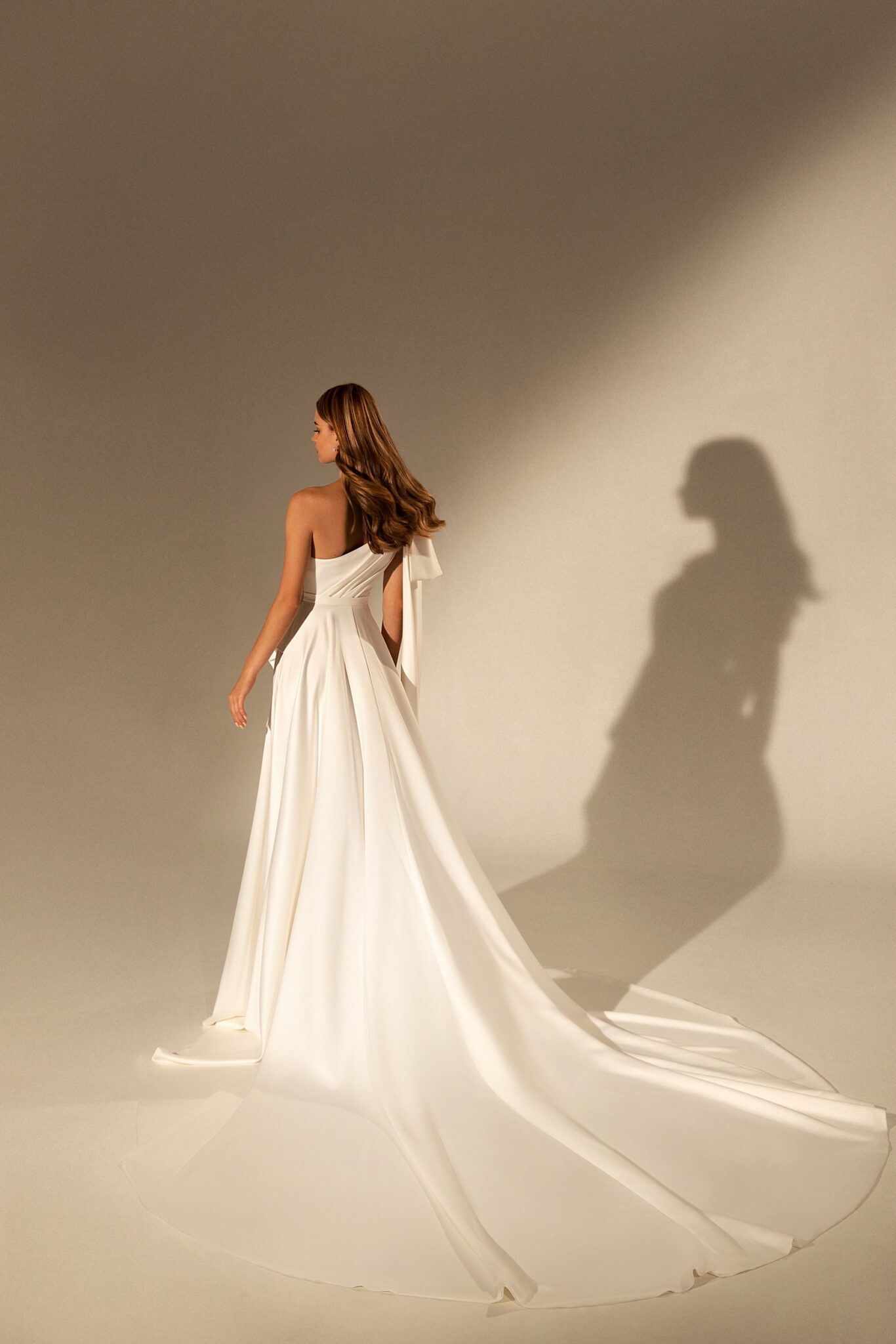 Ця весільна сукня виготовлена з атласу. Прямий спідничок підкреслює фігуру нареченої і переходить у короткий шлейф. Комбінація всіх елементів створює елегантний і вишуканий вигляд.