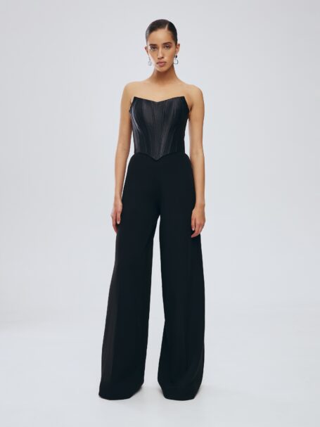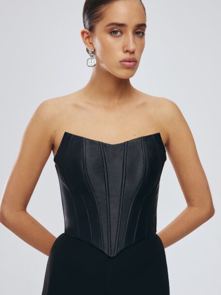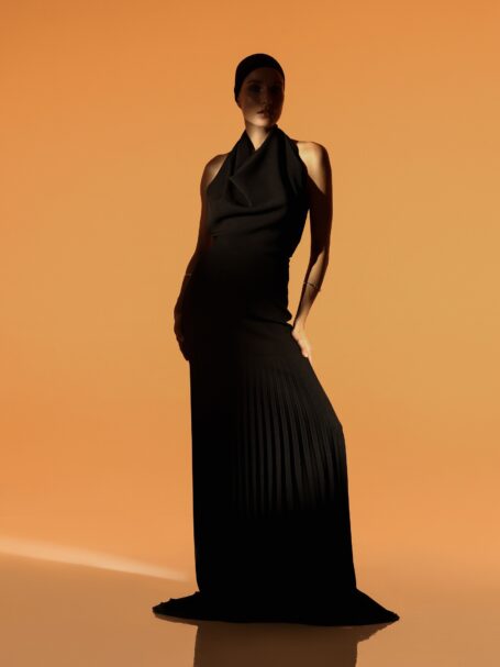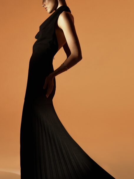 Екстравагантна весільна сукня з невагомого шифону кольору слонової кістки. Верх підкреслено глибоким V-подібним вирізом і прикрашений драпіруванням. Красиві невагомі довгі рукави додають урочистості. Спідниця приталена на стегнах і прикрашена драпіруванням. Спідниця стає вільною від стегон і має високий розріз на одній нозі.