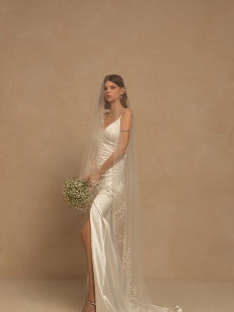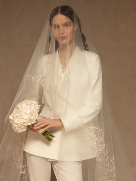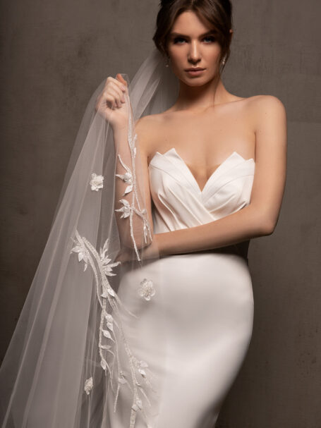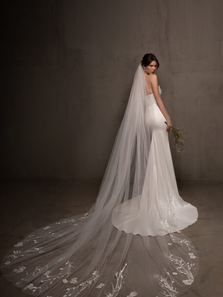 Ніжна одношарова весільна фата з тюлю, прикрашена блискучими аплікаціями з мережива, розташованими на шлейфі фати. Доступна в катедральній довжині. Закладена назад, фата утворить два шари.