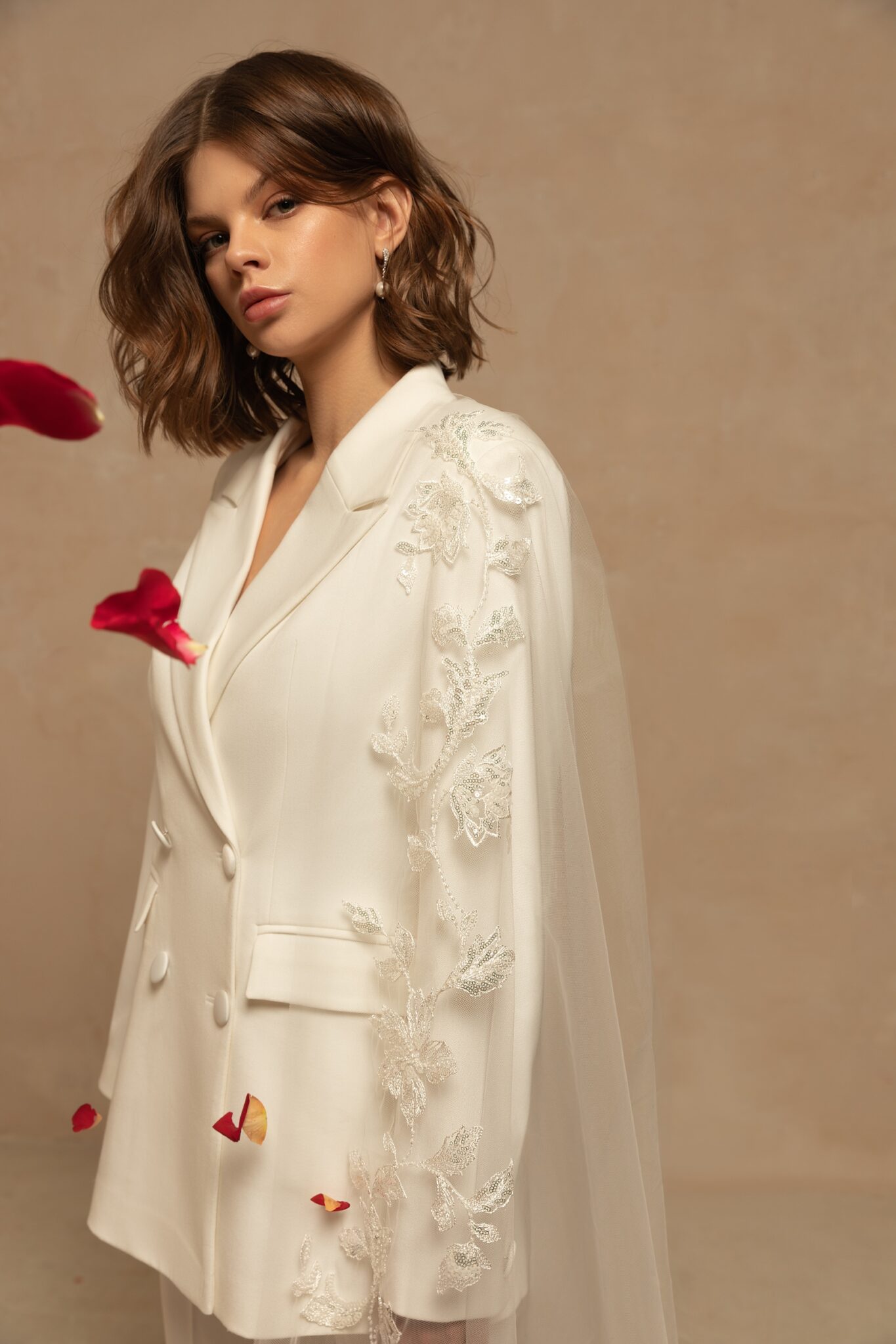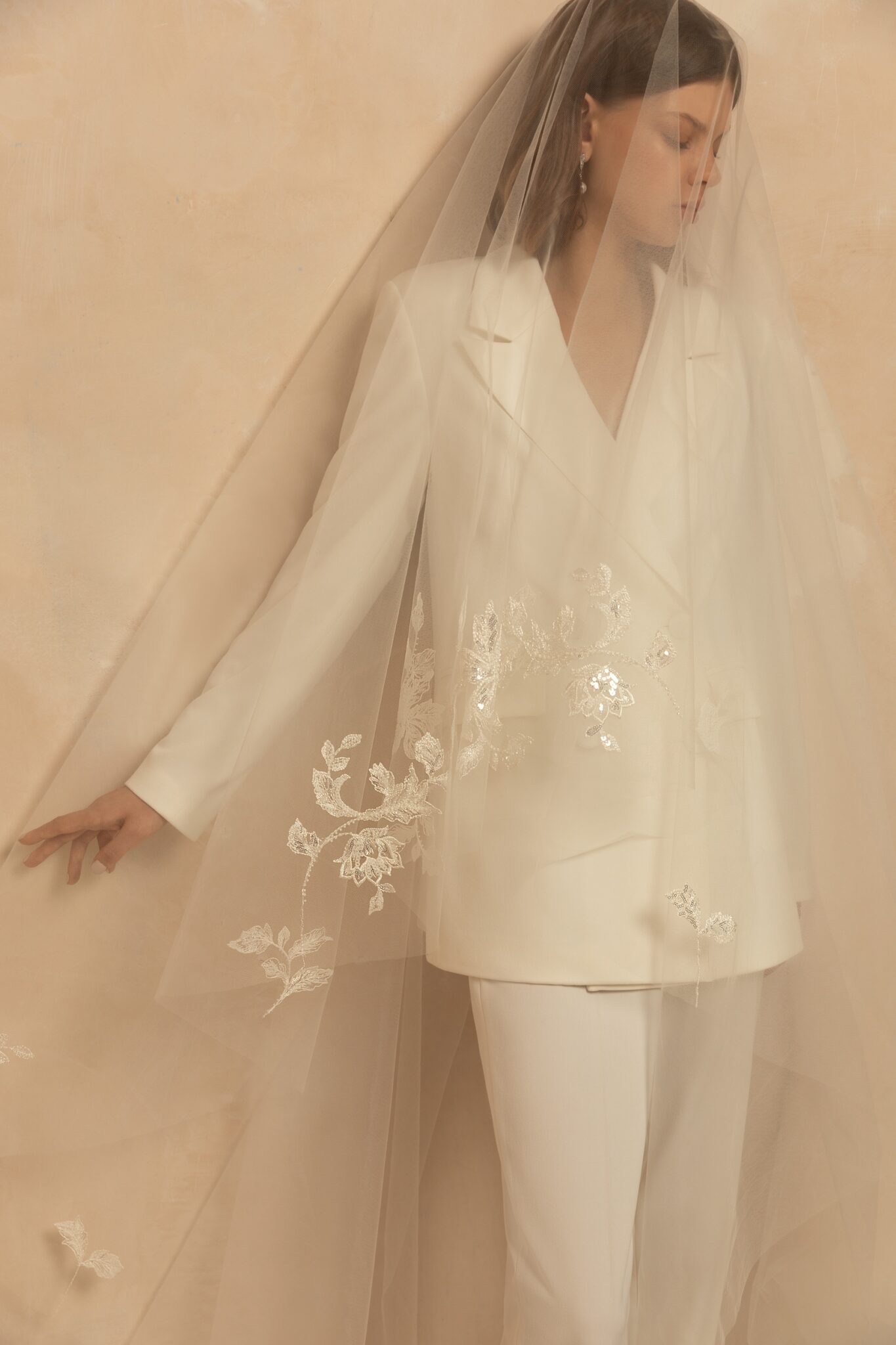 Правдиво розкішна одношарова вуаль мантильї з тюлю, прикрашена витонченим паєтковим квітковим мереживом на краях. Може бути носитись як вуаль мантильї. Доступна в катедральній довжині 4.6м. Згорнута назад, вуаль утворить два шари.