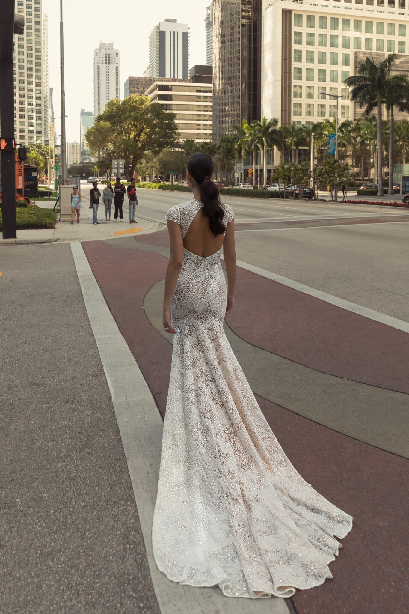 Чудова весільна сукня Olivia з чарівною спідницею та довгим шлейфом. Ця сукня виконана з розкішної тканини та повністю вишита блискітками, намистинами та кристалами. Вони утворюють цікавий малюнок по всій довжині сукні. Є короткі рукава, V-подібний виріз знизу, та закруглений виріз на спинці сукні. Спідниця переходить у шлейф.