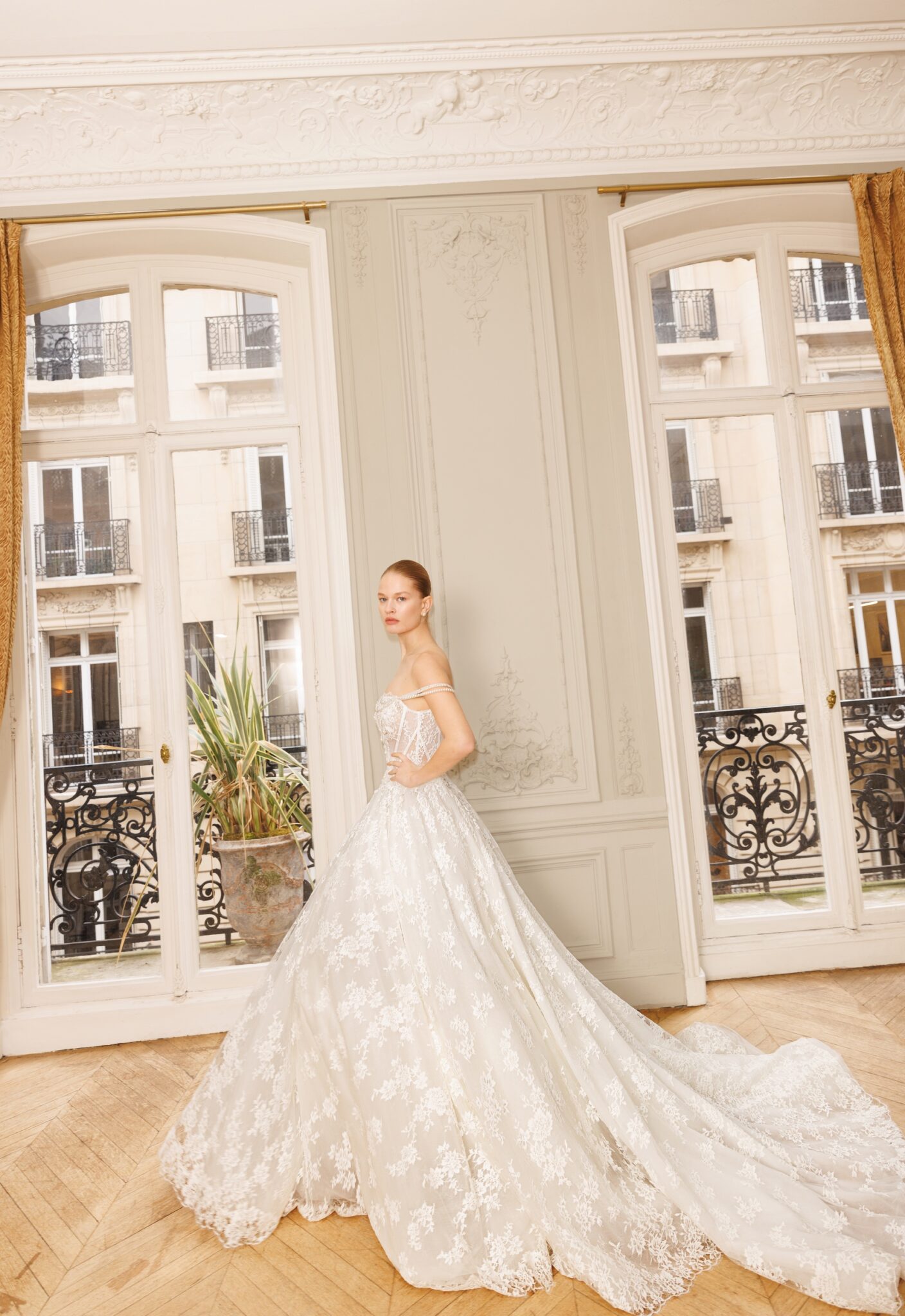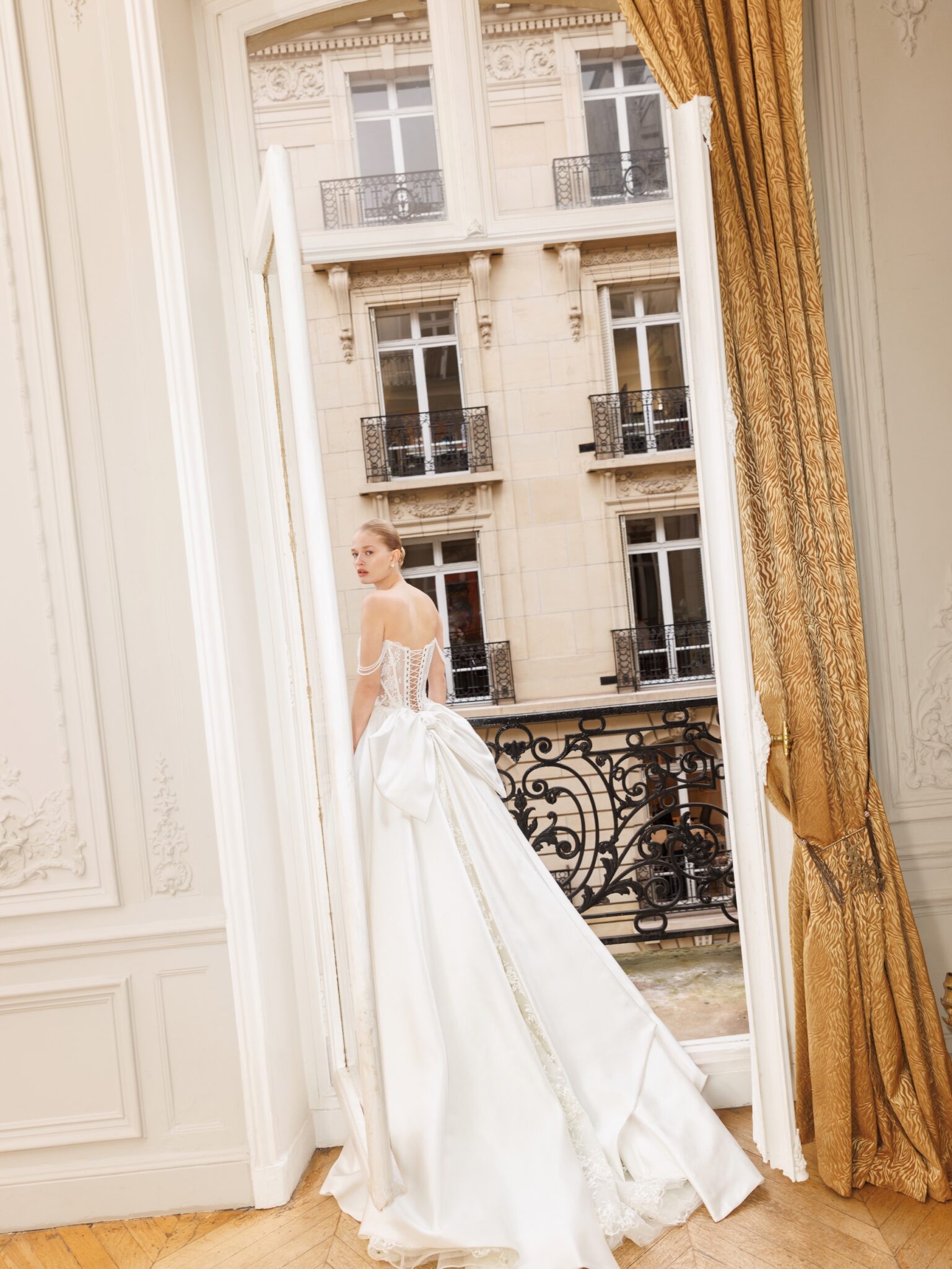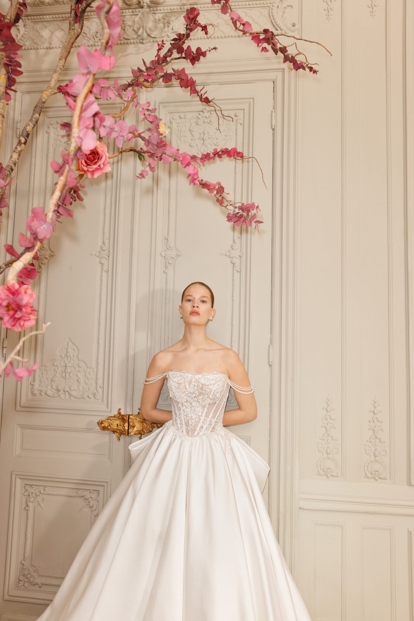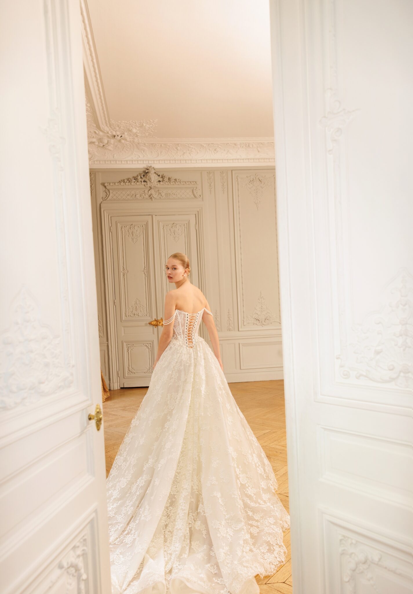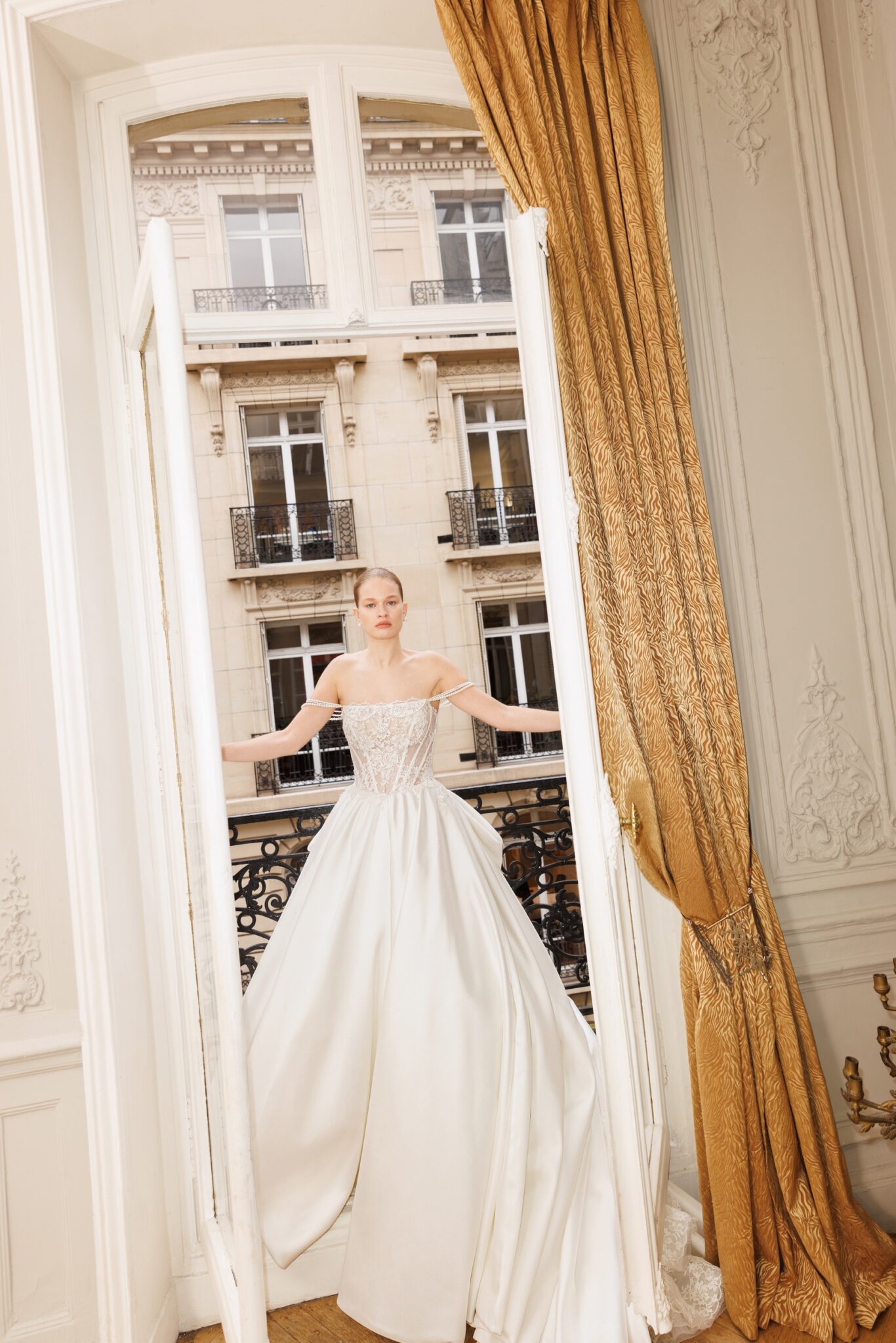 Сукня, в яку неможливо не закохатися: структурований напівпрозорий корсет зі шнурівкою на спинці, декорований вручну витонченим квітковим мереживом та перламутровими нитками, що формують бретелі на плечах («cold shoulder»). Об’ємна, але легка спідниця з тієї ж багатошарової напівпрозорої тканини, ретельно оздоблена мереживом. Знімна верхня спідниця з шовку мікадо робить образ більш елегантним і строгим, водночас залишаючи видимим витончений топ.
