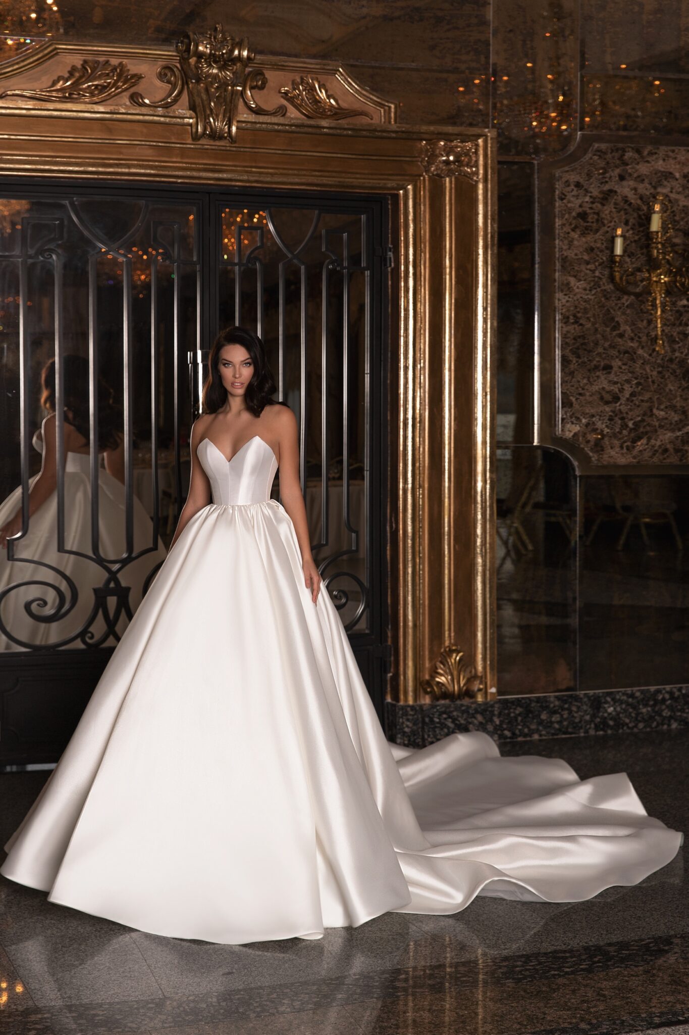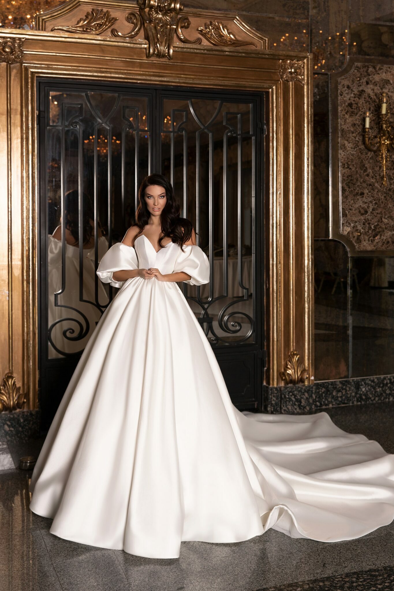 Величний весільний наряд “Patricia” створює справжній королівський образ на весіллі. Сукня у стилі А-силует з вирізом сердечко виготовлена з блискучої тканини. Знижений корсет демонструє спину нареченої, а чудова спідниця підкреслює талію. Вільні рукава не закріплені, що дозволяє носити їх або залишити знімними за вашим бажанням. Довгий фантастичний шлейф додає урочистості цьому наряду.