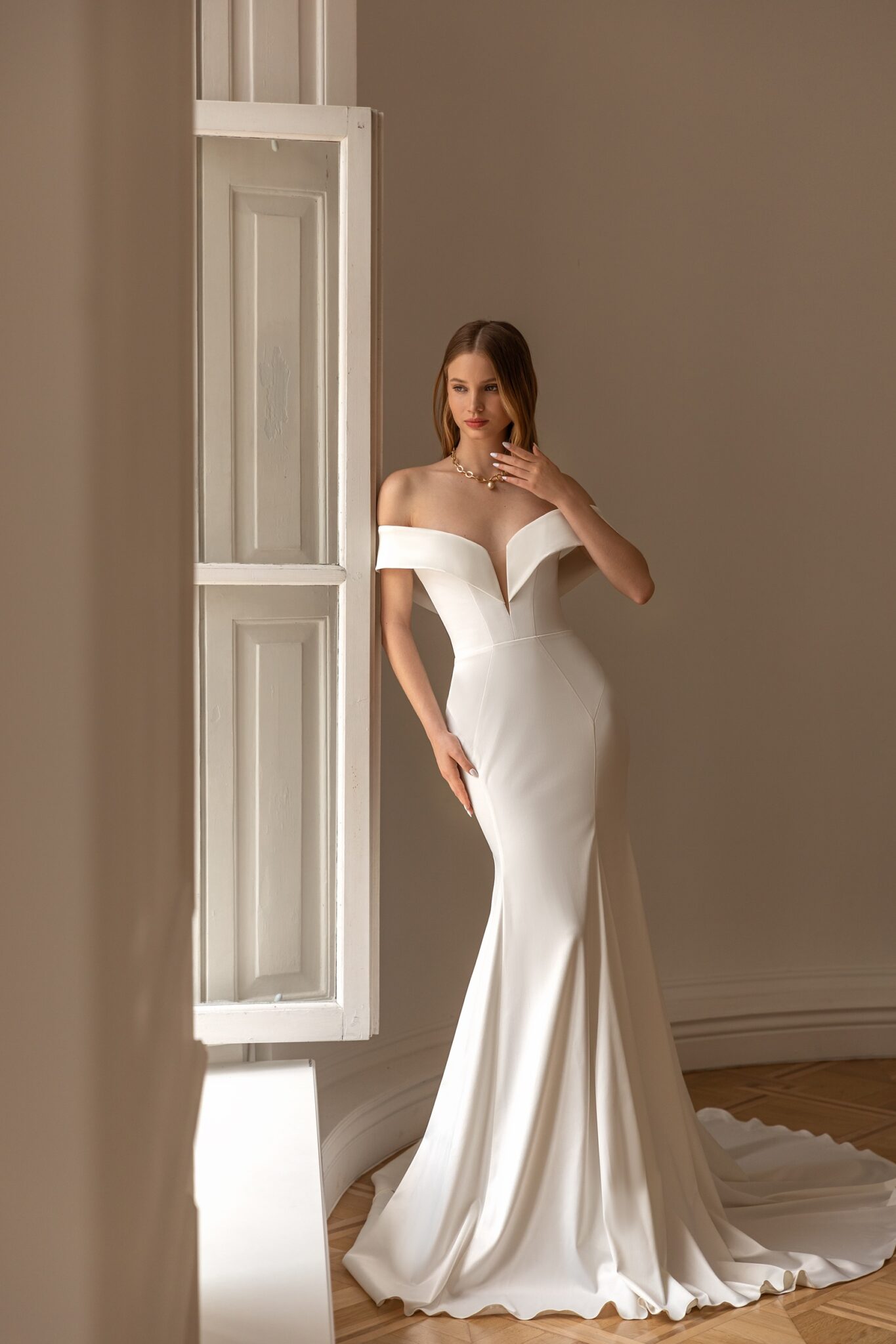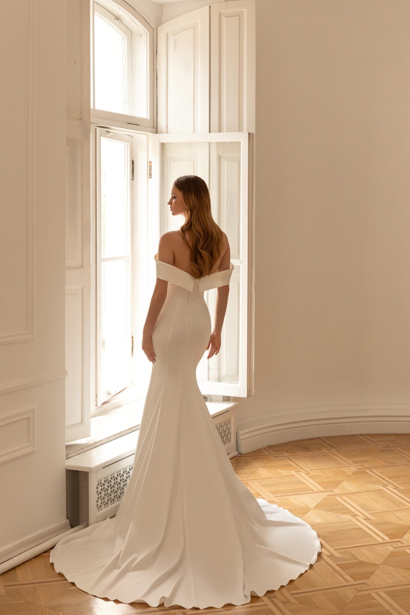 Renata — елегантна атласна весільна сукня А-силуету, яка створює королівський образ. Сукня з опущеною лінією пліч прикрашена фальбаною, яка має V-подібний виріз спереду та загострені кути ззаду сукні. Фантастична спідниця-футляр прилягає до стегон і стає вільнішою по довжині. Пишна верхня спідниця переходить в довгий шлейф, що додає урочистості вбранню.