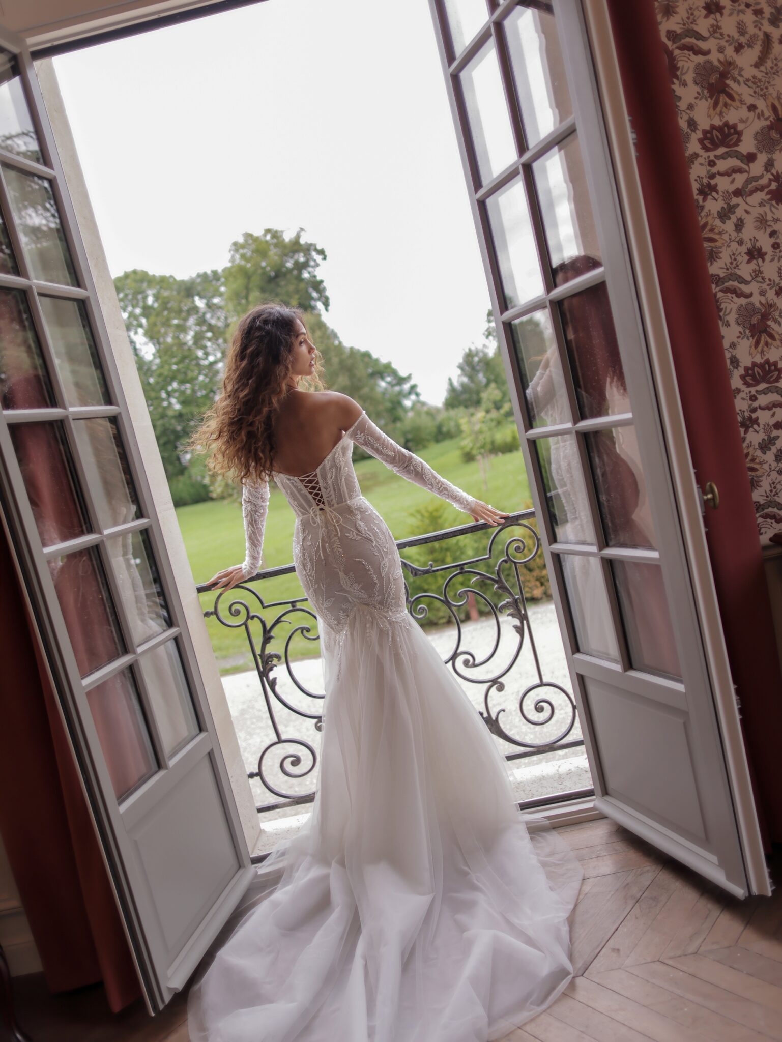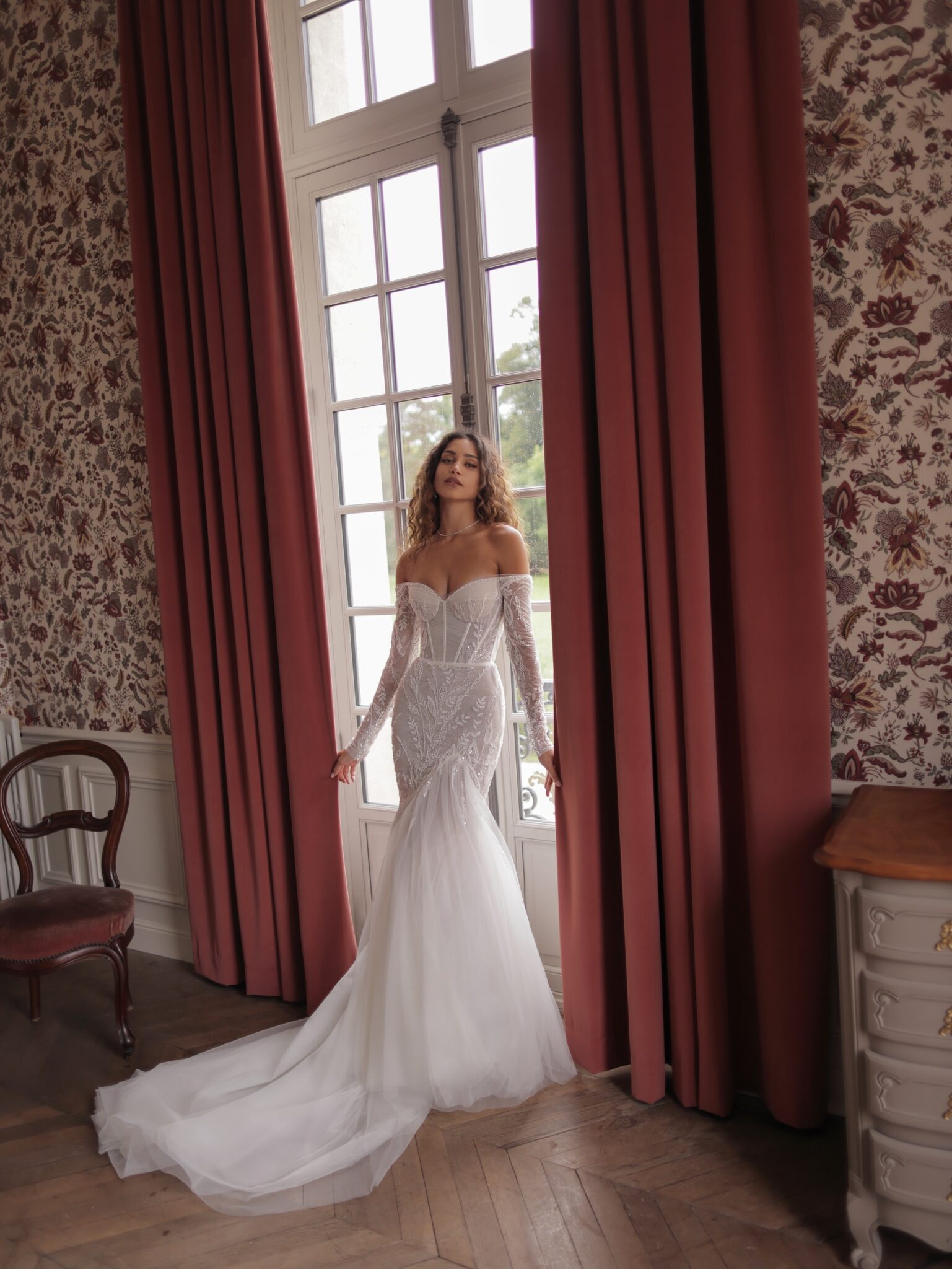 Сукня-русалка з відкритими плечима, виготовлена з напівпрозорої тканини, оздоблена квітковою вишивкою та блискучим бісером. Ліф має окреслену талію, а поділ спідниці – об’ємний напівпрозорий шлейф, що спускається від рівня стегон до підлоги.