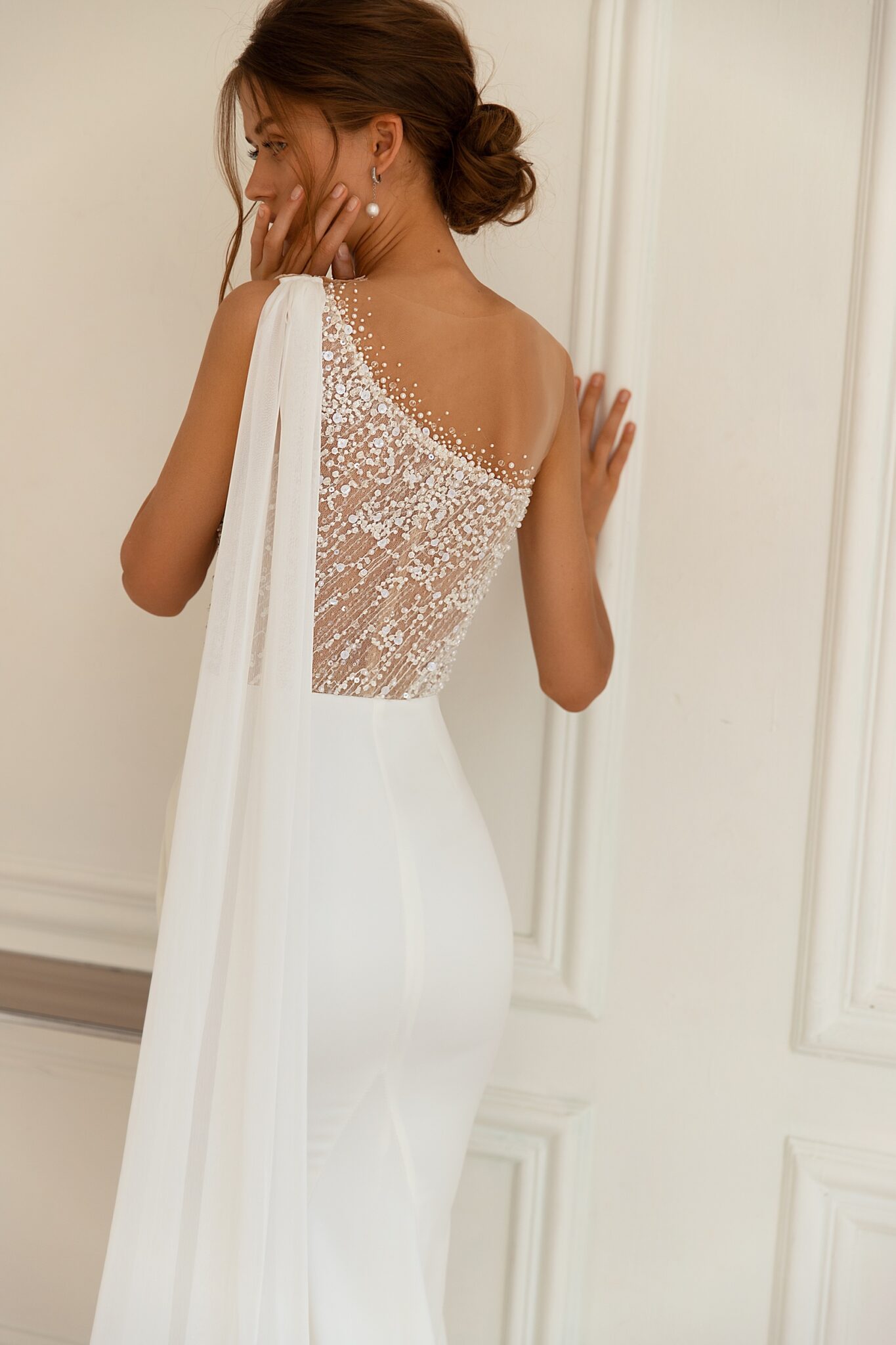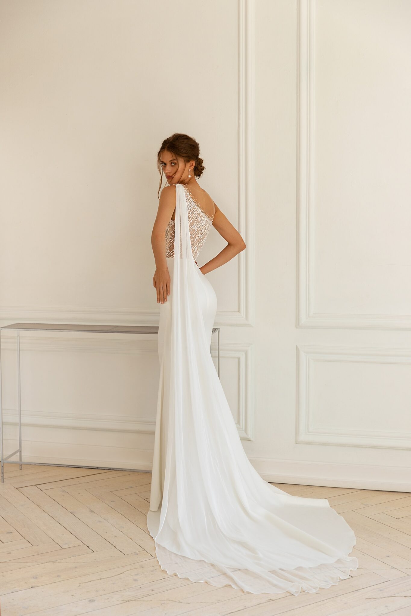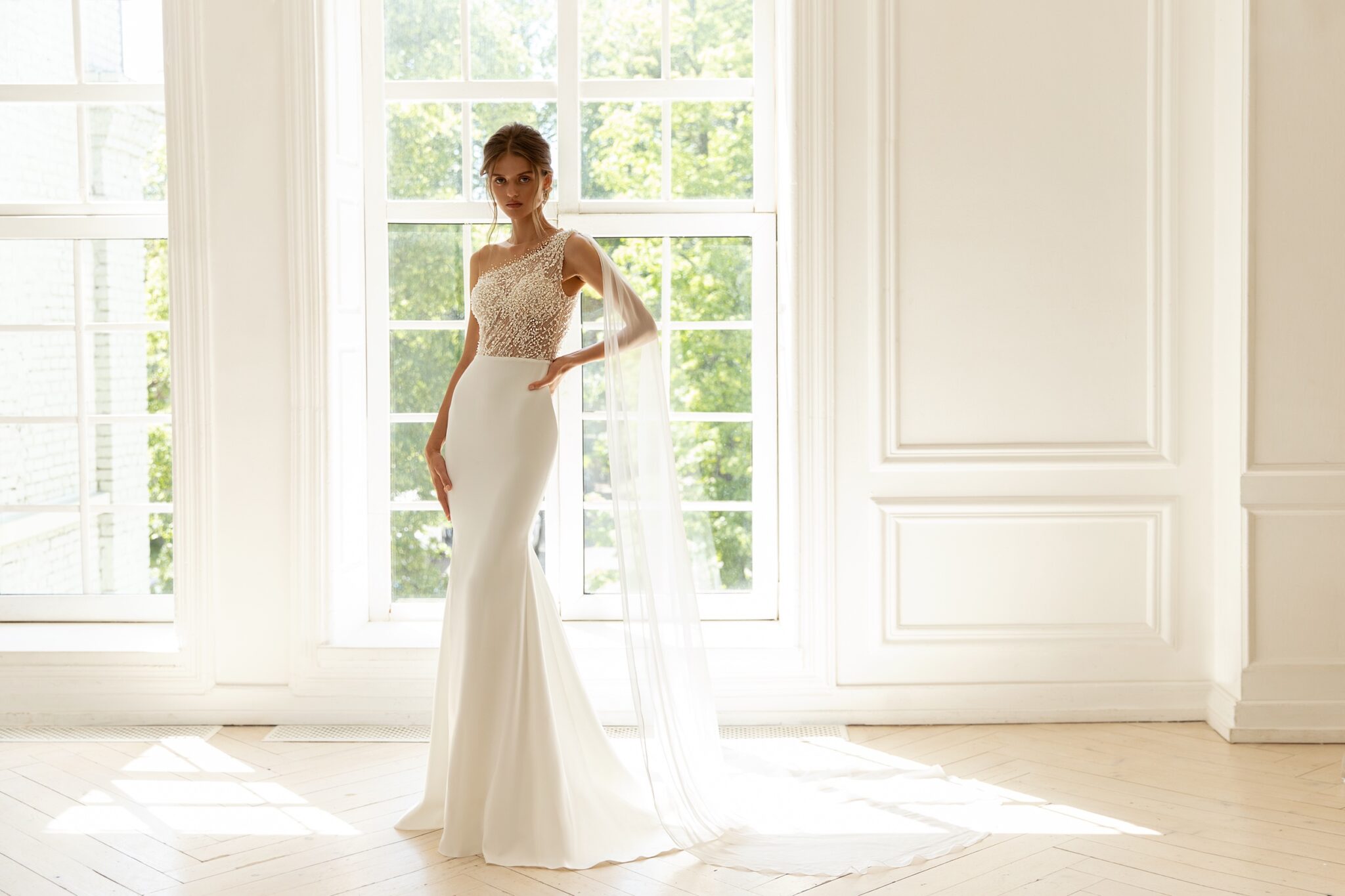 Сукня Santina – це жіночний весільний наряд прямого крою з верхом з мережива. Сукня виконана з мережива та креп-сатину. Верх прикрашений маленькими намистинами та перлинами. Прямий спідниця підкреслює фігуру нареченої і переходить у короткий шлейф. Комбінація всіх елементів створює елегантний і вишуканий образ.