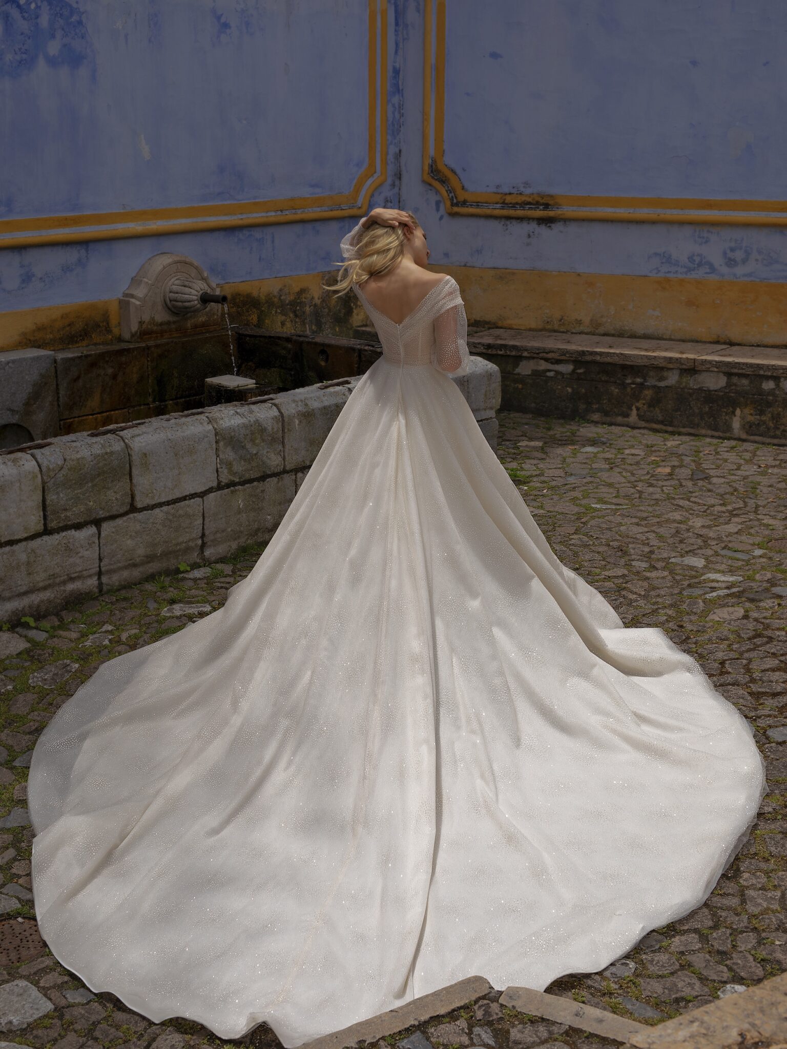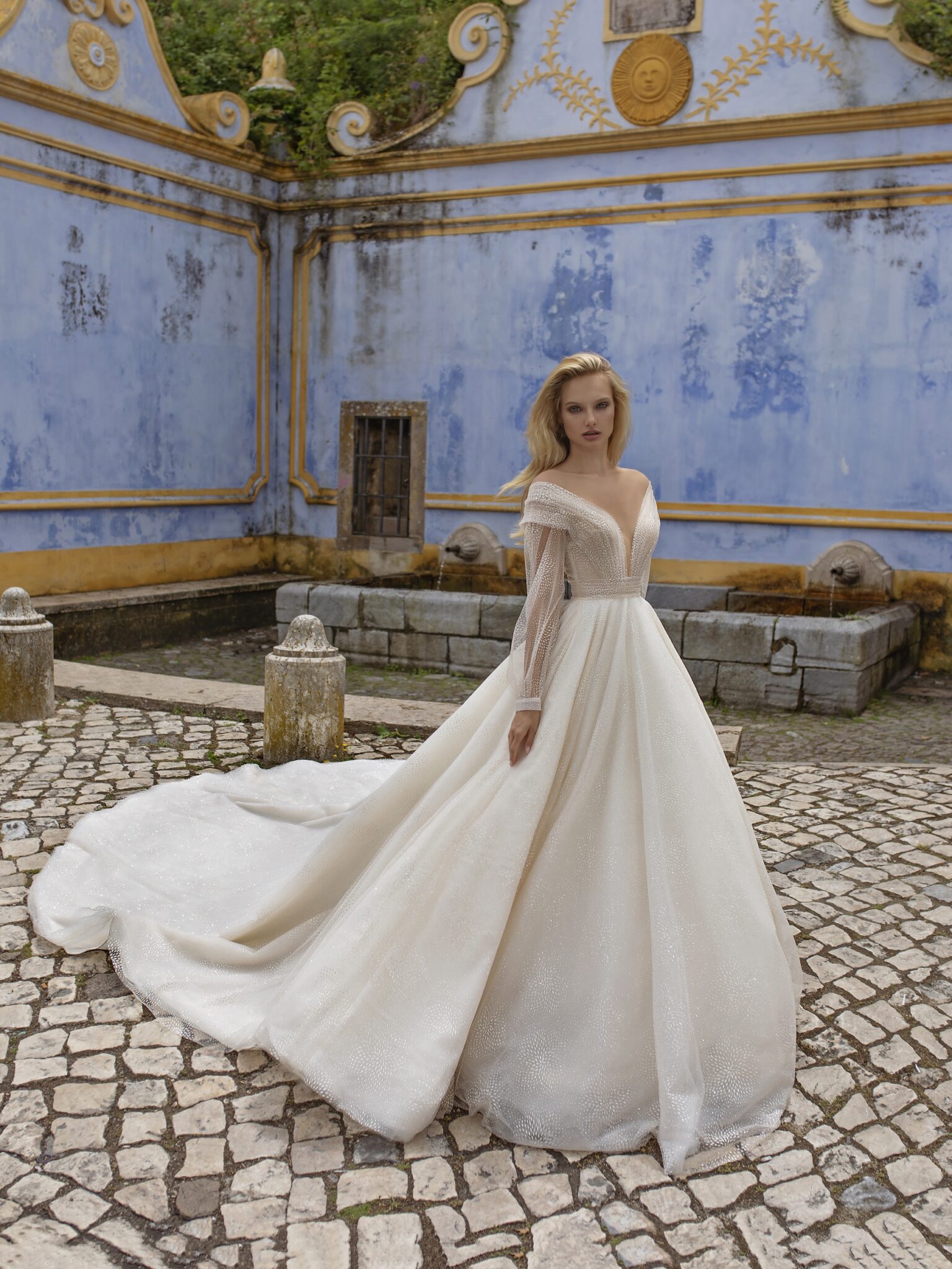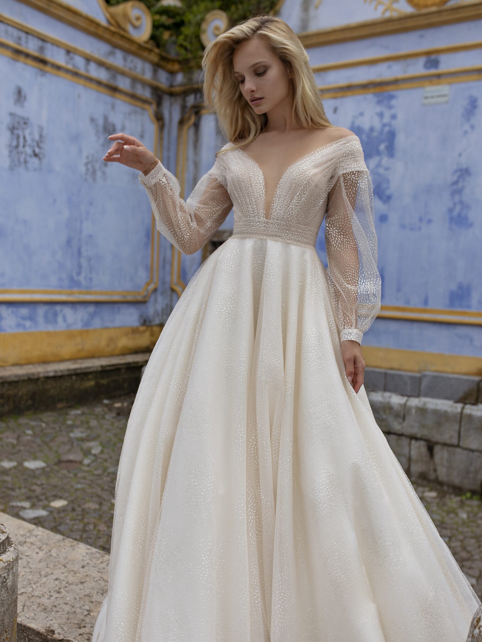 Весільна сукня “Spell” виготовлена з чудового вуалю та атласу. Внутрішню частину спідниці складає атлас, який покритий тонким шаром вуалю з невеликим малюнком листочків. Прозорий корсет з V-подібним вирізом і опущеними плечима прикрашений широкими рукавами.