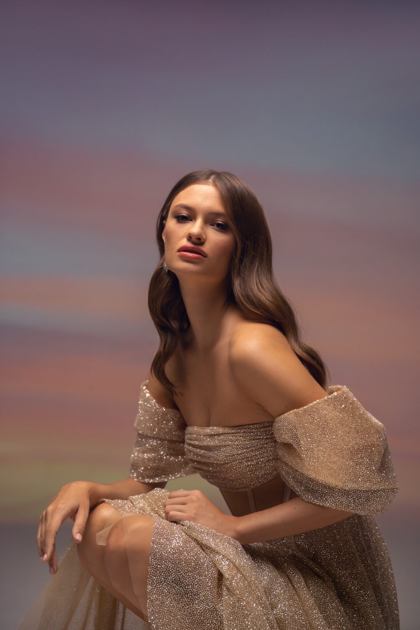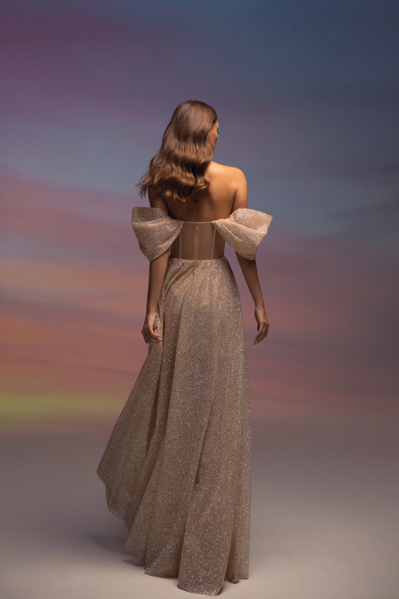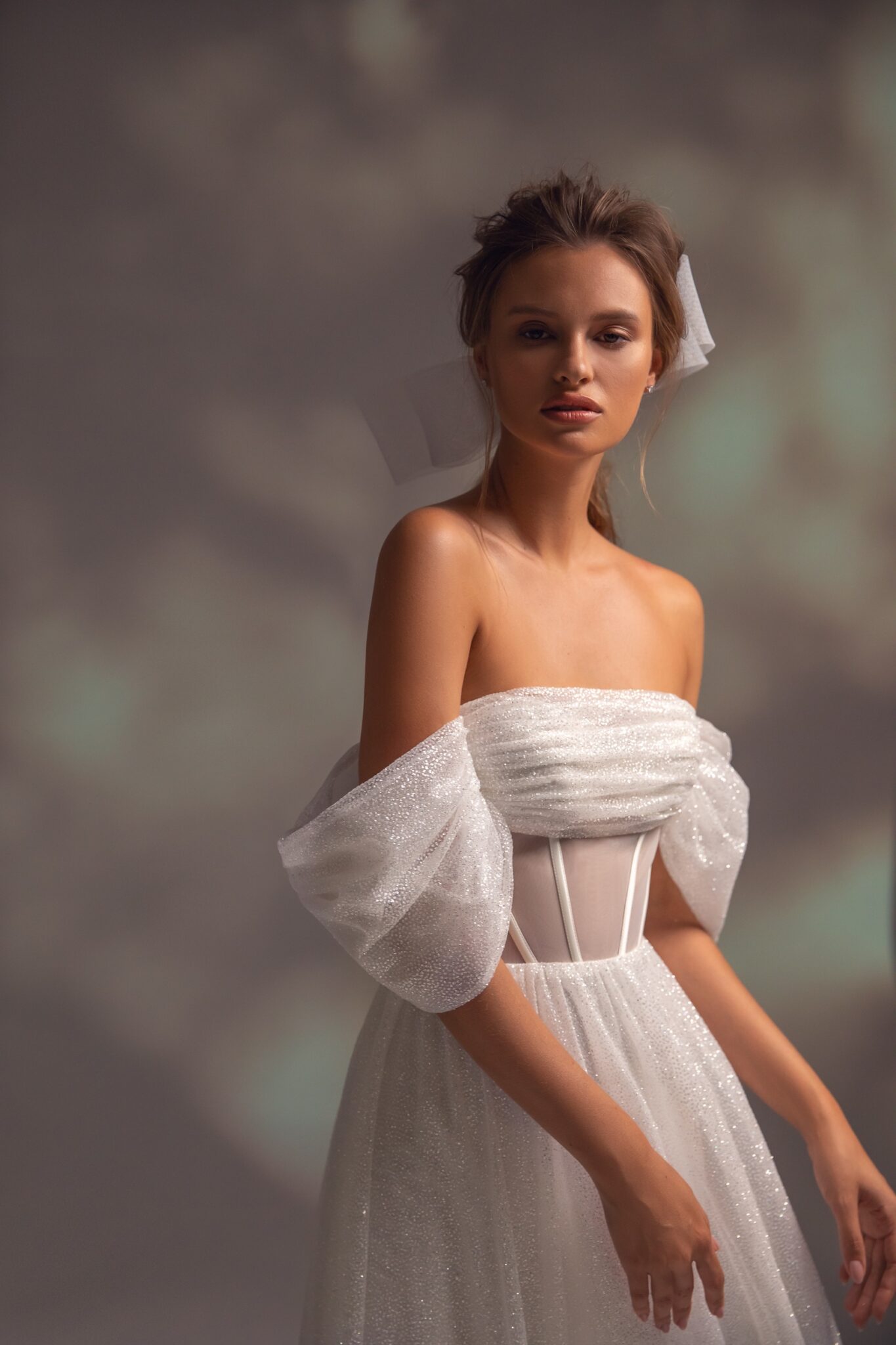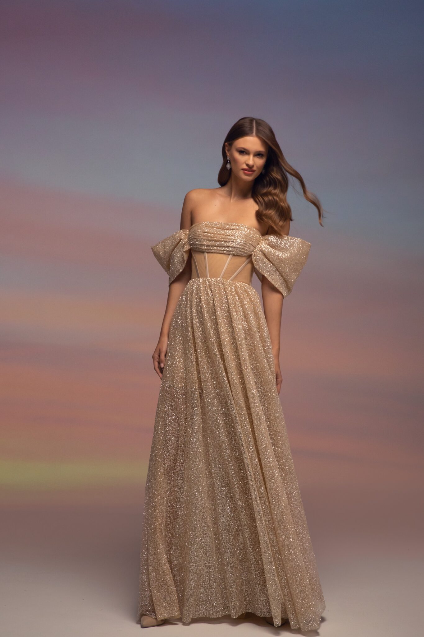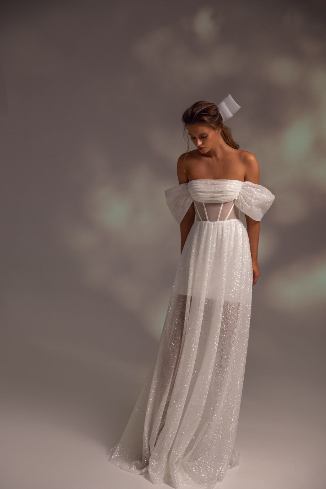 Приголомшлива весільна сукня з блискучої тканини, доступна в кольорах слонової кістки та беж. Корсет без бретелей прикрашений вирізом-човником з драпіруванням і красивими вільними рукавами з відкритими плечима. Топ прикрашений кісточками та сітчастими вставками. Красива блискуча спідниця виготовлена з такого ж блискучого матеріалу. Спідниця має прямий крій і не переходить у шлейф.