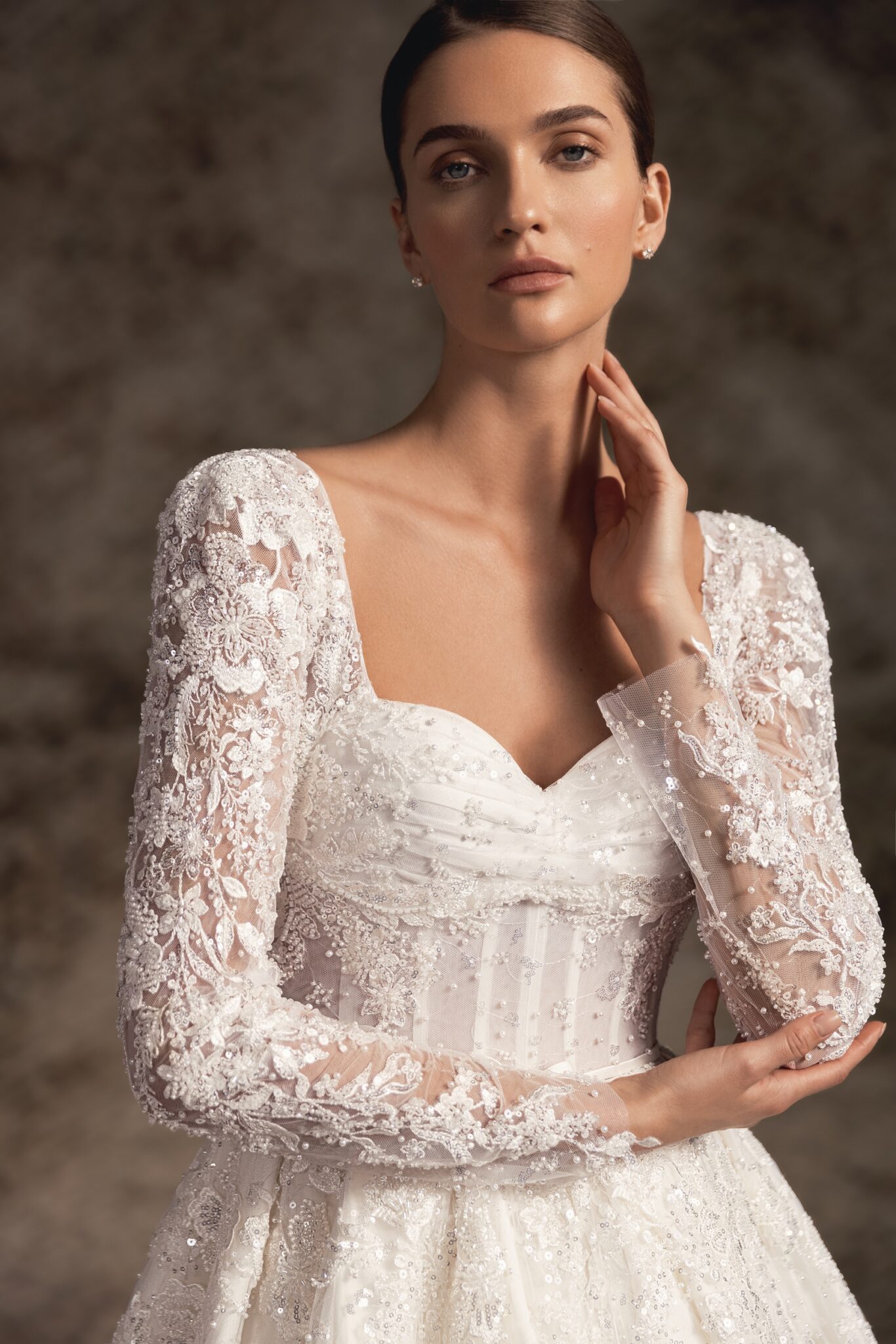 Весільна сукня, виконана з вишиваного мережива, має прозорий квадратний виріз на грудях і довгі облягаючі рукава з вишивкою у вигляді татуювання. Об’ємна спідниця прикрашена мініатюрними квітковими вишивками з бісером і паєтками, які м’яко спадають до розкішного шлейфу довжиною до кафедрального.