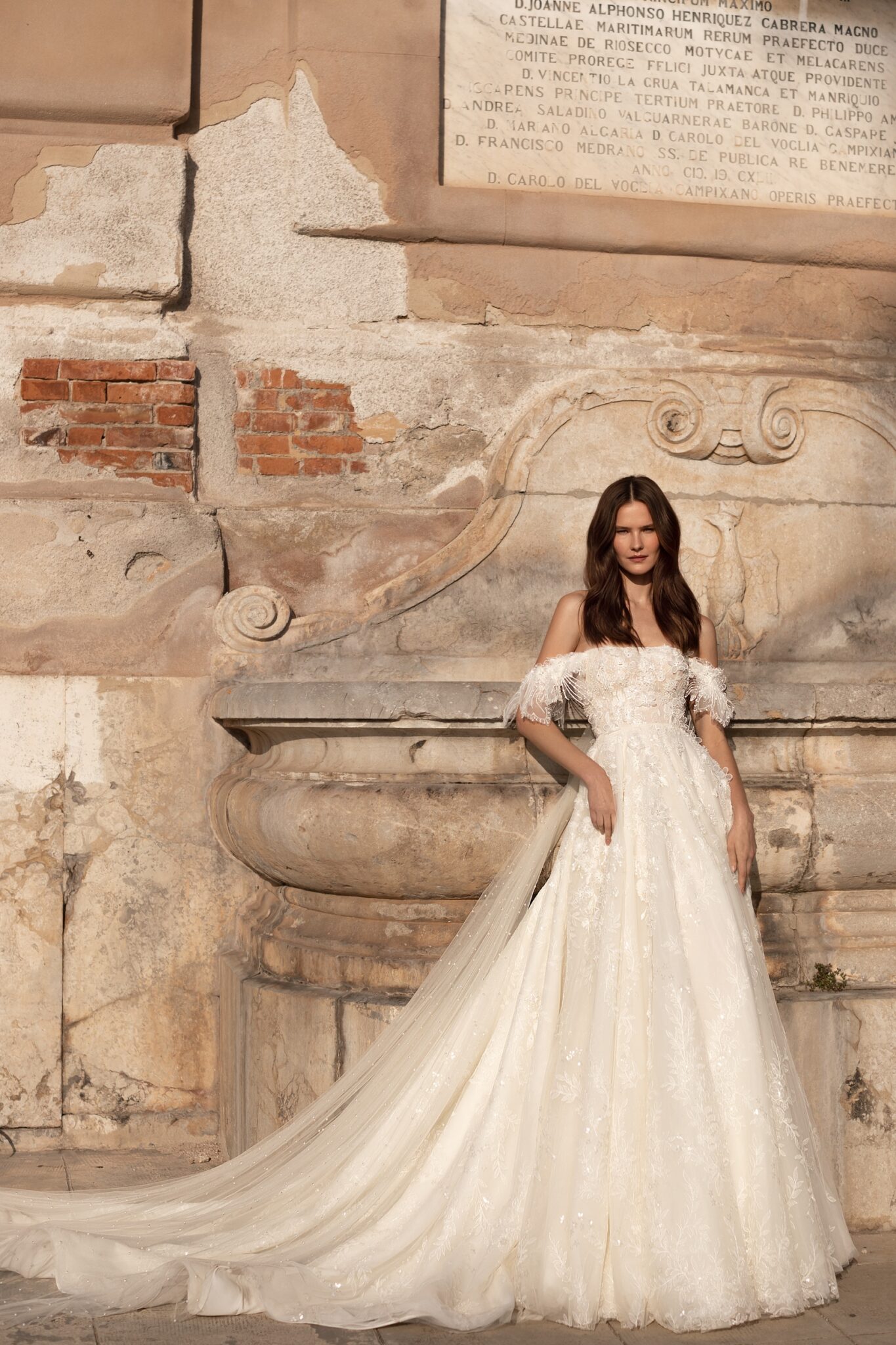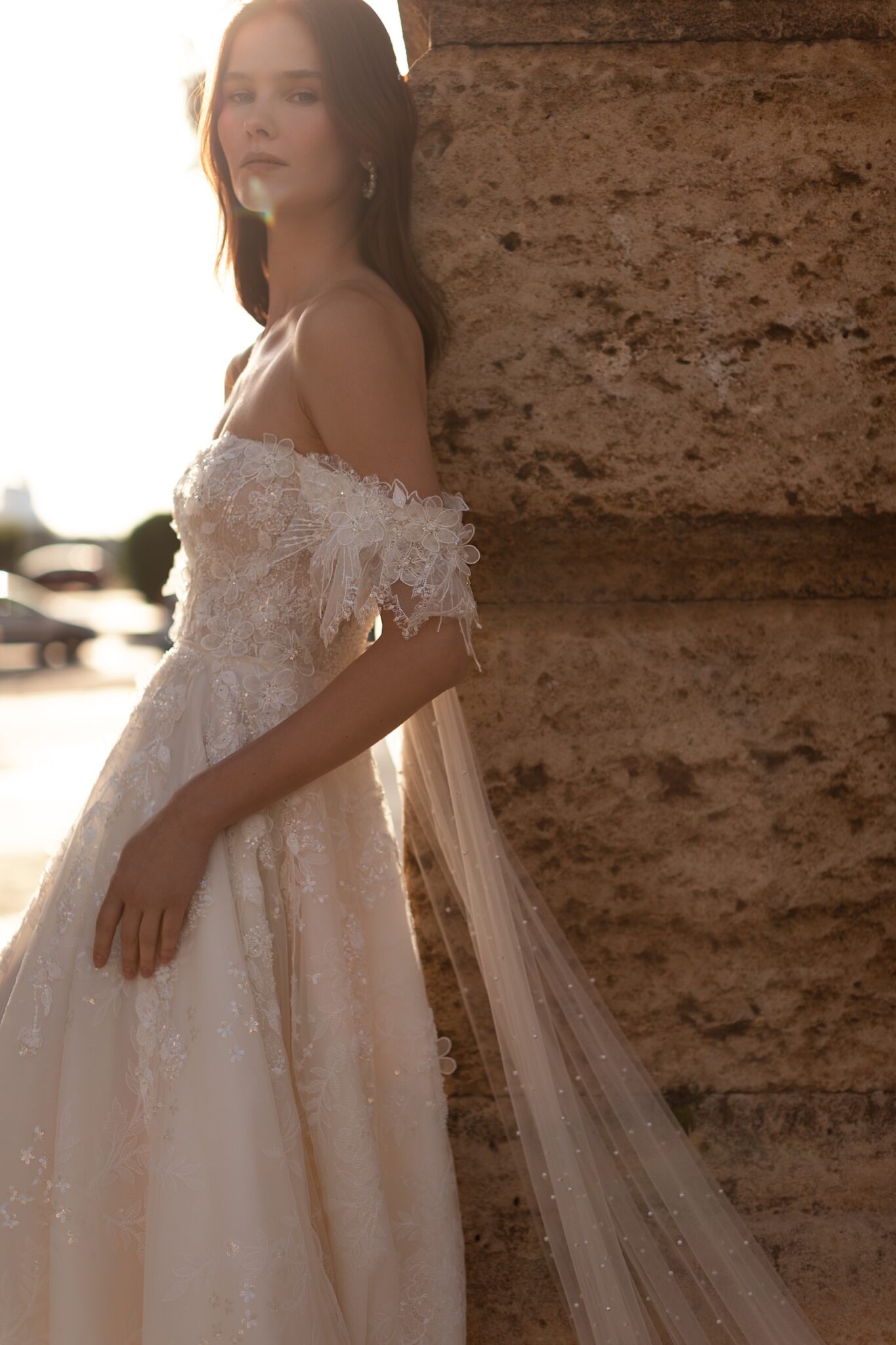 Чарівні 3D квіти розквітають по всій цій весняній весільній сукні в стилі A-line з м’якої мереживної тканини, створюючи образ, що є так само ефірним, як і елегантним. Верх цієї сукні представляє собою безтрішкий корсет з прямим підірізаним вирізом, який доповнюють ніжні прозорі рукавиці з великими 3D квітами. Він переходить у романтичну спідницю з катедральним шлейфом, а також дуже жіночу напівпрозору накидку, прикрашену перлинами.