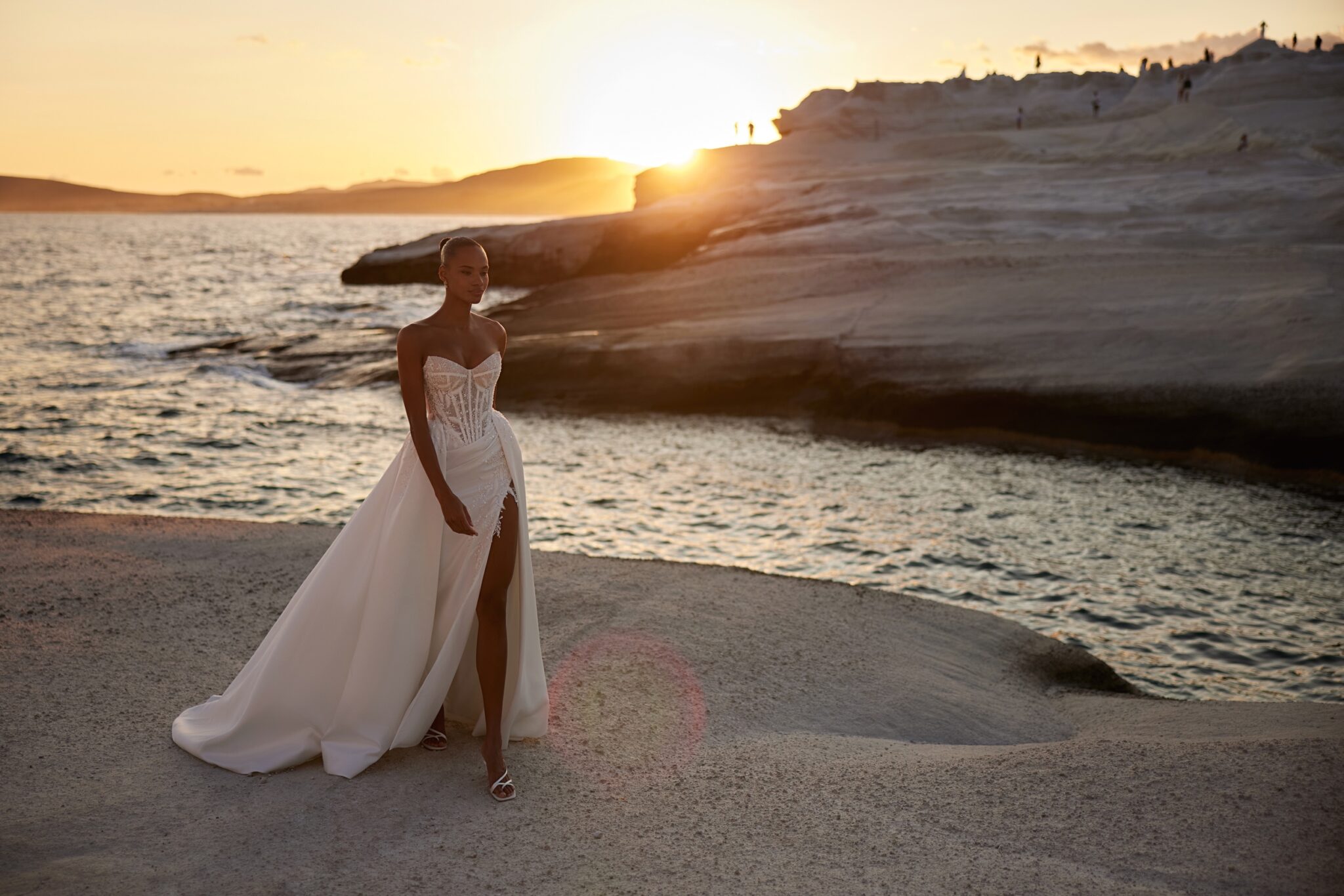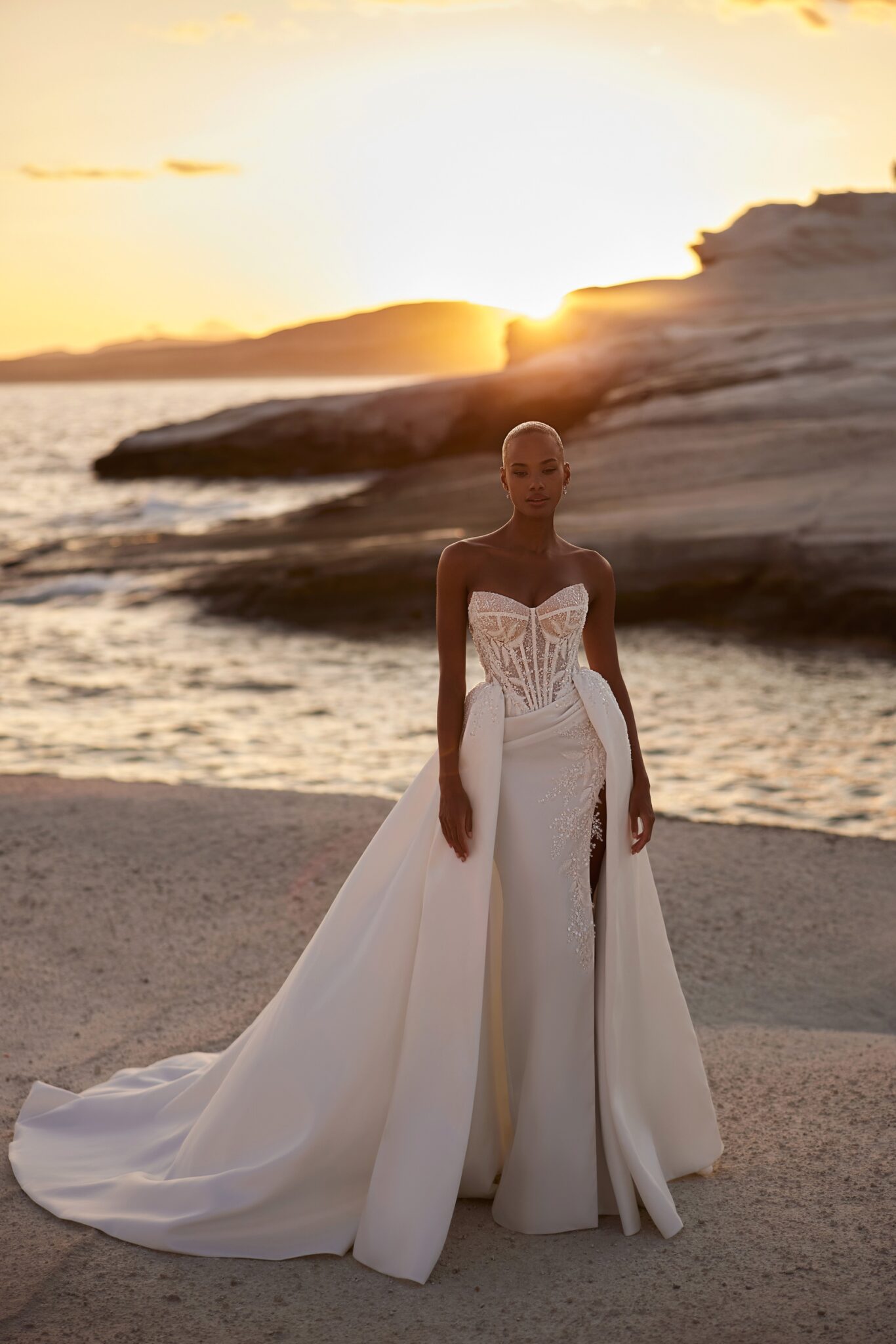 Вишукана корсетна сукня з симетричним орнаментом та вишитим бісером верхом. Смілива спідниця має м’які драпірування по лінії талії та розріз на всю довжину зліва. Верхній край розрізу делікатно вишитий бісером, а шлейф, прикріплений ззаду, відображає більш класичний дизайн.