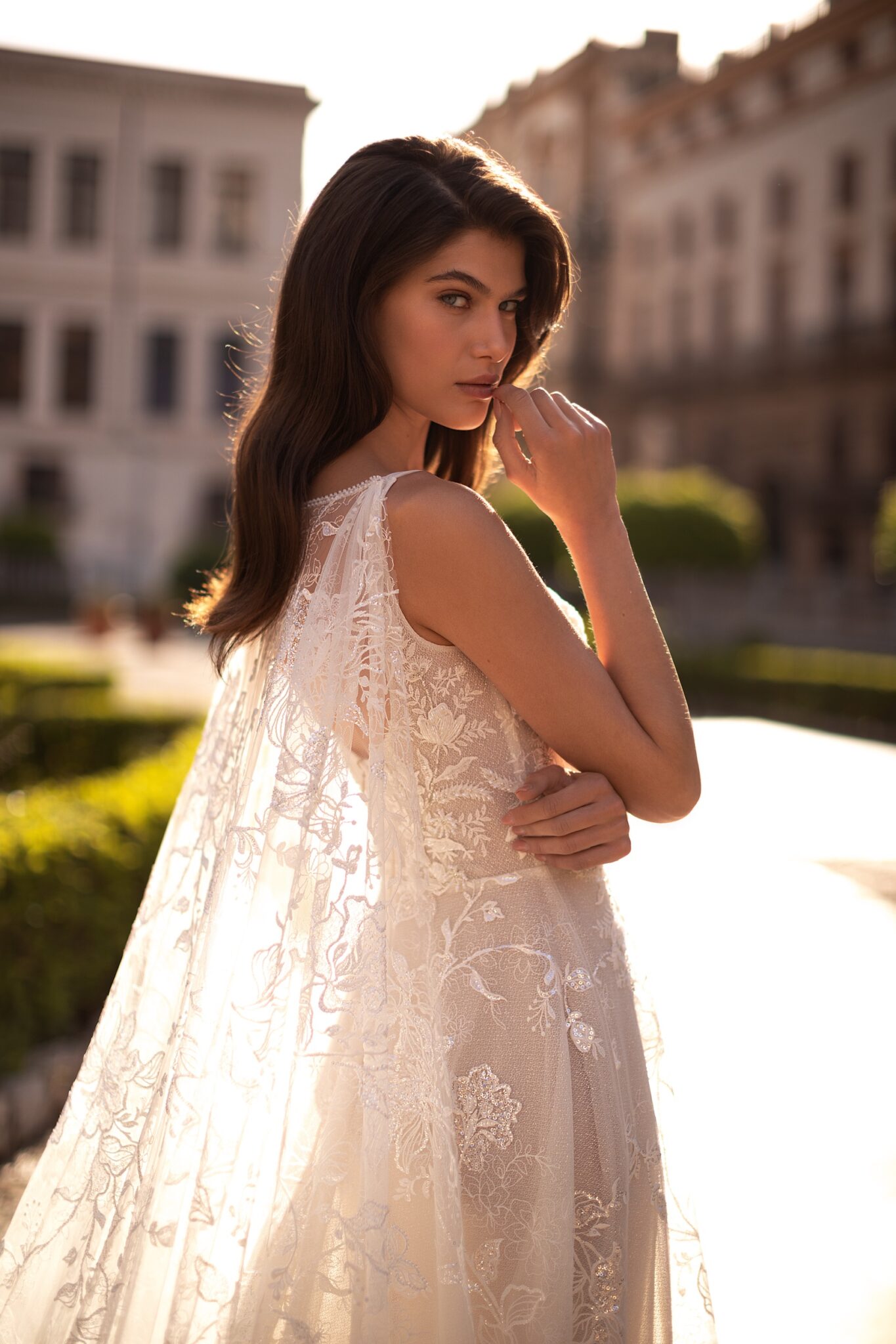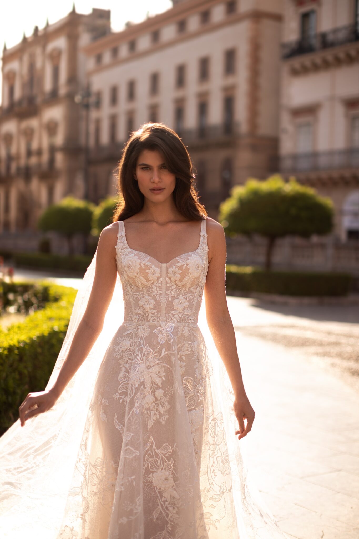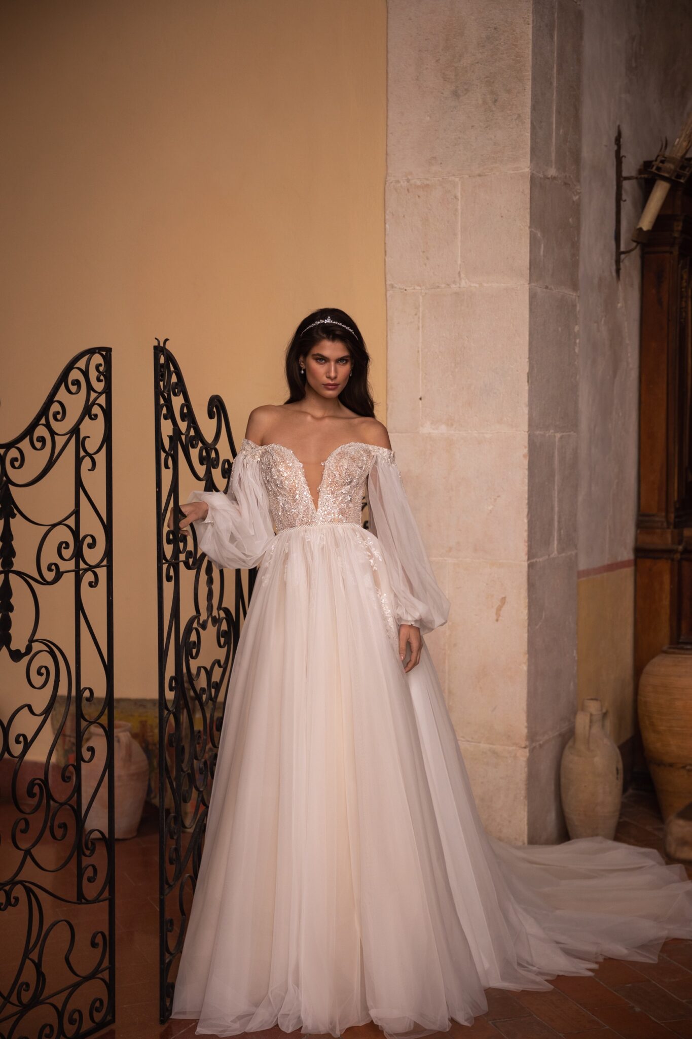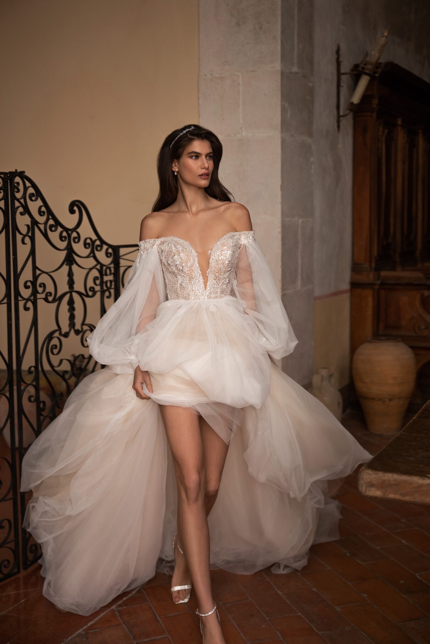Чарівна та спокуслива водночас – ця корсетна сукня А-силуету прикрашена вишивкою та блискучими сріблястими блискітками. Корсет має витончене декольте у вигляді серця на широких брителях та доповнює об’ємну напівпрозору спідницю А-силуету з квітковими аплікаціями, прикрашеними ніжним сріблястим бісером. Справжня родзинка ховається в чудовій напівілюзорній накидці, яка прикріплена на плечах, створюючи фантастичний довгий шлейф.
