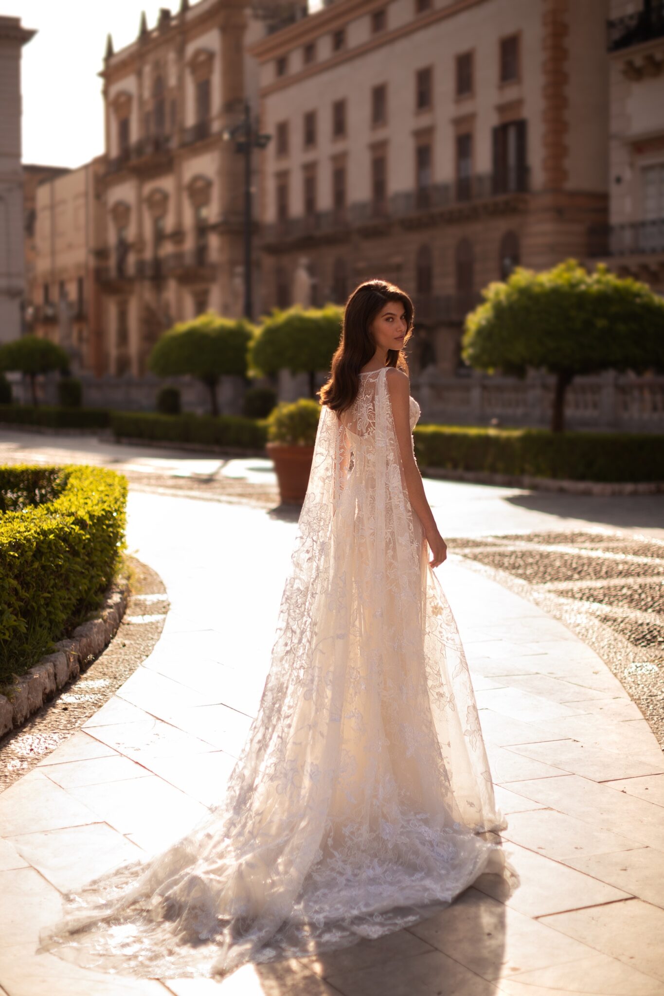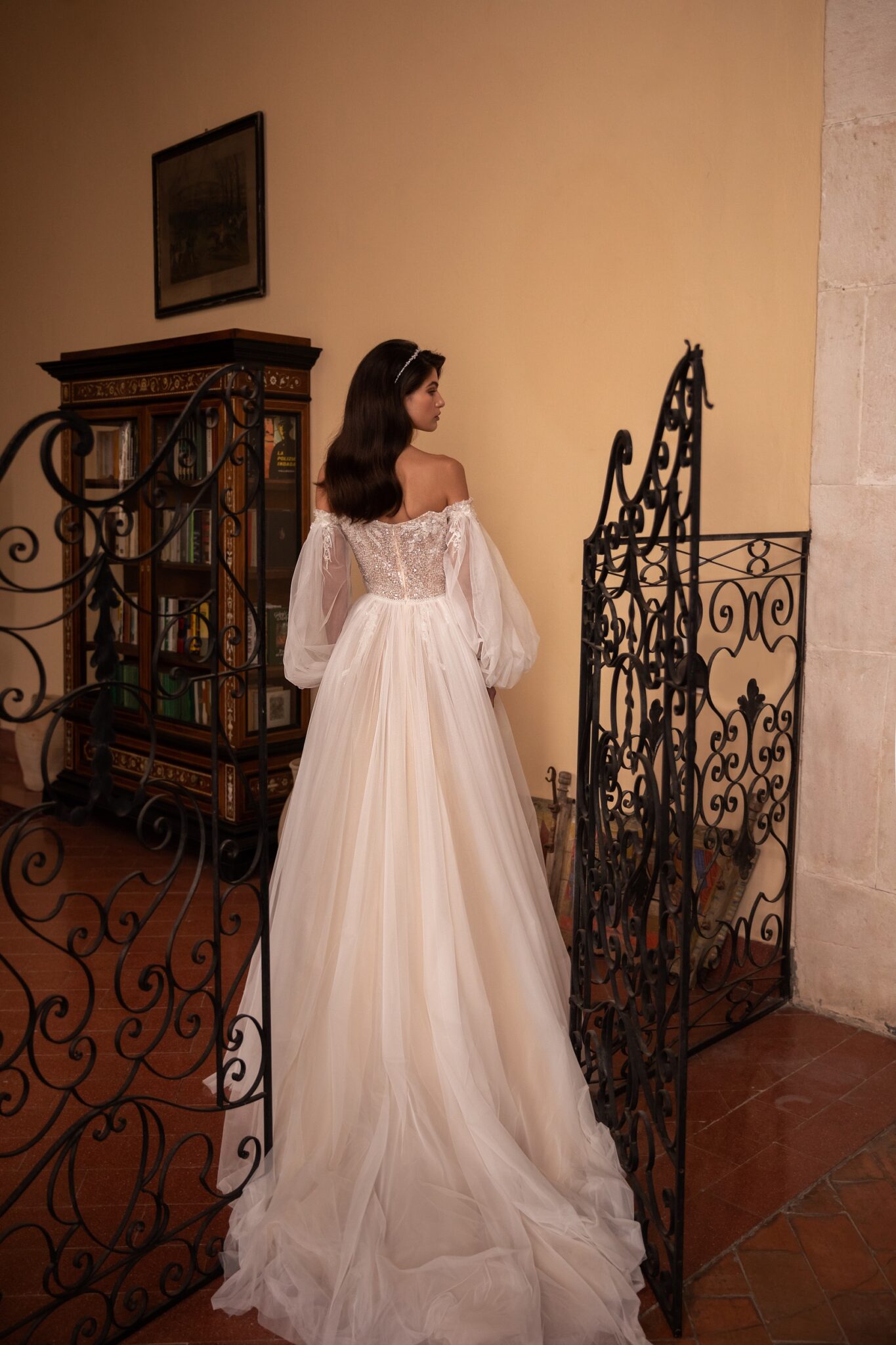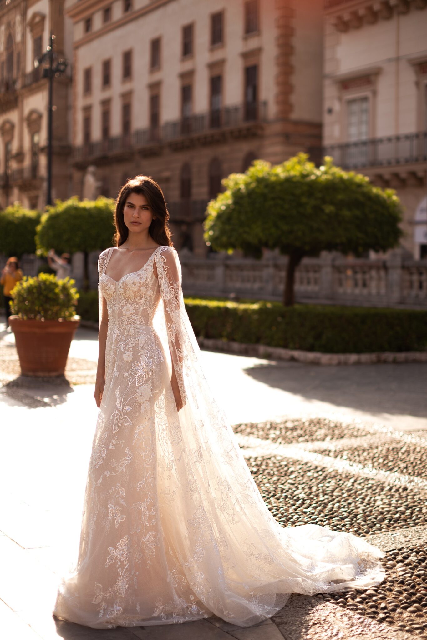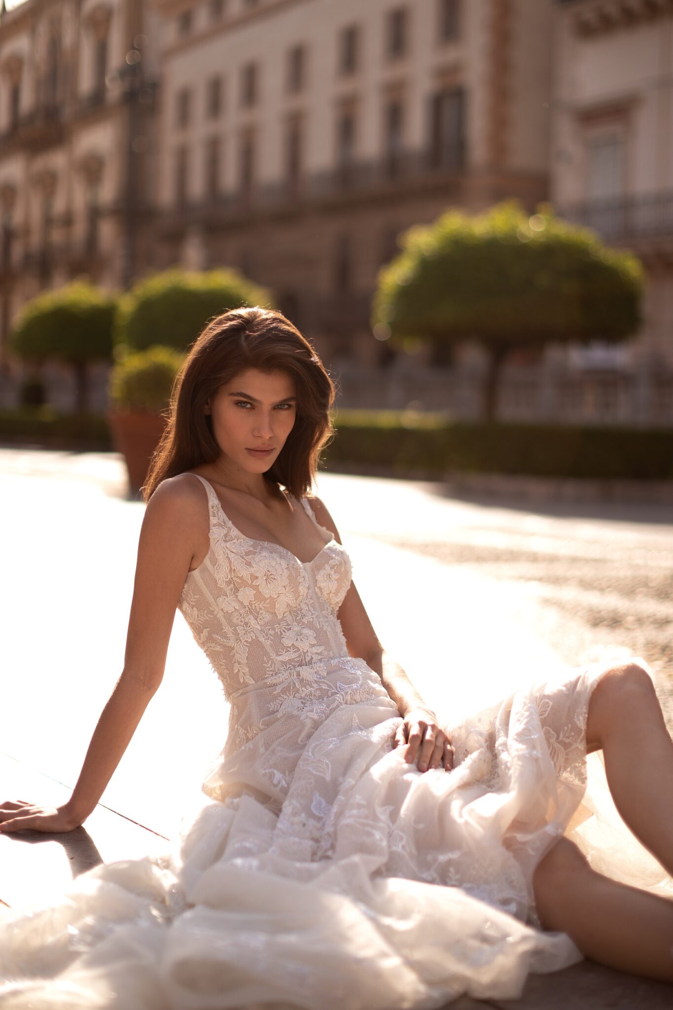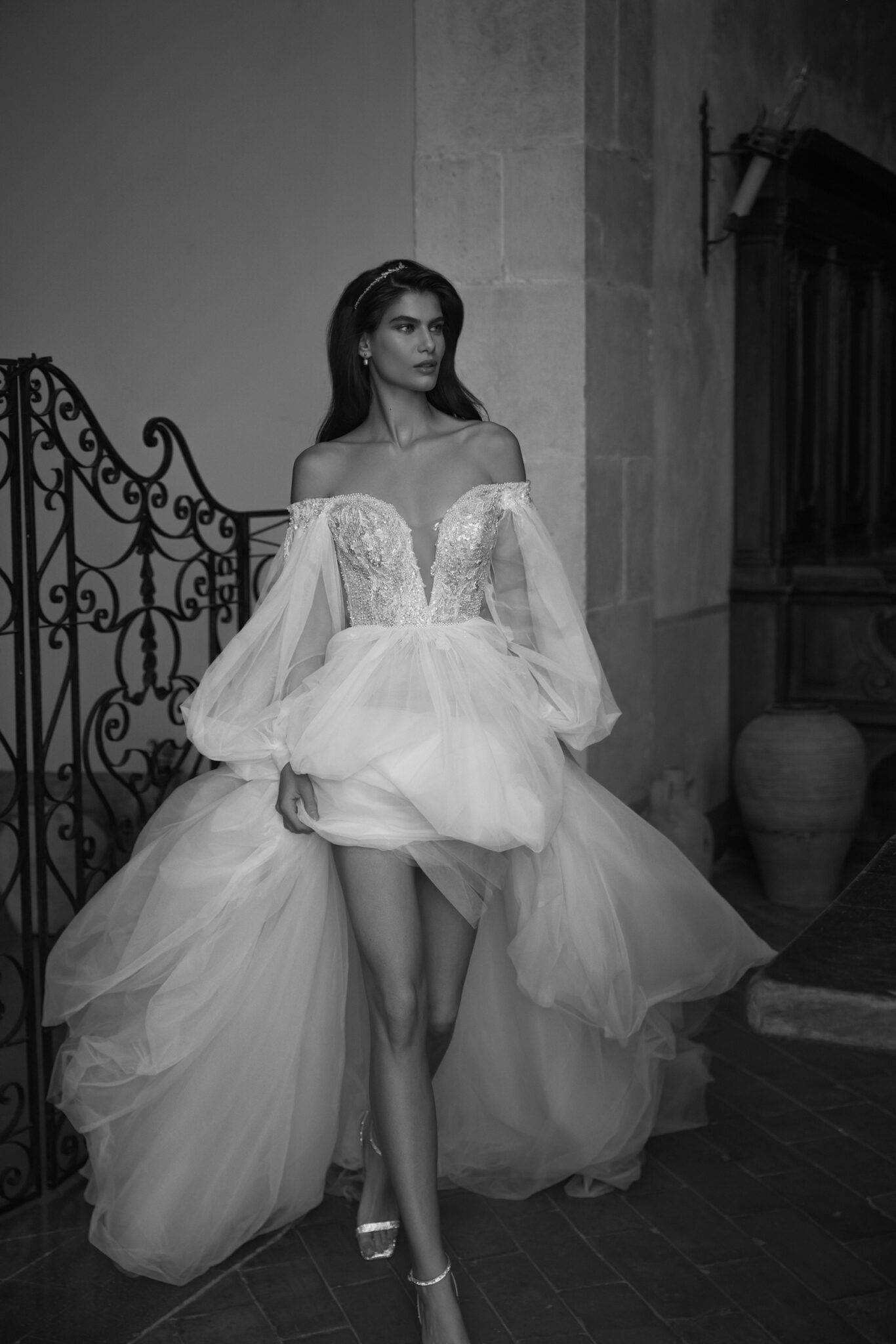 Чарівна та спокуслива водночас – ця корсетна сукня А-силуету прикрашена вишивкою та блискучими сріблястими блискітками. Корсет має витончене декольте у вигляді серця на широких брителях та доповнює об’ємну напівпрозору спідницю А-силуету з квітковими аплікаціями, прикрашеними ніжним сріблястим бісером. Справжня родзинка ховається в чудовій напівілюзорній накидці, яка прикріплена на плечах, створюючи фантастичний довгий шлейф.