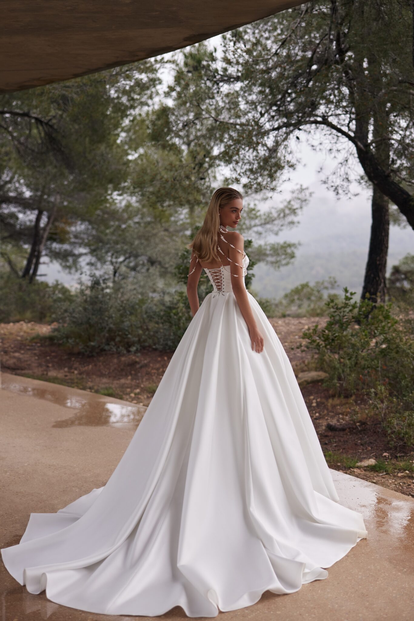 Сукня “Долина” виконана з тканини мікадо. Гладка деталізована корсетна основа мінімалістичної весільної сукні з вирізом у формі серця, ніжні перлини прикрашають лінію талії, підкреслюючи витончений силует сукні. Спідниця подовжена простим шлейфом середньої довжини. Сукня доповнена прикрасою з перлів ручної роботи, яка елегантно спадає на плечі, додаючи образу вишуканості та витонченості.