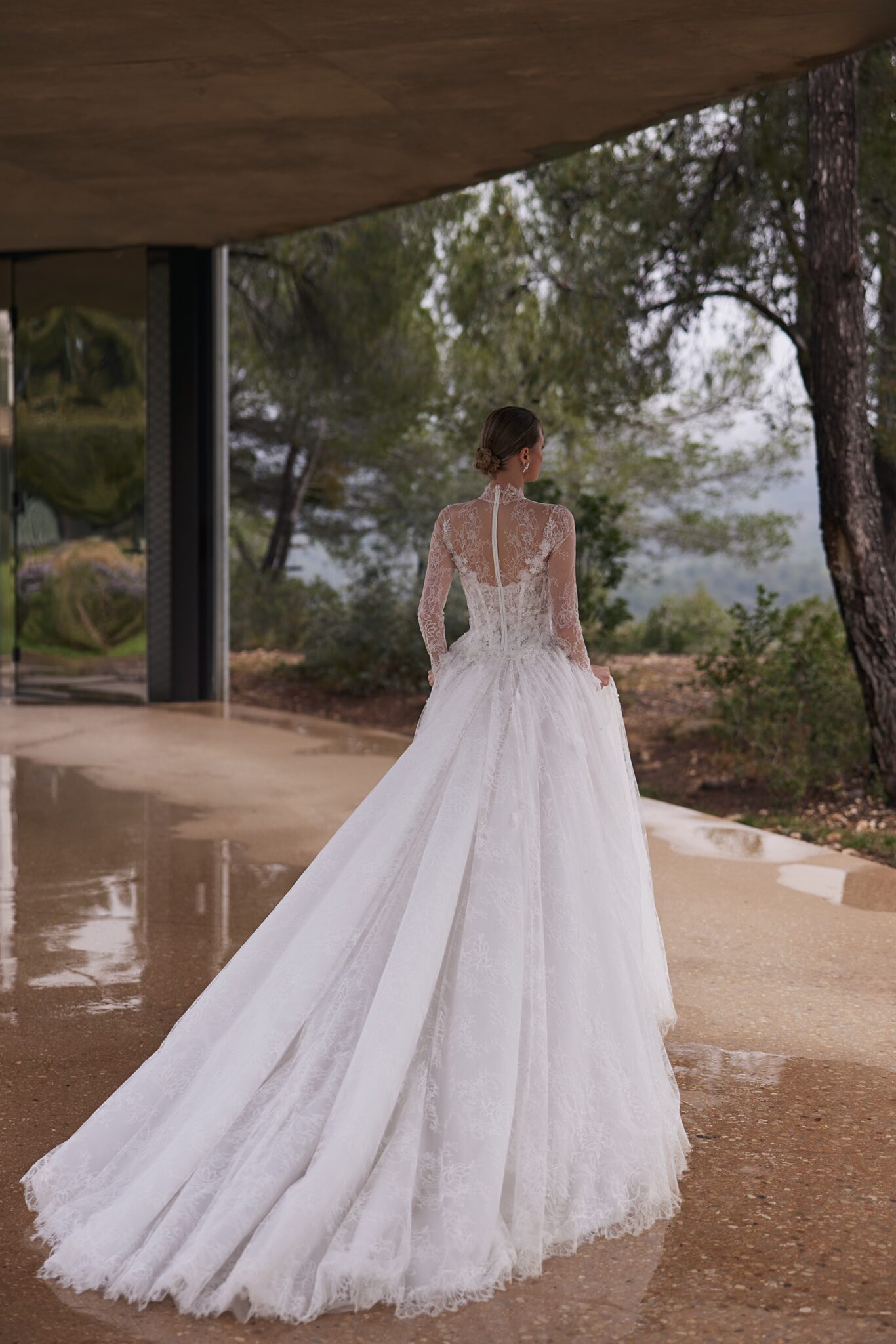 Довгі прозорі рукави, оздоблені витонченими мереживними деталями, створюють атмосферу елегантності та витонченості, водночас надаючи нотку скромності.