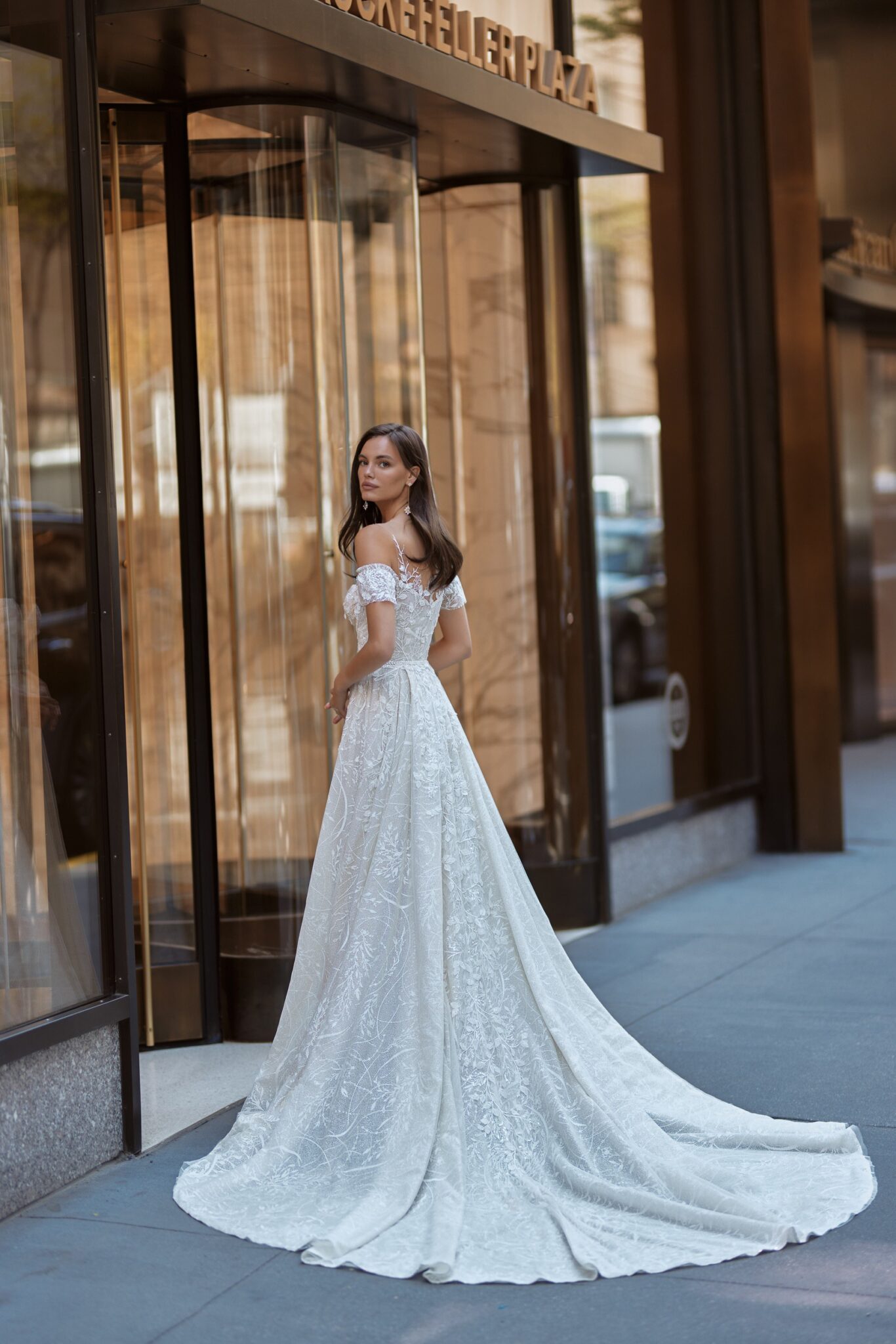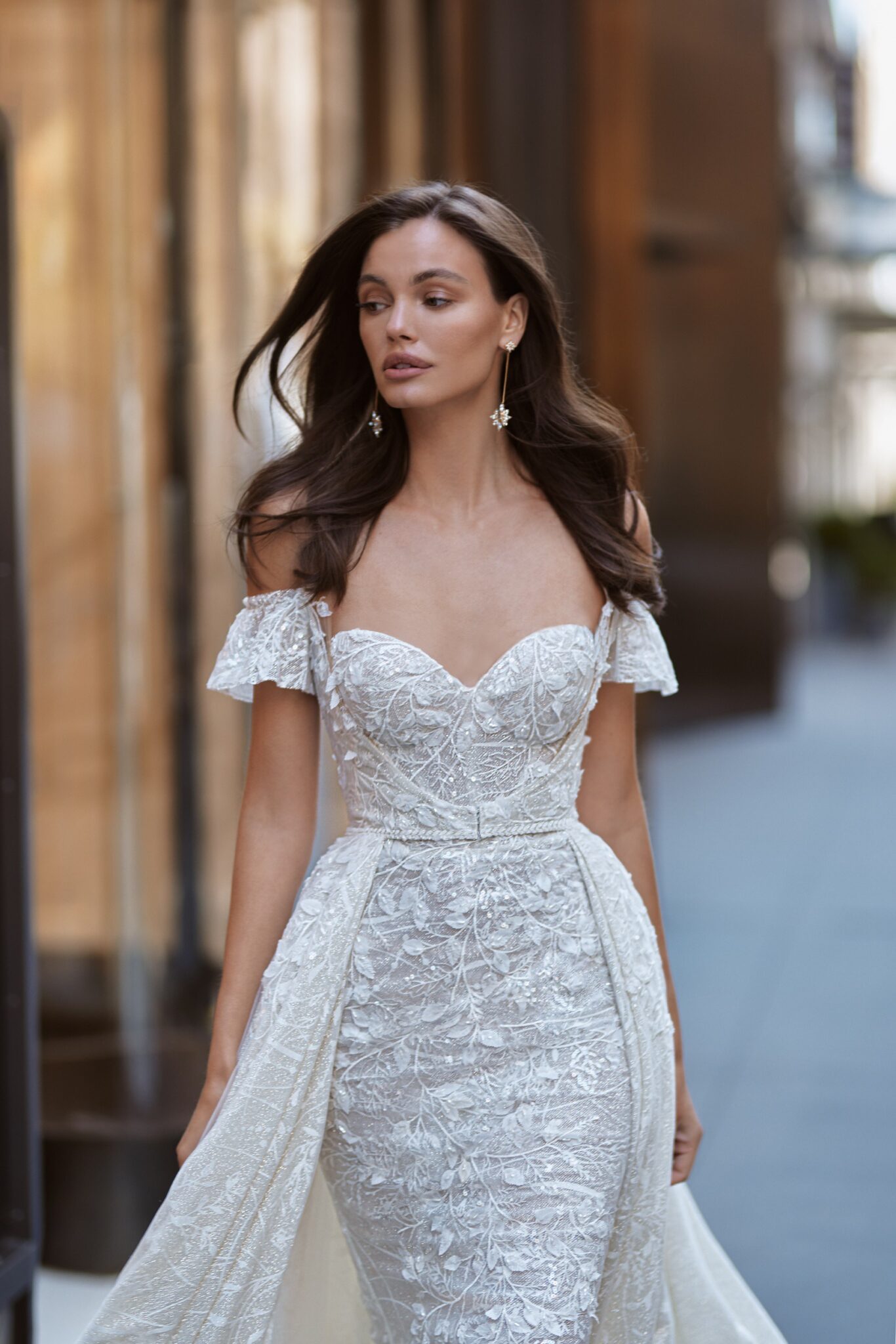 Це блискуче та сяюче вбрання зі спущеними плечима, прикрашене тривимірним мереживом. Сукня виготовлена з ніжного мережива. Корсет без бретелей прикрашений квітковим мереживом. Розкішний накидка має спущені короткі рукава і пишний додатковий спідницю з довгим шлейфом, що надає жіночності цьому весільному образу.