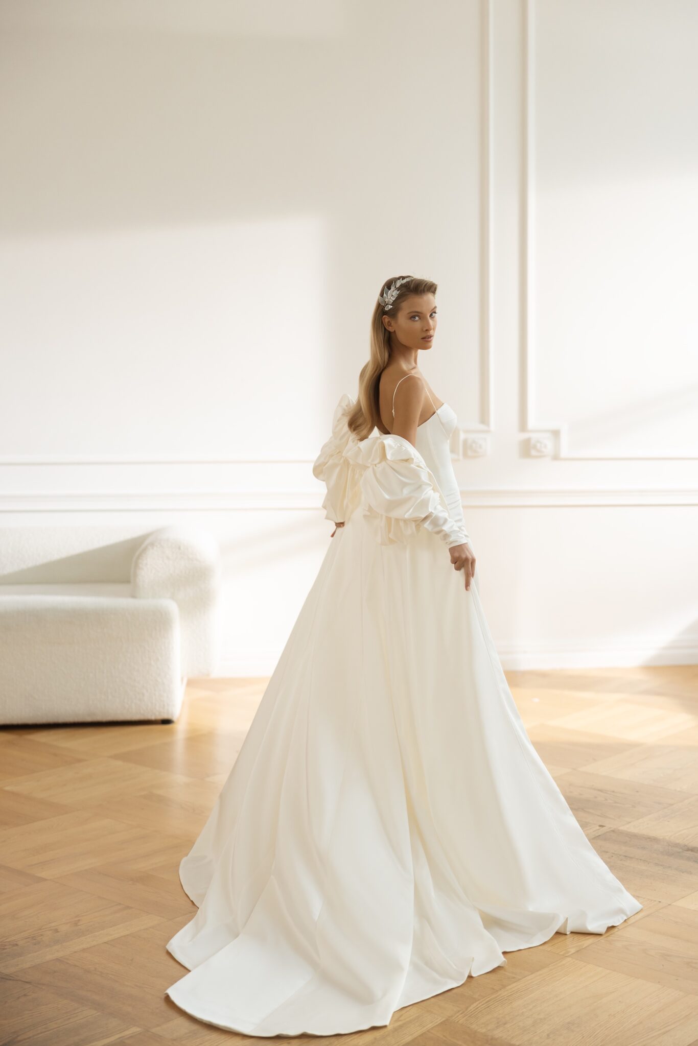 Для наречених, які закохані у мінімалізм, ця сукня стане ідеальною. Wren — це приталена сукня-футляр, виготовлена з гладкого атласу, яка випромінює елегантність. Витончено підкреслена талія та класичний косет створюють приємний виріз у формі серця з тонкими брителями, що ковзають спереду через плече до відкритої спини. Накидка Wren прикрашена об’ємними рукавами з ґудзиками та бантами на плечах, а також рядом елегантних рюш навколо шиї. Завершує образ приголомшливий довгий шлейф