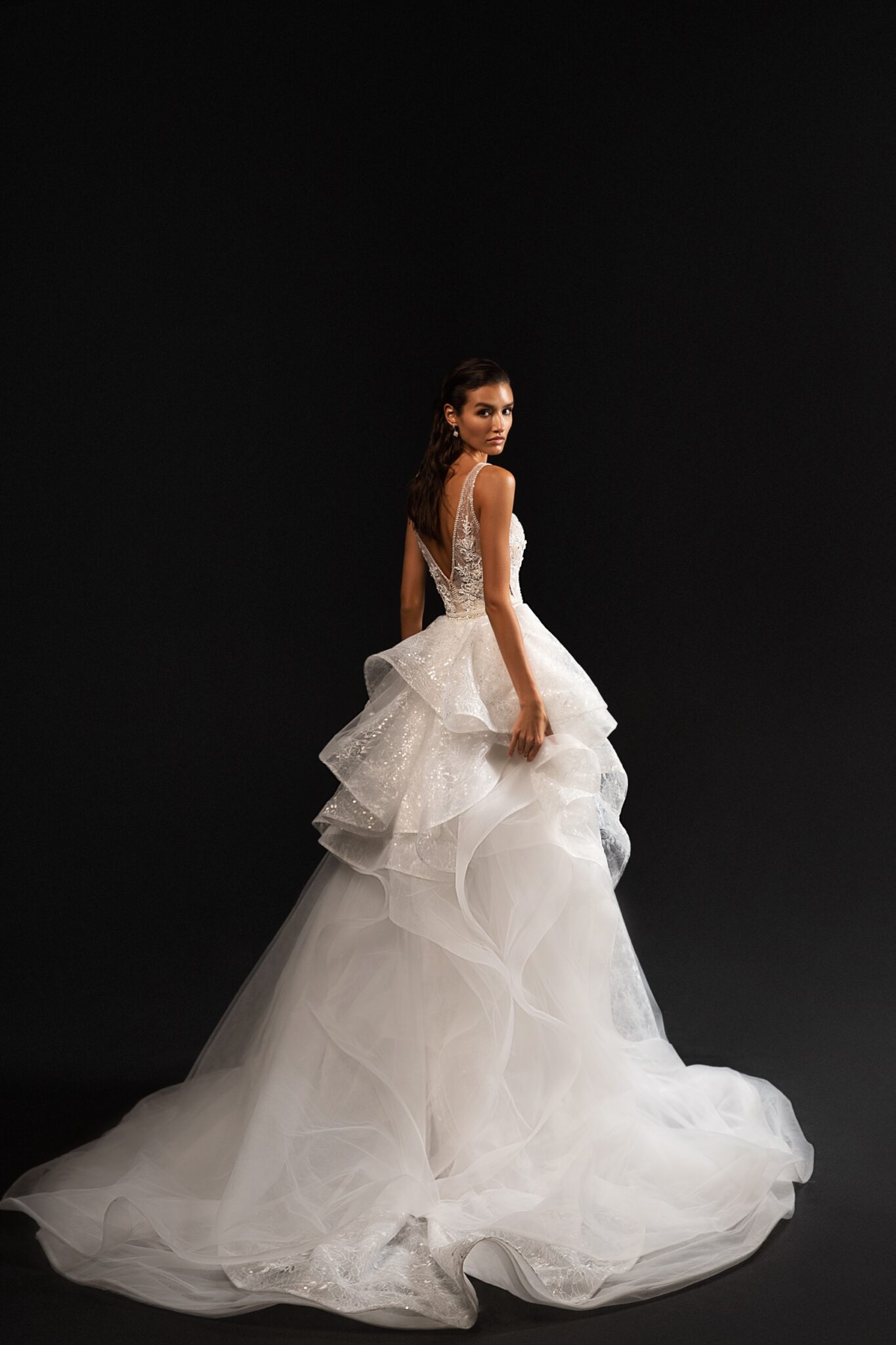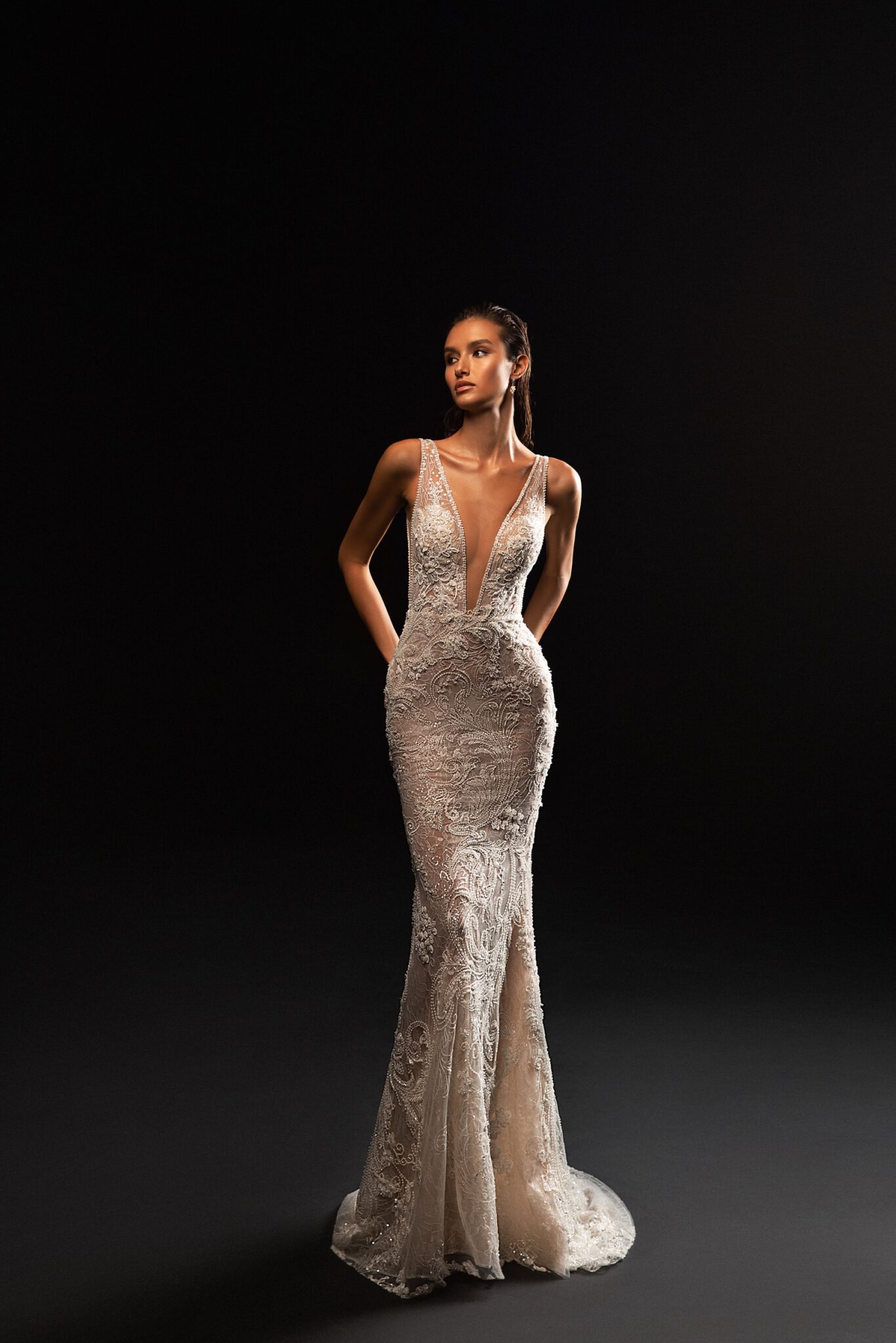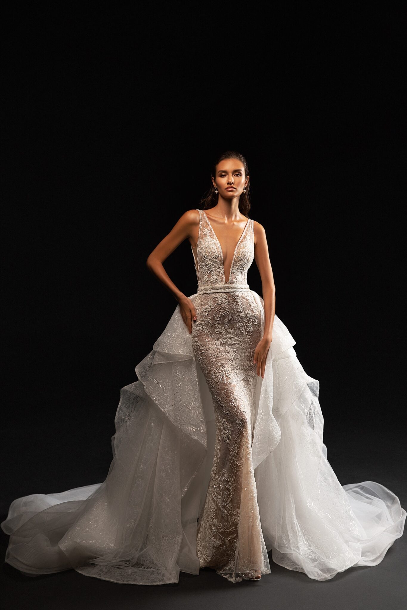 Ніжна та тендітна весільна сукня з глибоким V-подібним вирізом. Весільна сукня, що створює справжні жіночі контури. Вузько-прилегла сукня підкреслює фігуру нареченої. Розкішна спідниця, яка переходить у шлейф, робить її ще більш чарівною.