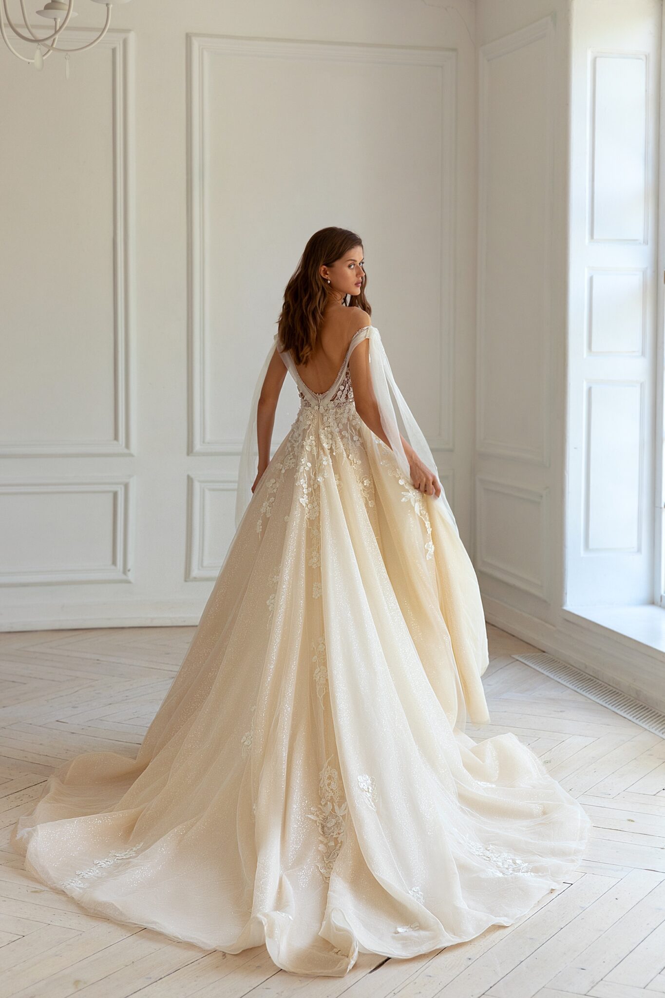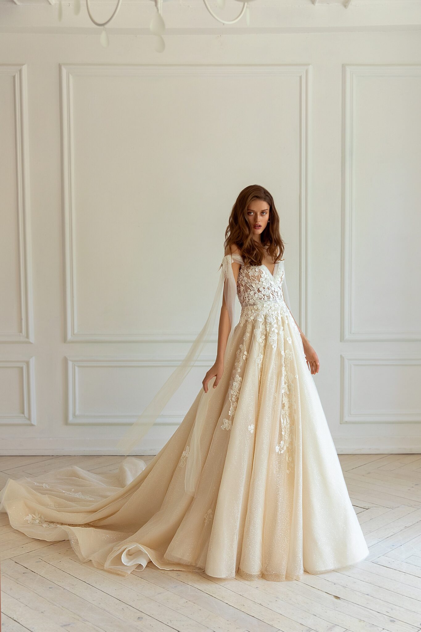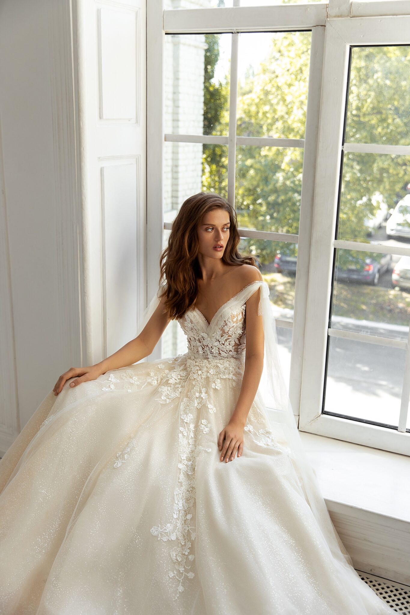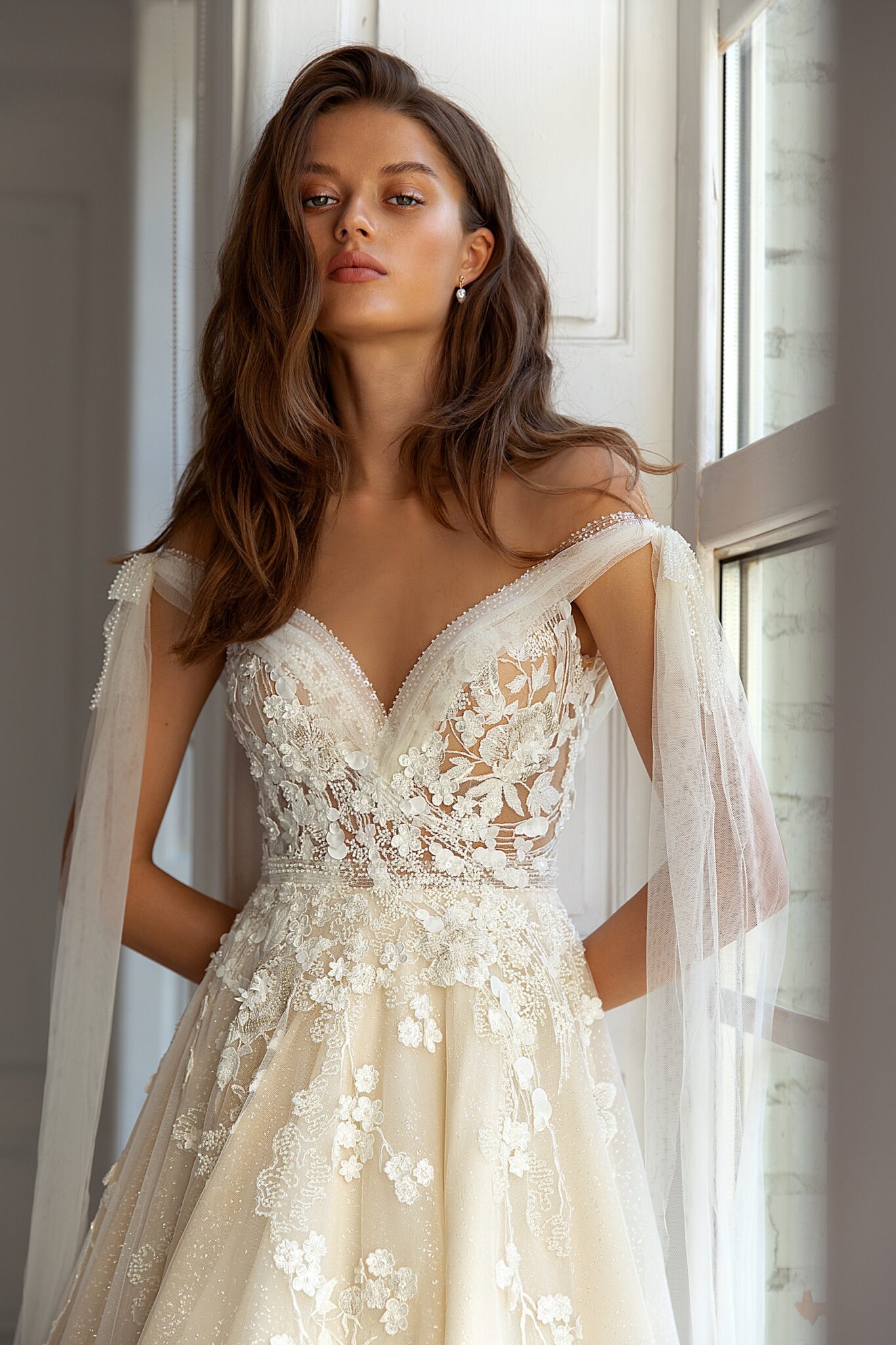 У весільній сукні Yuna ви почуватиметеся як принцеса. Поєднання тканин та силуету “А-силует” виглядають чудесно. Корсет та глибокий виріз прикрашені мереживними мотивами. Той самий візерунок знаходиться на спідниці, виготовленій з вуалі. Великий виріз та вуальні рукава доповнюють весільну сукню.