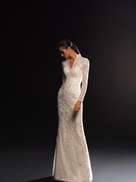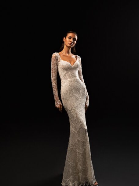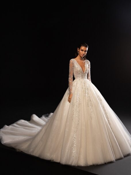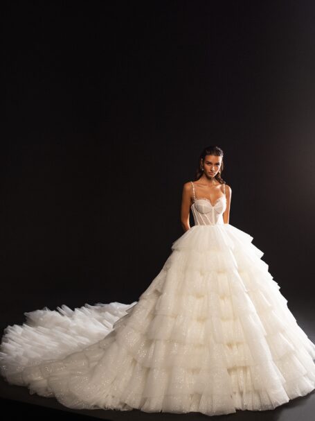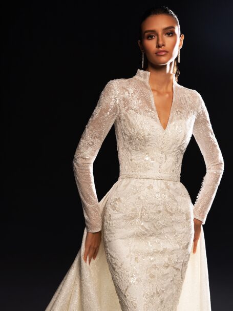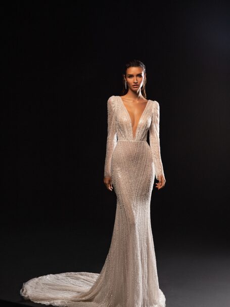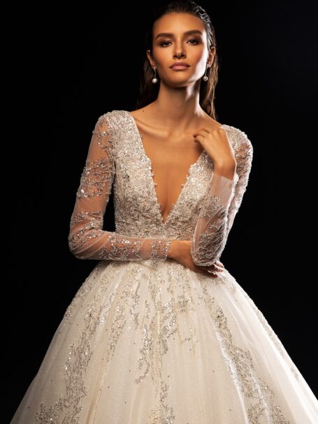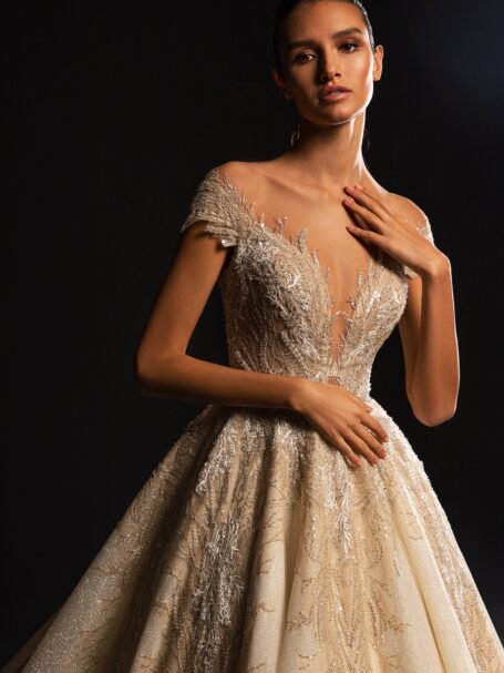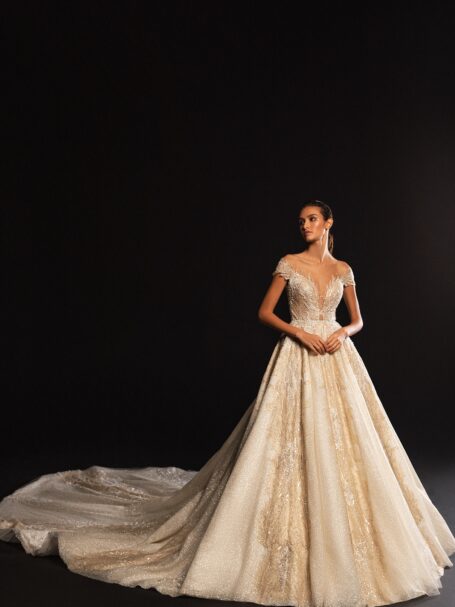 Вишукана весільна сукня із блискучим дизайном. Фантастичний спідниця переходить у довгий шлейф. Весільна сукня зроблена з розкішного мережива.