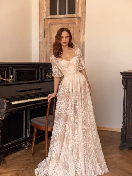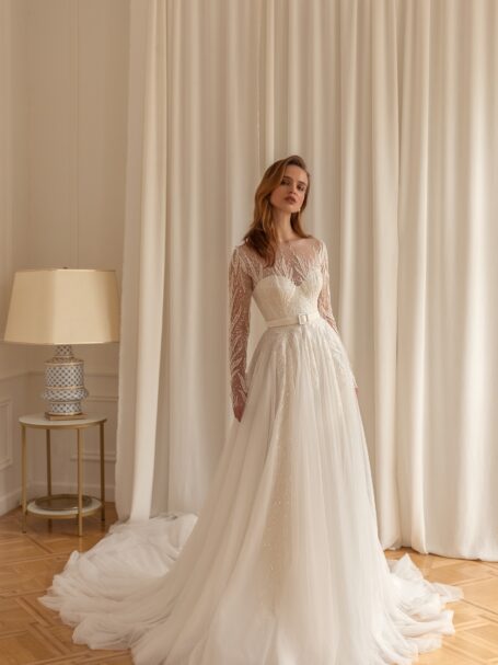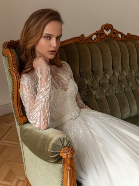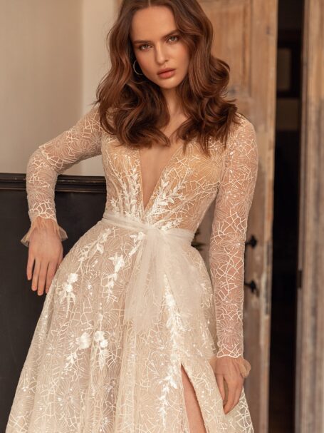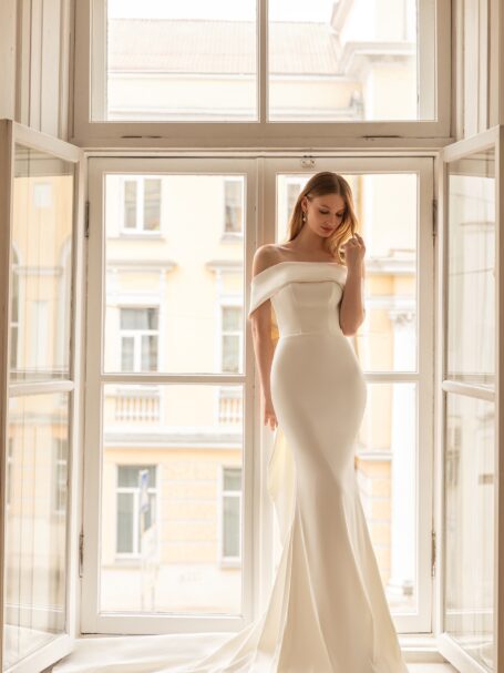 Robin — витончена та стильна весільна сукня. Декольте з опущеними плечима прикрашено фальбаною і м’якими складками, які переходять до спинки сукні і створюють декольте з відкритою спинкою. Корсет і зона талії прикрашені складками і драпіруванням. Стильна спідниця на запах з високим розрізом на одній нозі має прямий крій і невеликий шлейф.