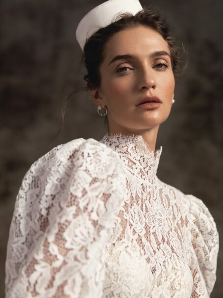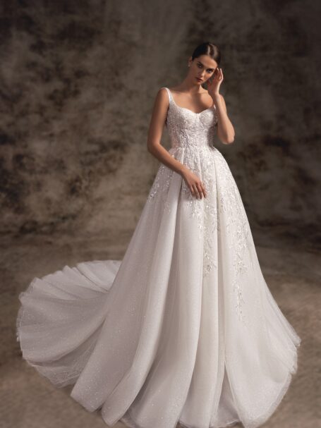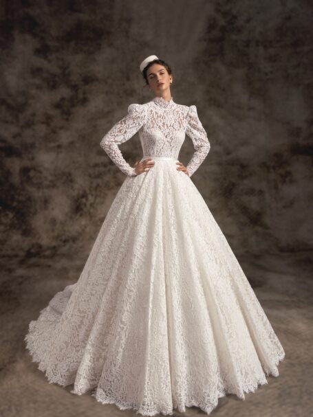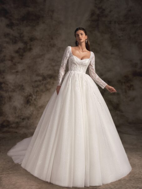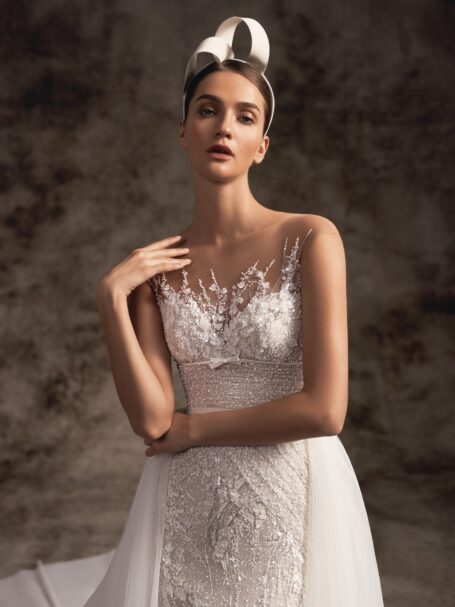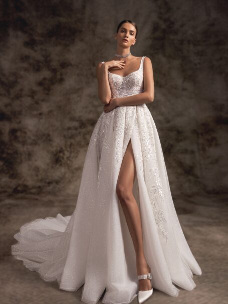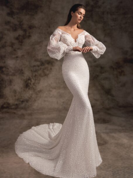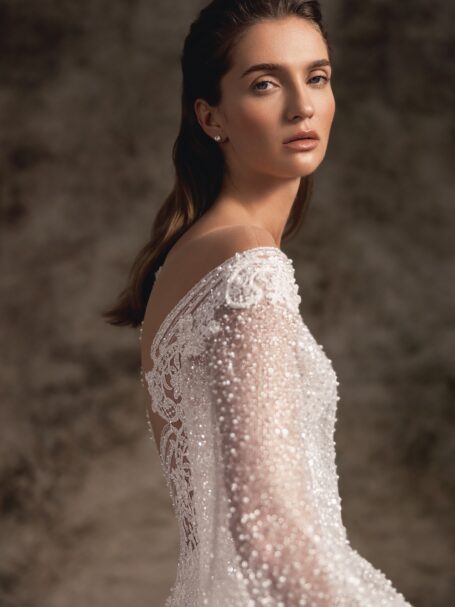 Чутлива силует-труба обвиває тіло вишуканим вишиваним мереживом, маючи приталені довгі рукава з міцними плечима, глибокий V-подібний виріз та відкритий нижній спин. Прилегла спідниця-труба з вирізами з тюлі має чудовий хапельний шлейф з ніжного Тюлю.