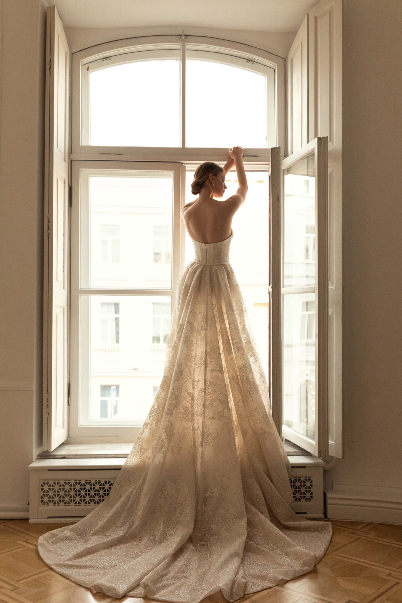 Свадебное платье Milena полностью изготовлено из блестящей ткани с легким рисунком нежного цвета слоновой кости. Корсет без бретелей имеет женственное декольте. Платье-футляр прямого кроя, облегает бедра и становится более свободным по силуэту. Отстегивающаяся юбка фиксируется на талии и имеет сказочный шлейф.
