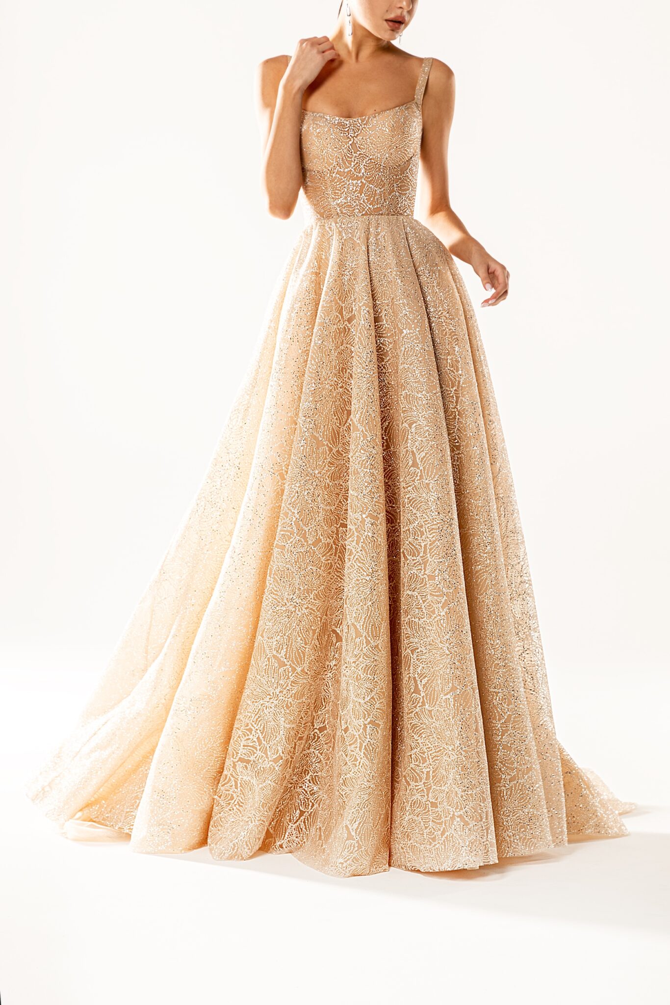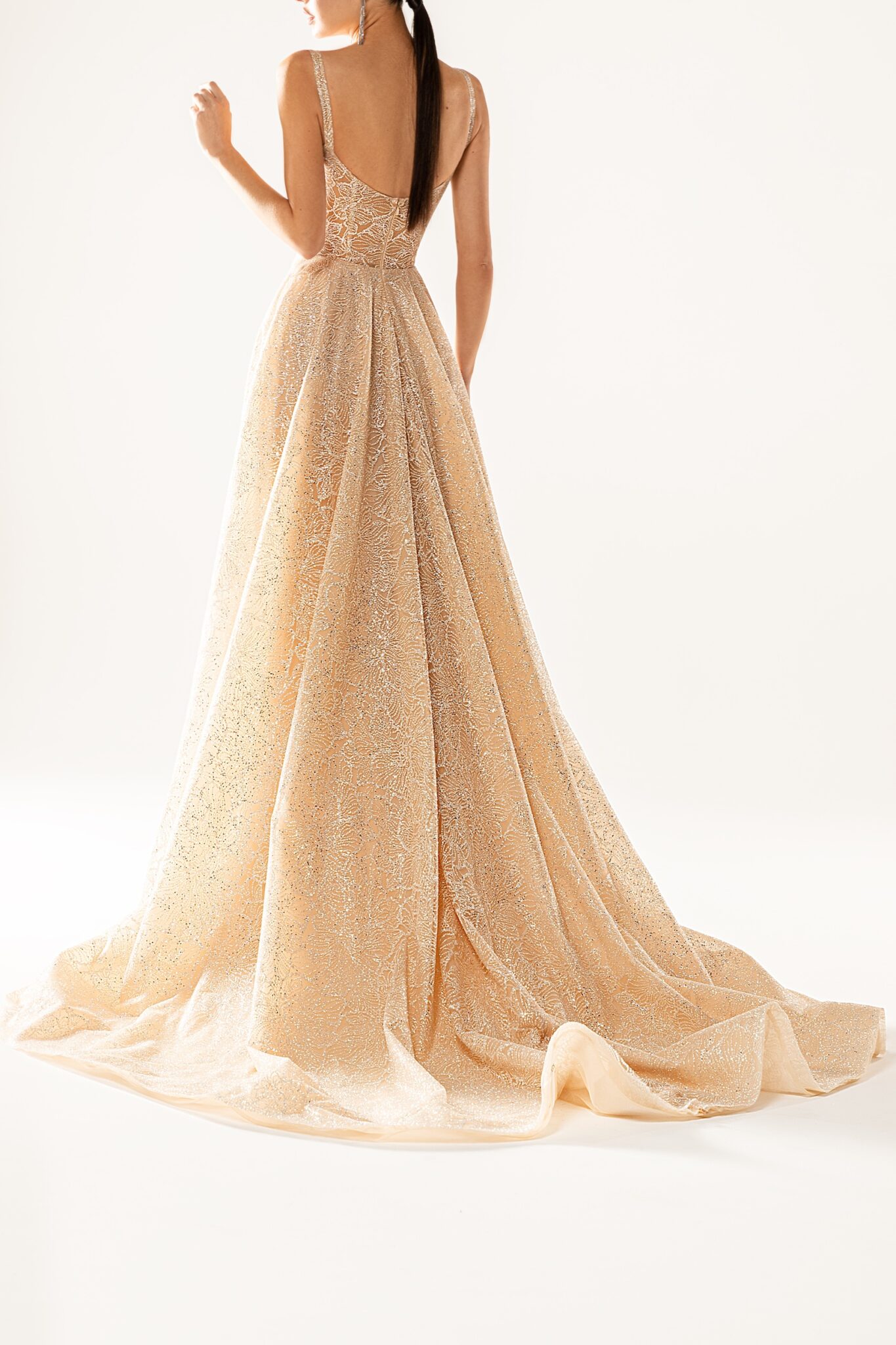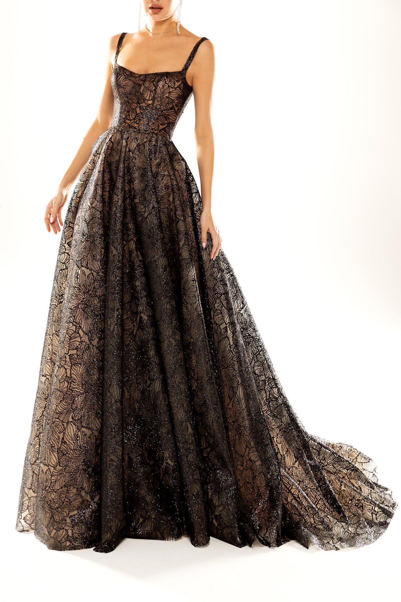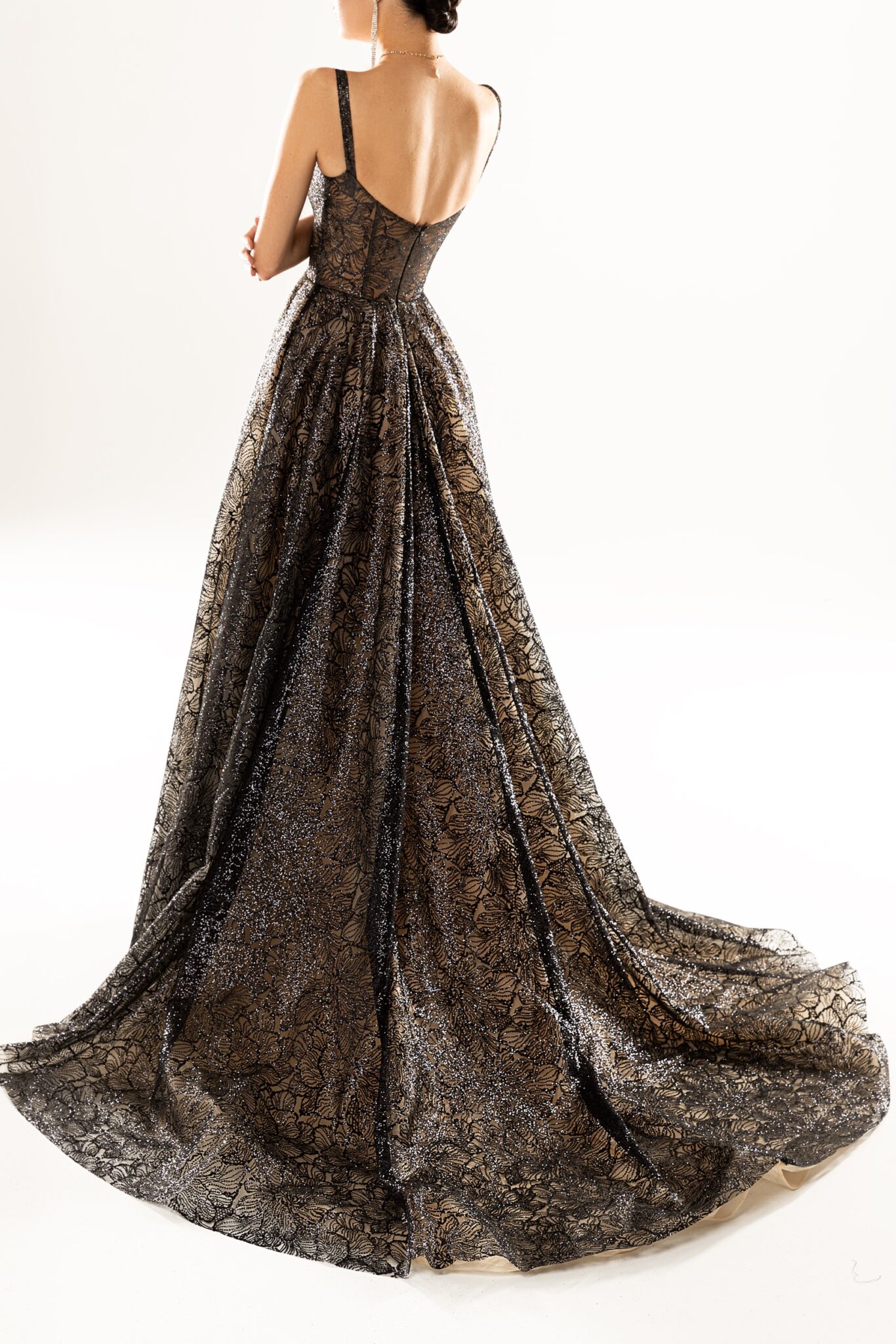 Спокусливий колір Black, Gold, розкішна тканина Sparkle та витончений A-line силует плаття 21118 робить його об’єктом бажань багатьох жінок.