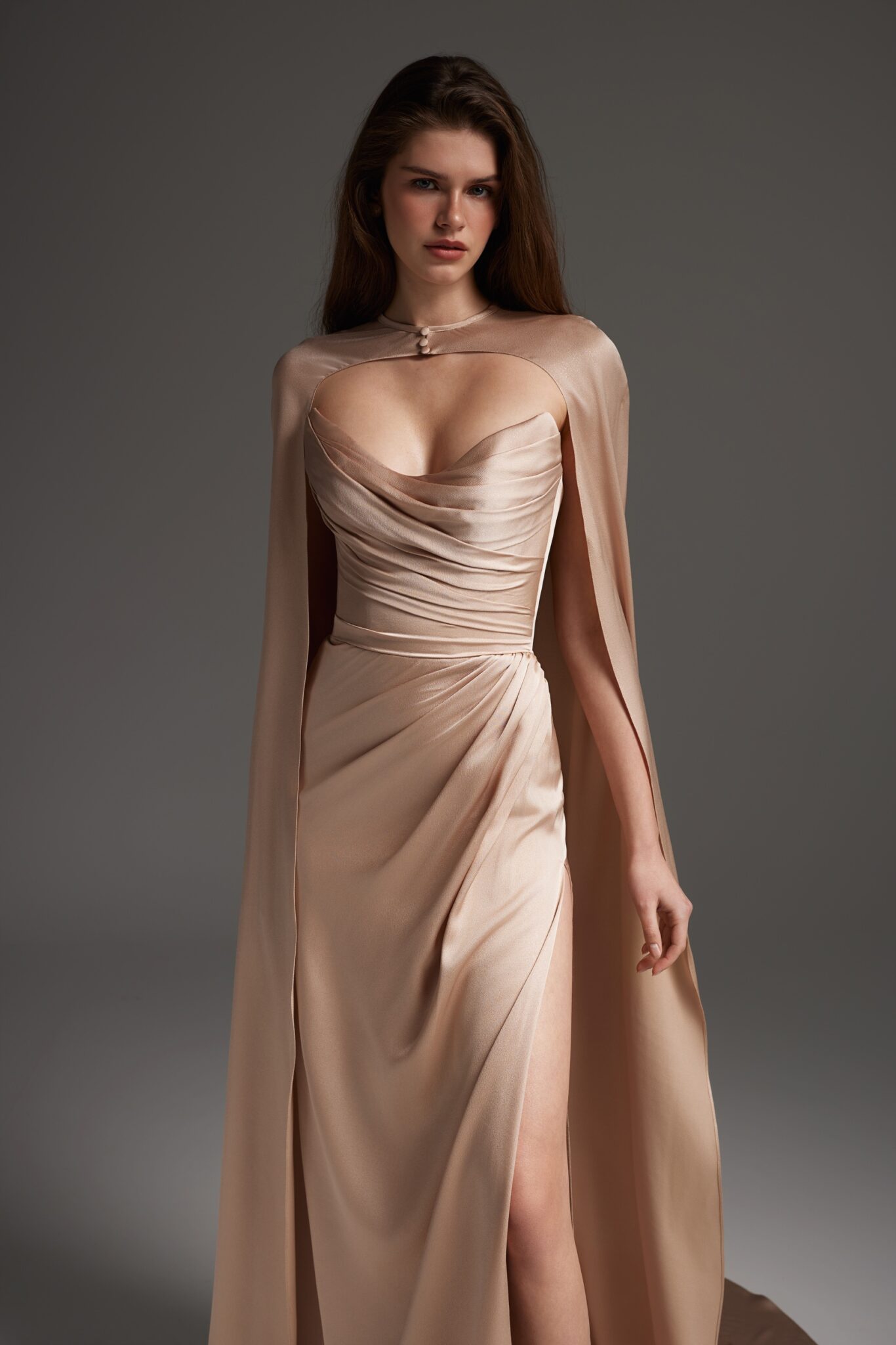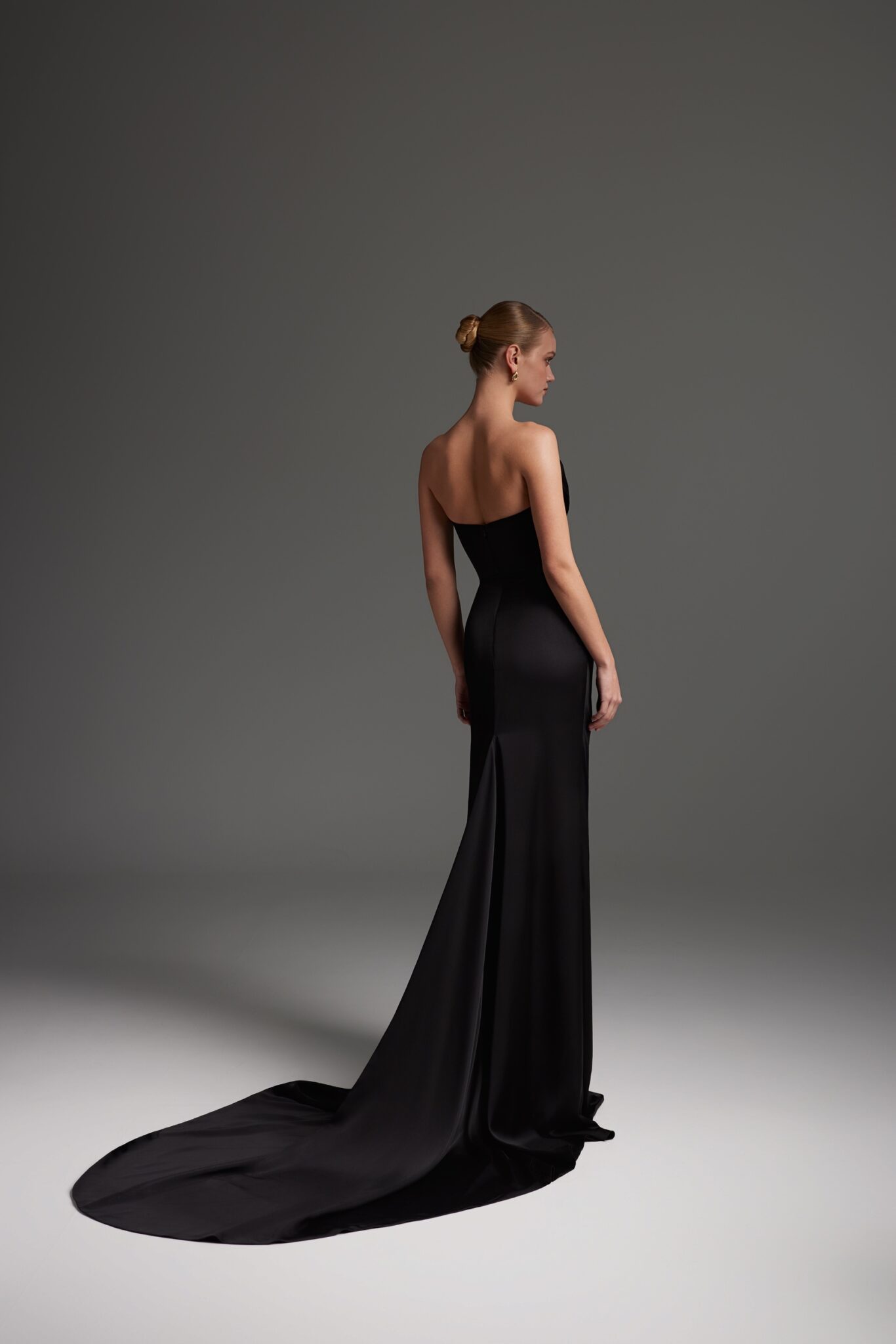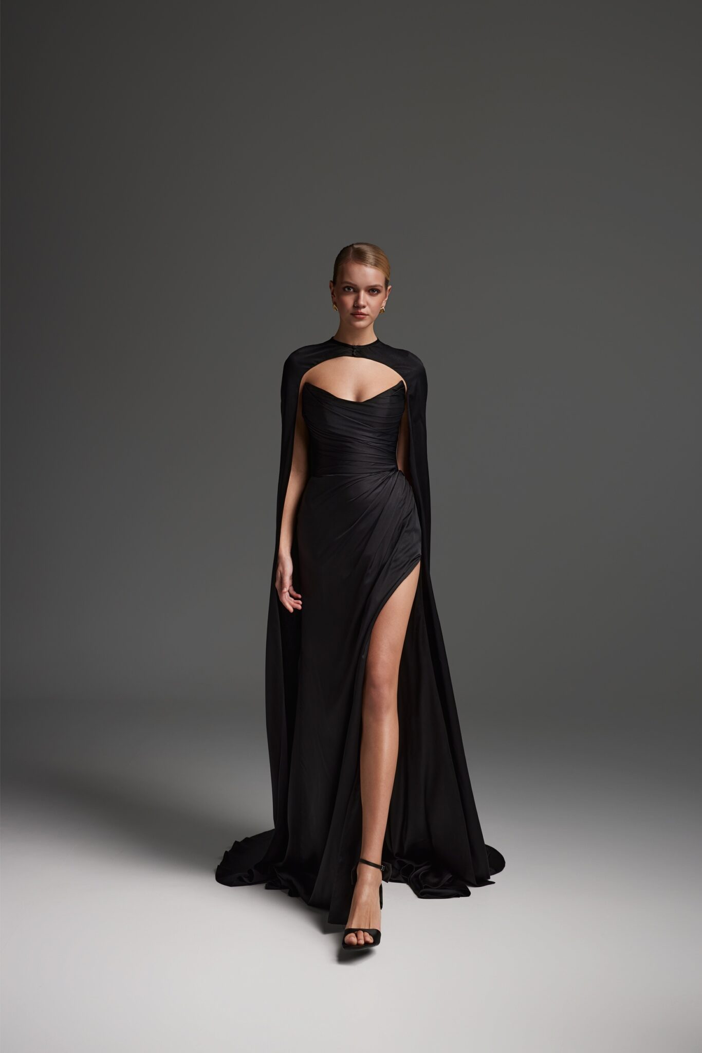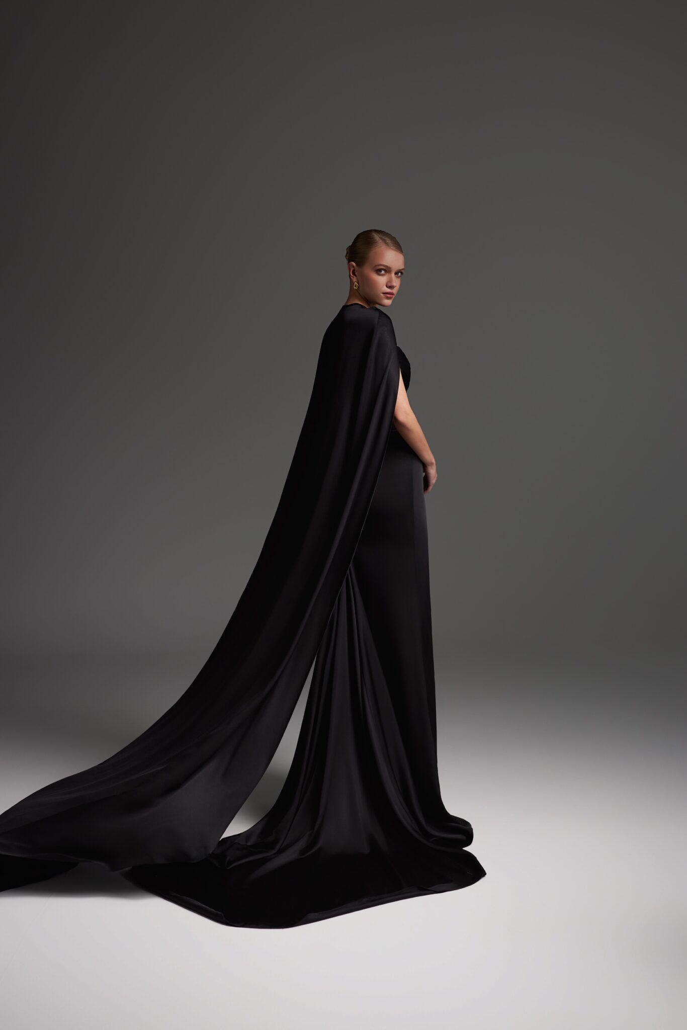 Сукня 2707 прямого крою виконана з сатину з блиском. Має драпірований корсет з вирізом в формі серця, спідницю з розпіркою та знімну накидку з шлейфом, що застібається на шиї. Доступна в чорному та золотому кольорах.