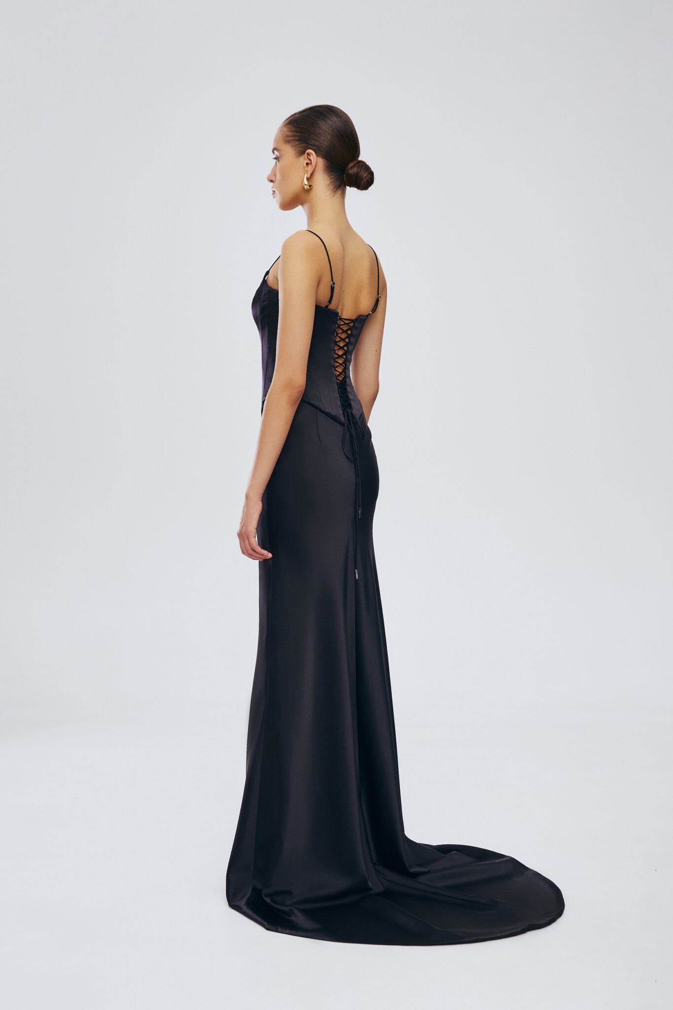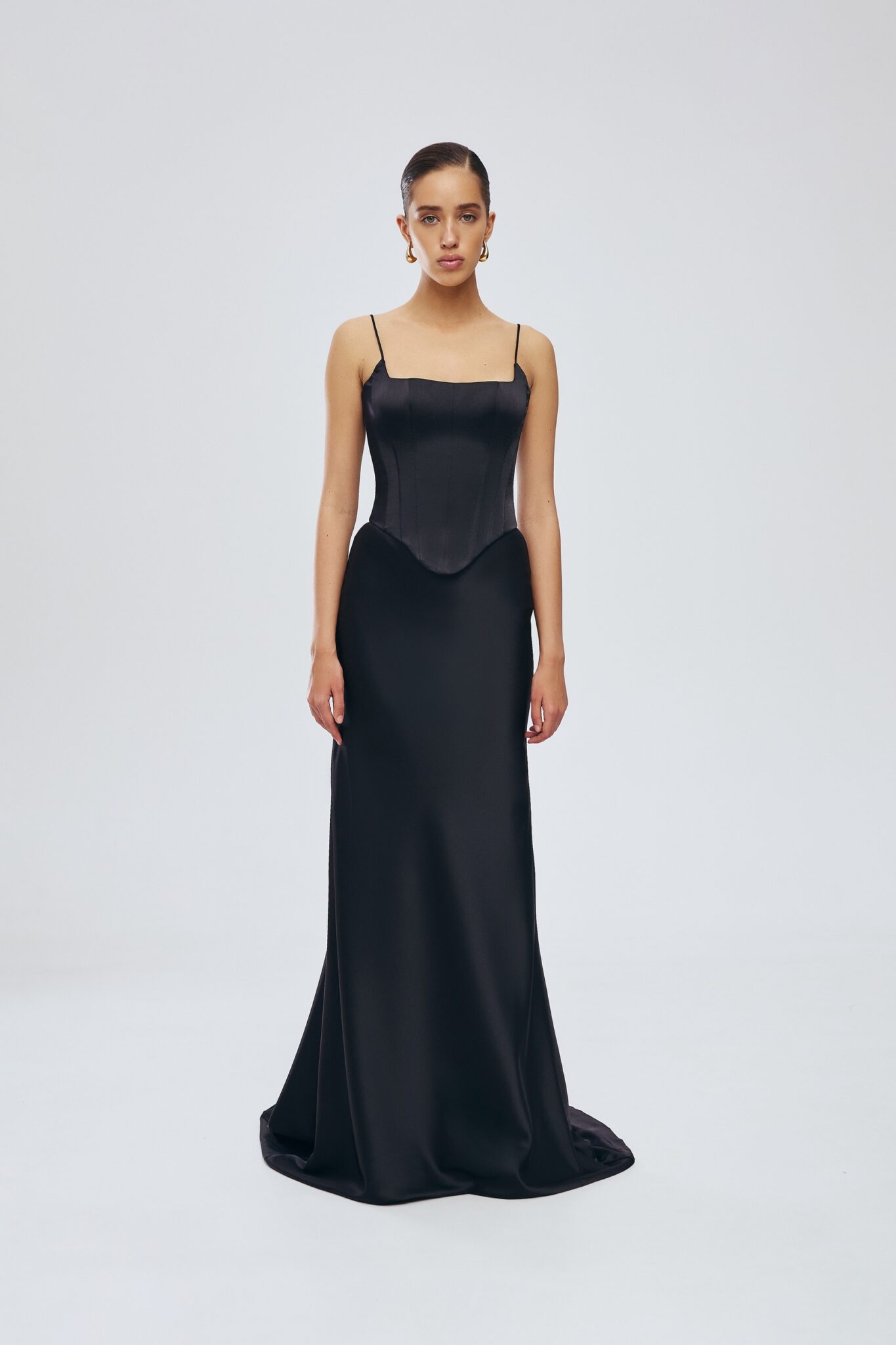 Ця приголомшлива чорна атласна максі-спідниця елегантно спадає до підлоги, пропонуючи витончений силует, який підкреслить будь-який образ. Створена для бездоганного поєднання з корсетом, ця спідниця поєднує в собі розкіш та універсальність, що робить її ідеальною як для офіційних заходів, так і для стильних вечірніх прогулянок.