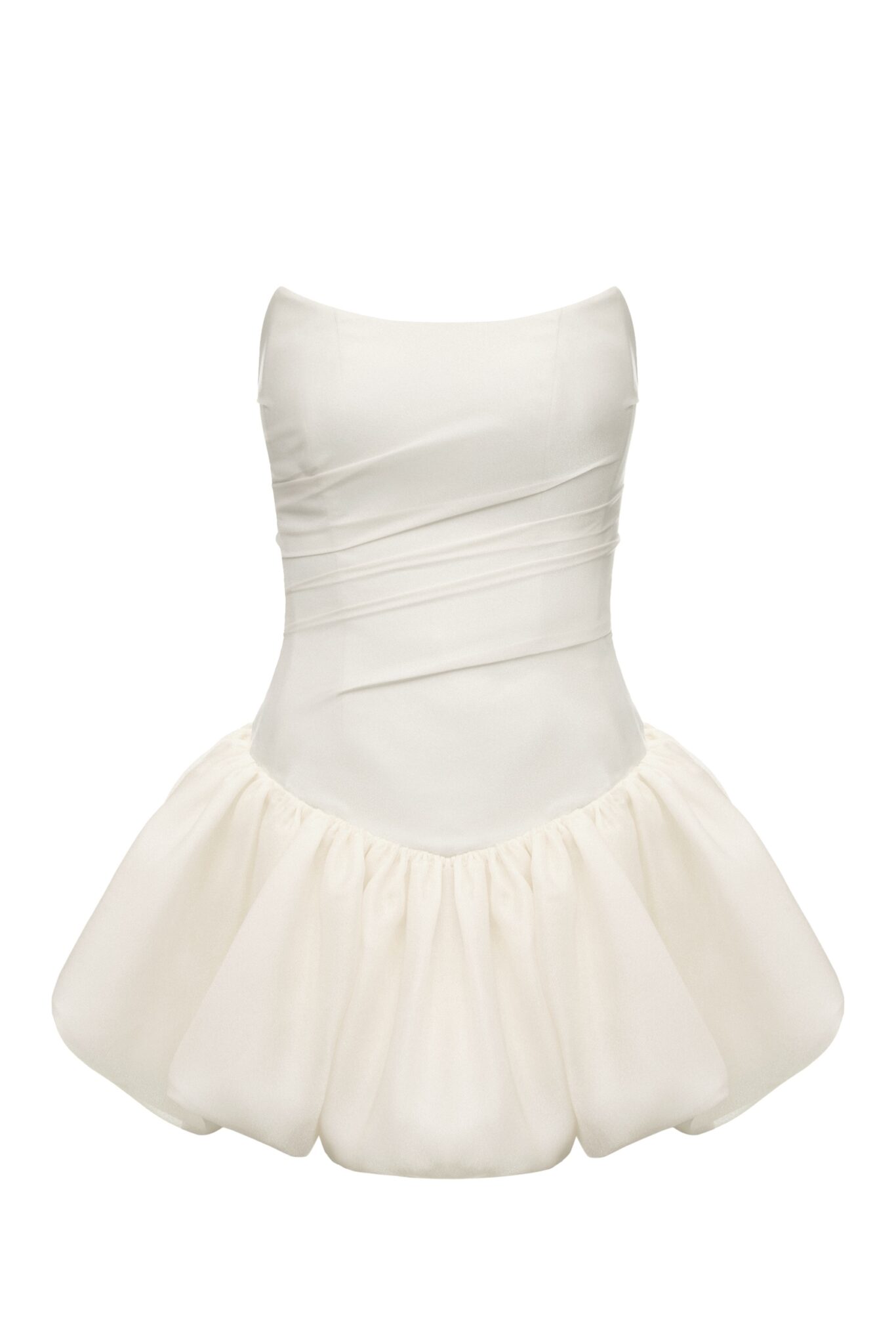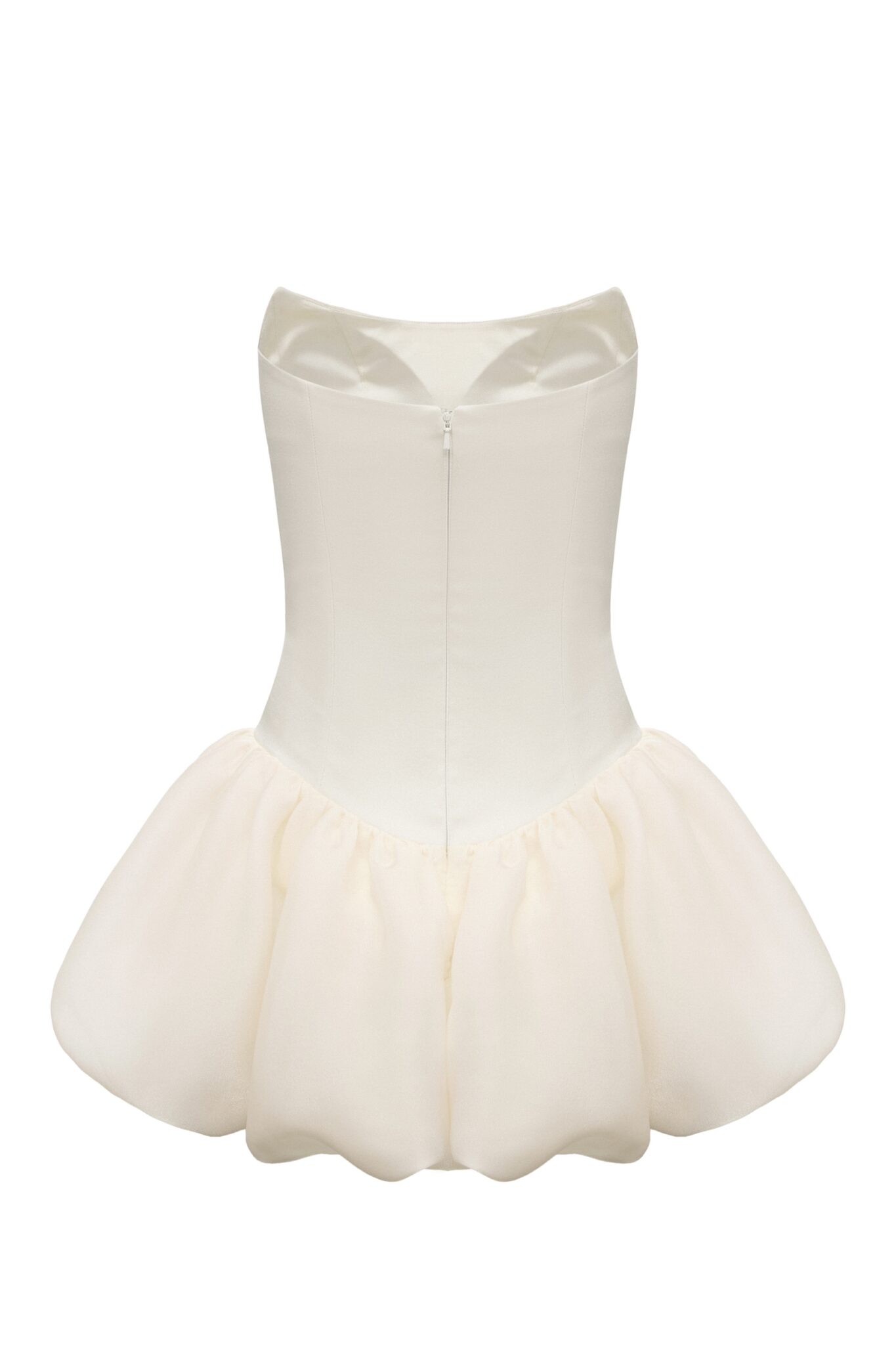 Ця грайлива кремова міні-сукня має структурований корсетний верх, що підкреслює талію, та об’ємну спідницю, що додає образу драматизму. Поєднання жіночних деталей та сміливого силуету робить її ідеальною для вечірок або особливих подій. Виразний виріб, що випромінює шарм та елегантність.