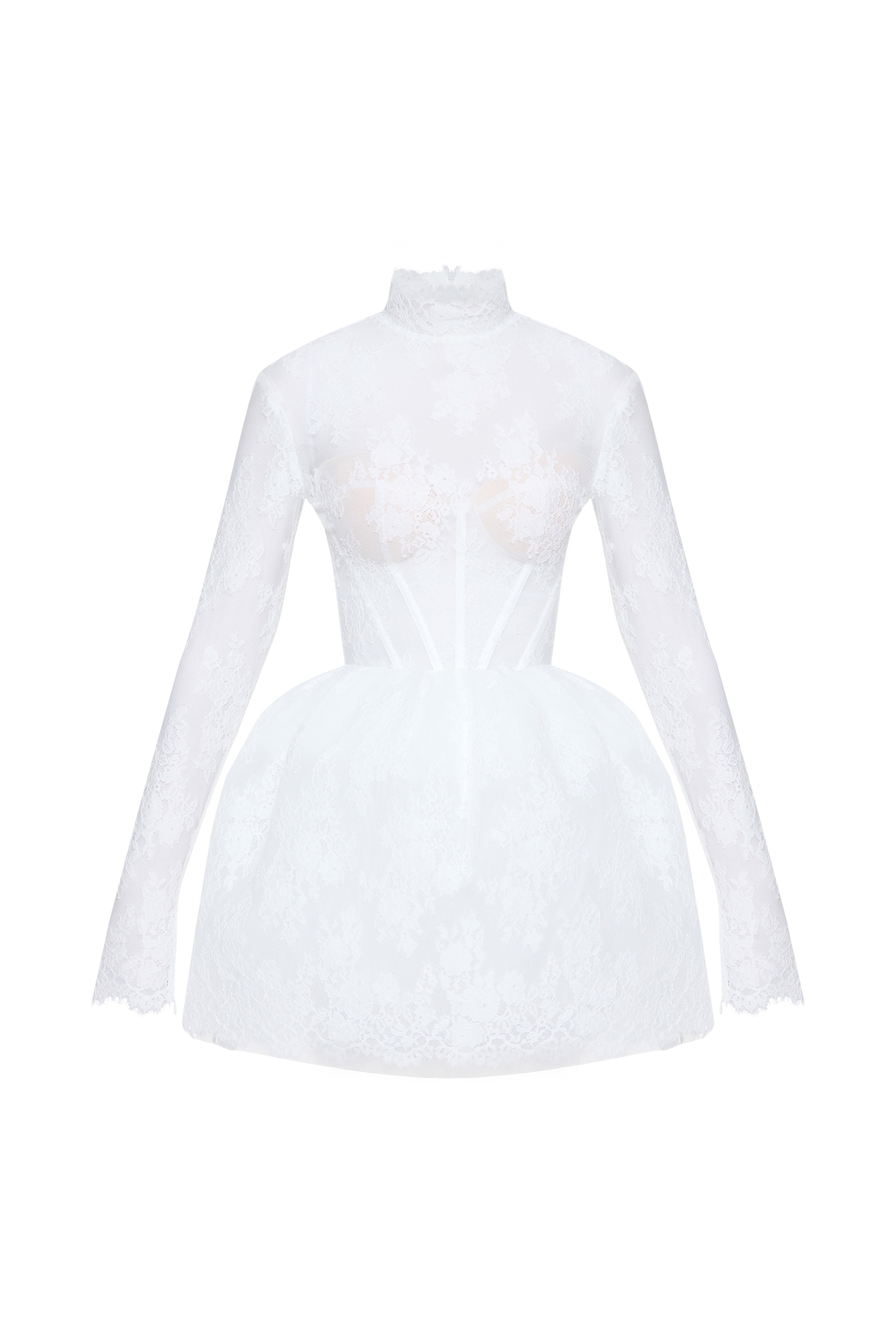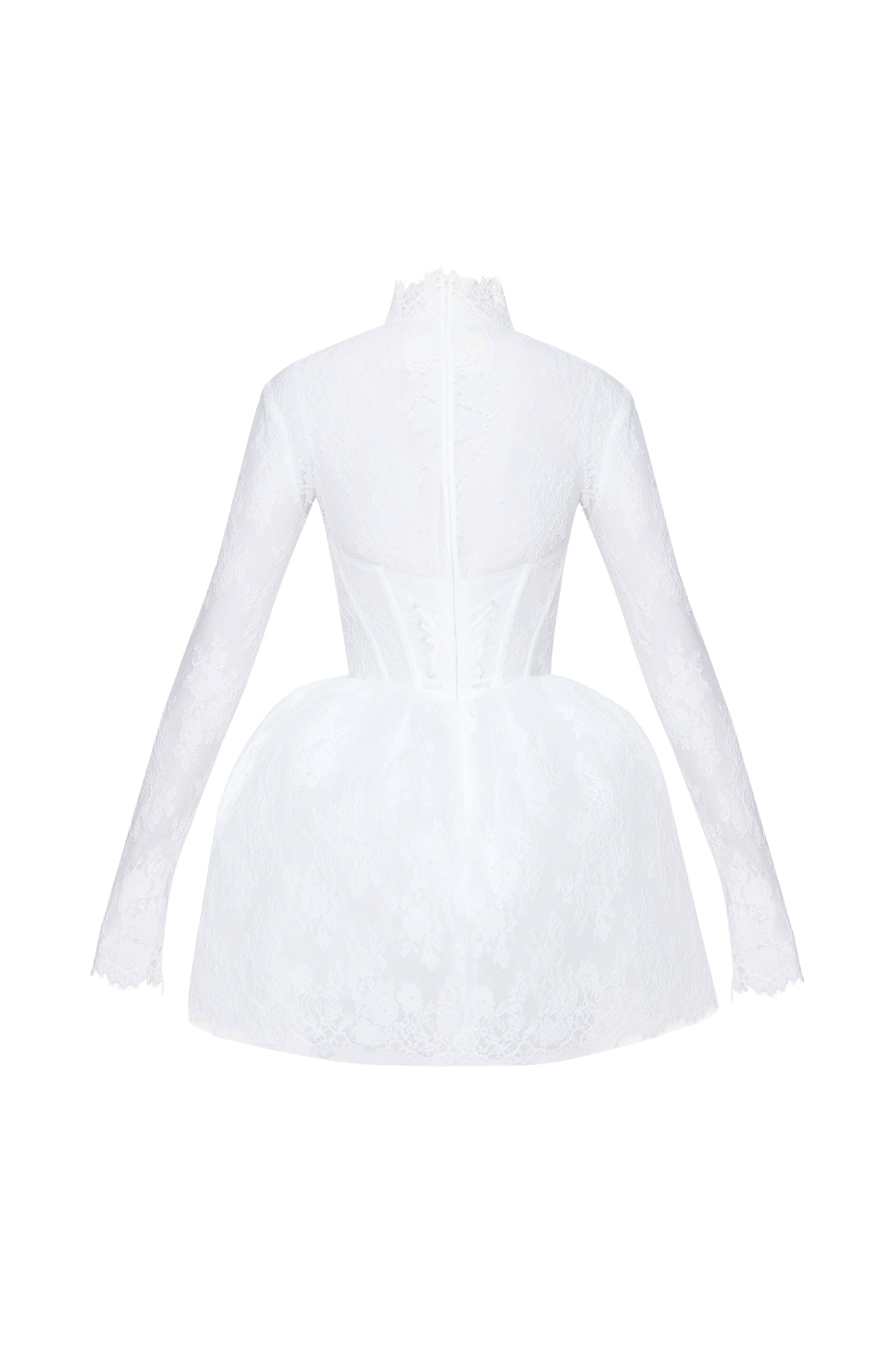 Романтична міні-сукня з корсетною основою. Легка квітчаста сітка під горло з довгими рукавами робить образ елегантним, а коротка спідниця додає грайливості.