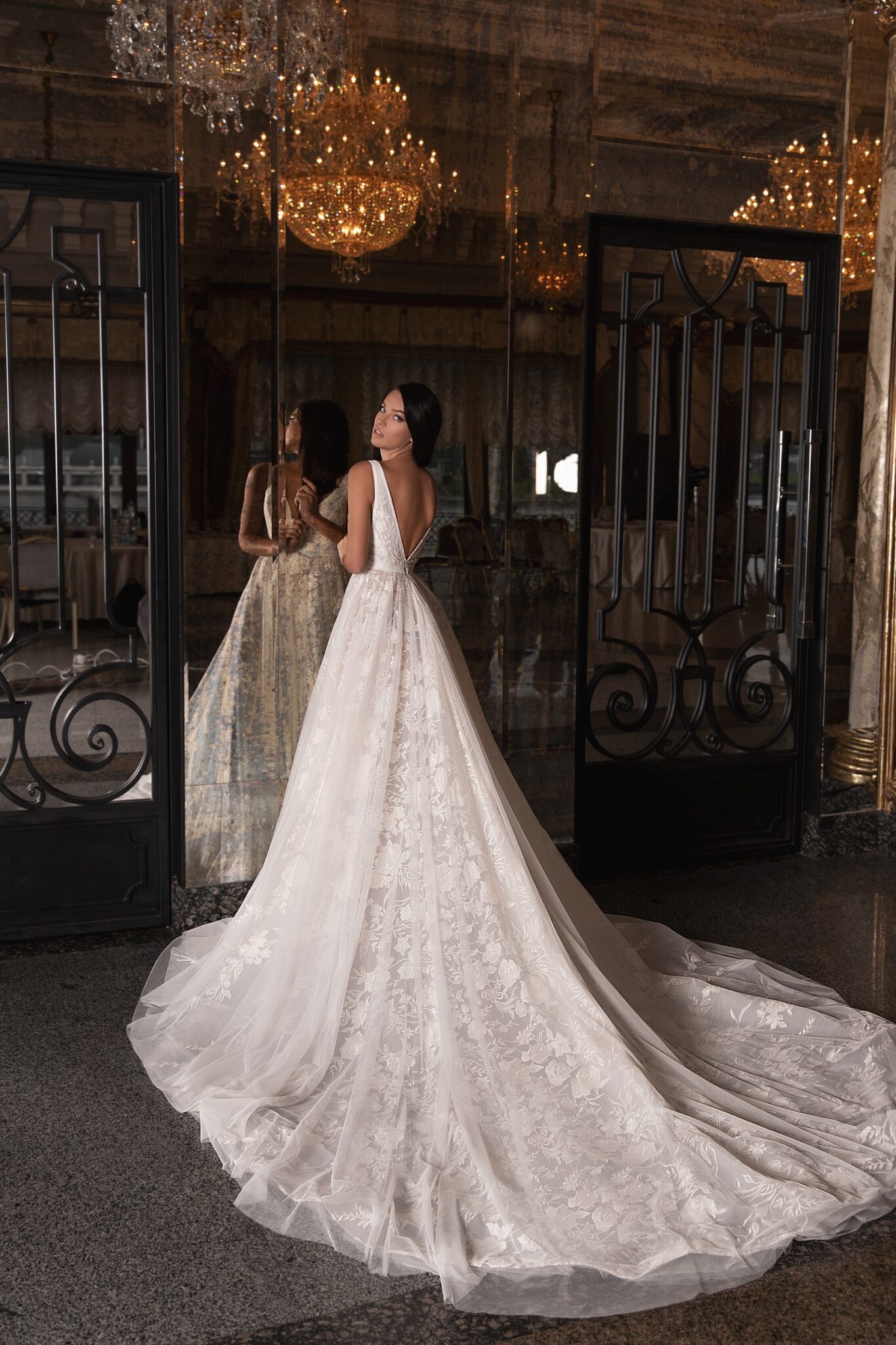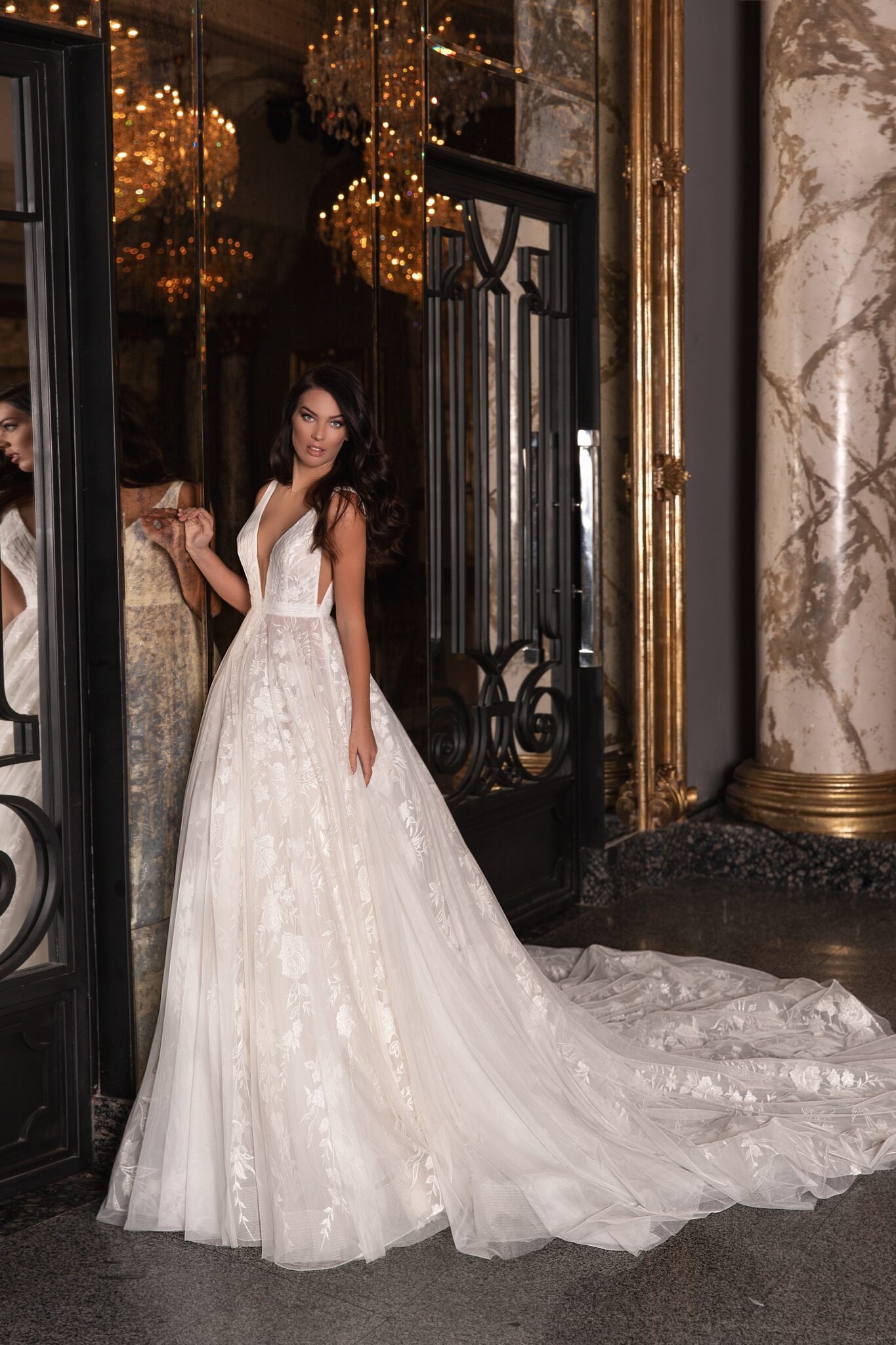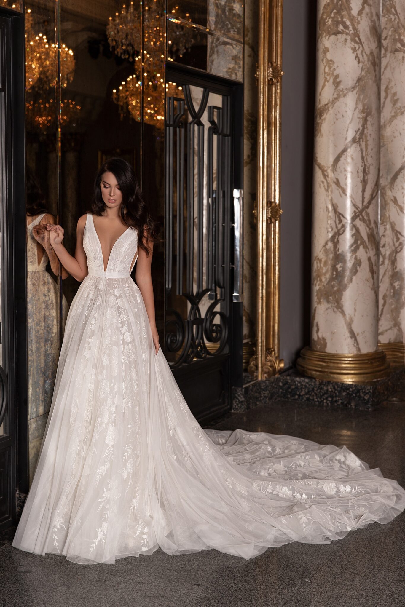 Alicia – довга весільна сукня у стилі А-силует. Вона прикрашена ніжним малюнком. Сукня має глибокий виріз, вирізи під пахвами та чудову горловину. Вона виготовлена з фантастичної тканини, яка прикрашена квітковим візерунком. Цей квітковий малюнок прикритий шаром прозорої мереживної тканини. Також є довгий шлейф, який додає чарівності.