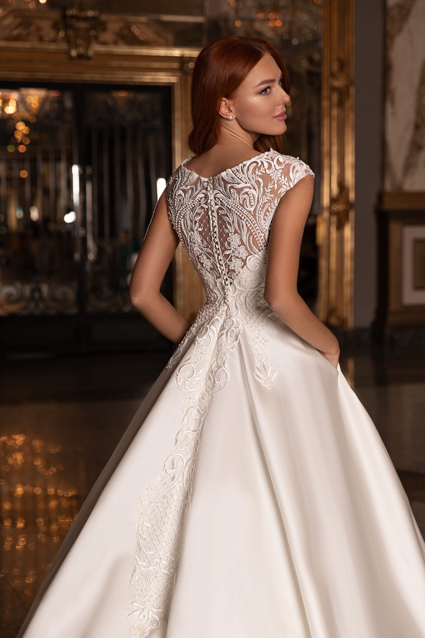 Розкішна весільна сукня з мереживним корсетом та атласною спідницею. Сукня з декольте у формі сердечка прикрашена мереживним верхом. Це мереживо з квітковим візерунком прикрашене перлами. Ззаду на сукні розташована ряд гудзиків та довгий мереживний елемент, що спускається до середини спідниці. Сама спідниця має довгий шлейф та два кишені.