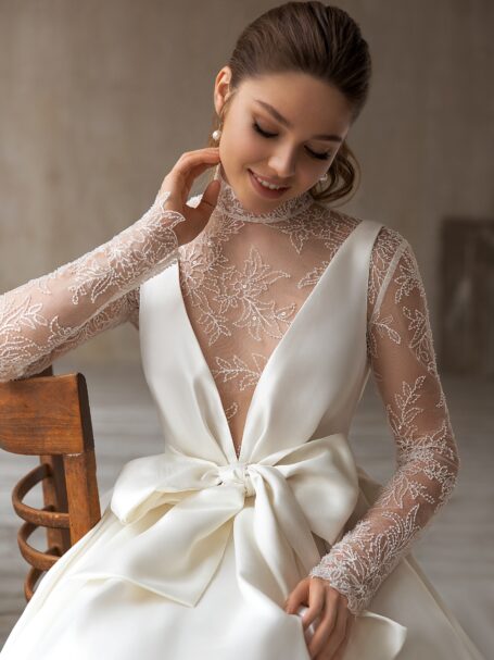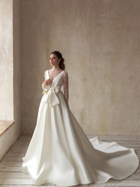 Класична сукня силуету “A-line” з величезною спідницею, що переходить в фантастичний шлейф. Сукня з широкими бретелями виготовлена зі сяючого атласу. Верхню частину прикрашають V-подібний глибокий виріз і спокусливий виріз на спинці сукні. Розкішна вільна спідниця виглядає фантастично. Загальний образ можна доповнити болеро, виготовленим з блискучих кристалів і намистин, які утворюють геометричний малюнок.