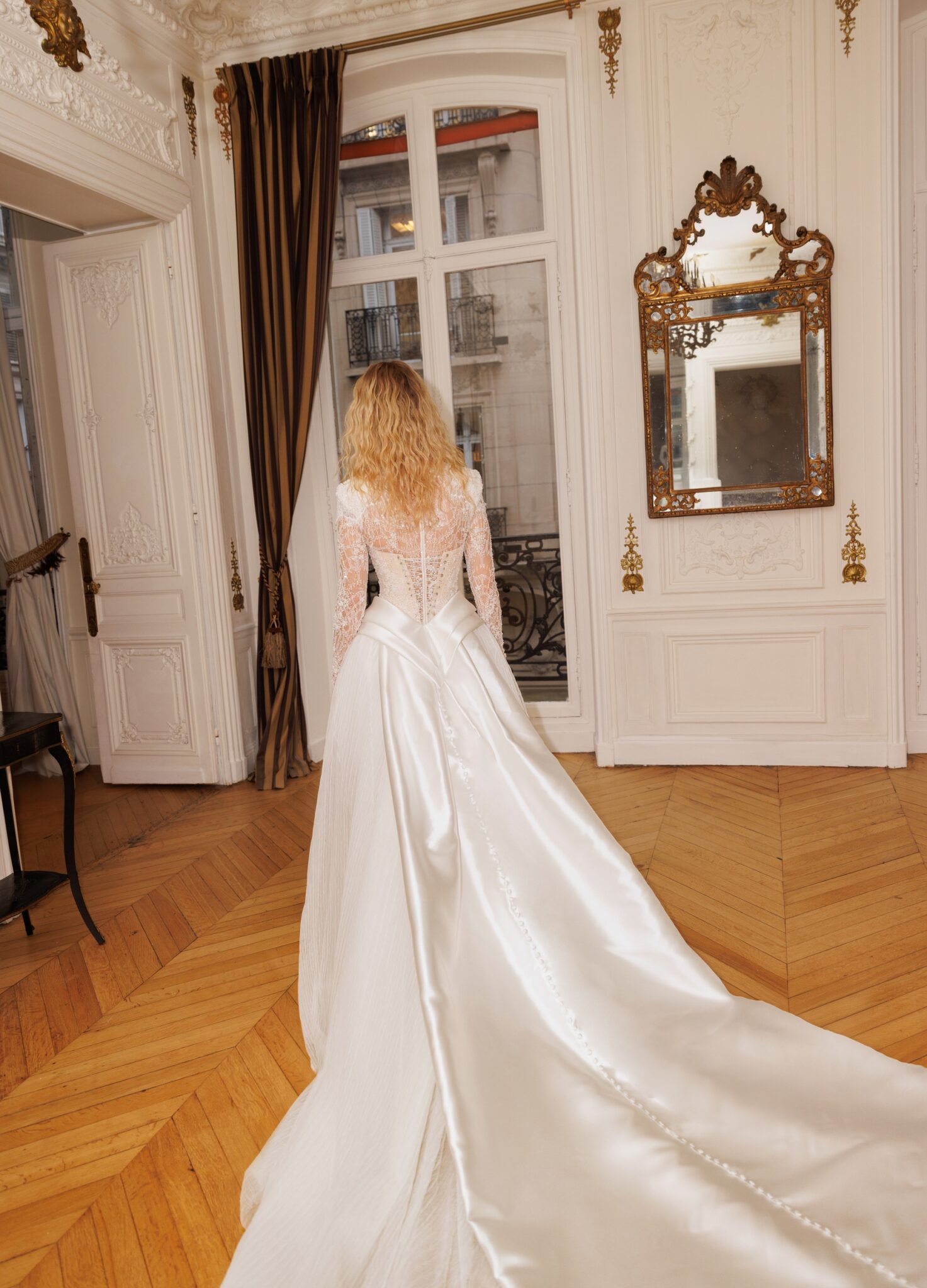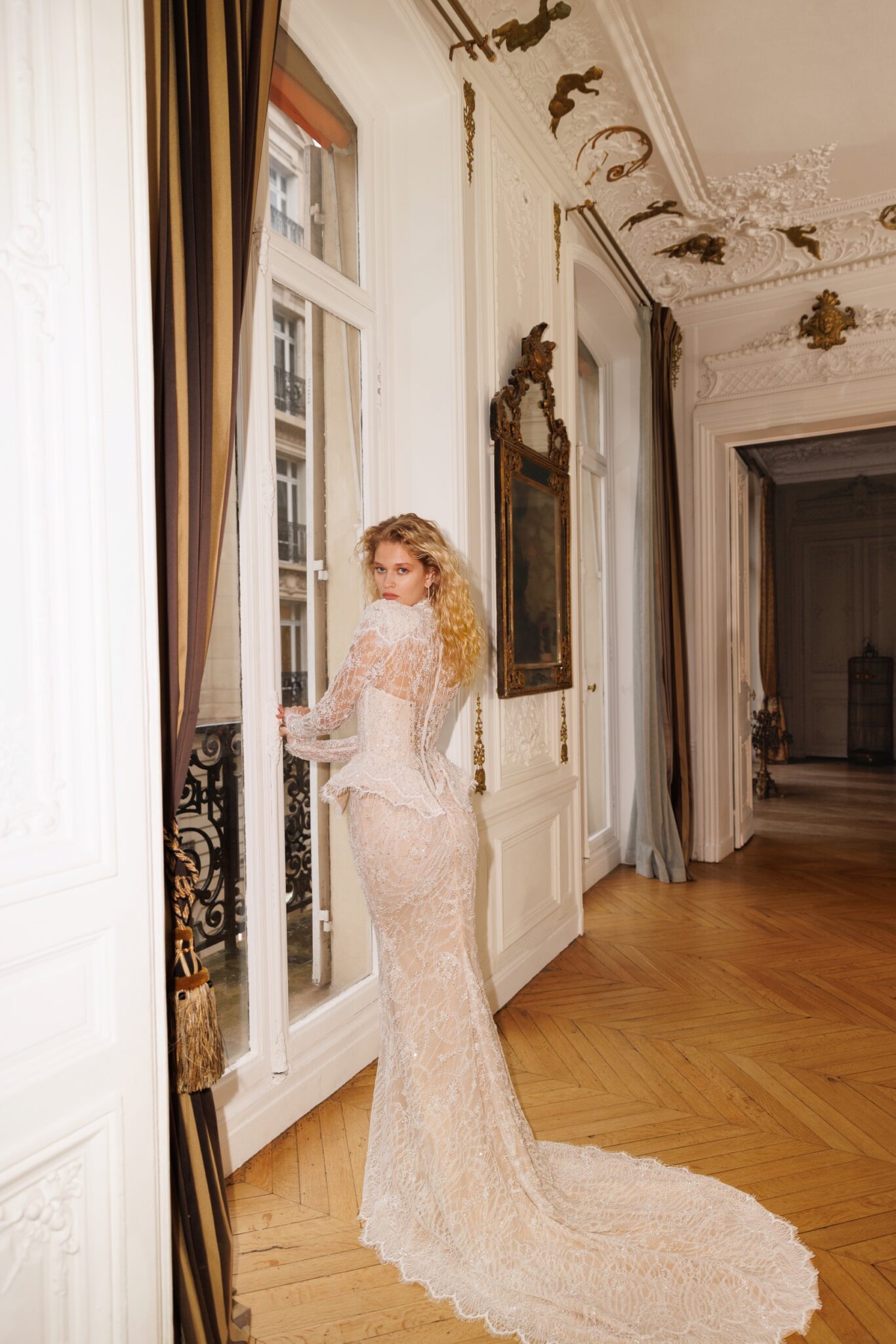 Єдина сукня А-силуету в колекції, що складається з топа з високим горлом, довгими рукавами та класичного корсета, вкритого ретельно розшитим бісером мереживом ручної роботи. Спідниця є родзинкою образу: вона багатошарова та виготовлена з чотирьох різних видів найтоншої тканини. Мереживо створює елегантну основу спідниці з баскою. Образ опціонально доповнюється верхньою спідницею з плісированої сітки, фатину та шовку мікадо, що створює більш об’ємний силует.