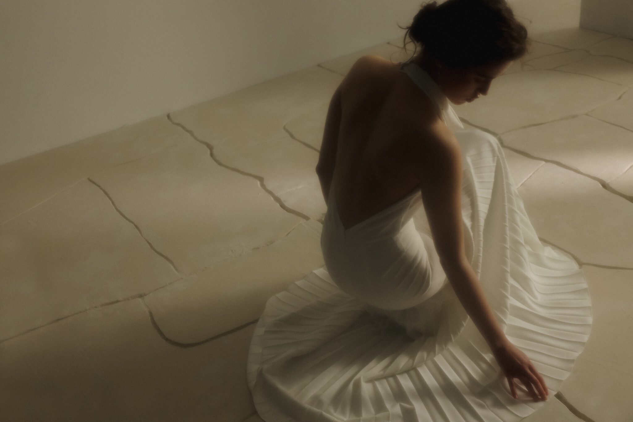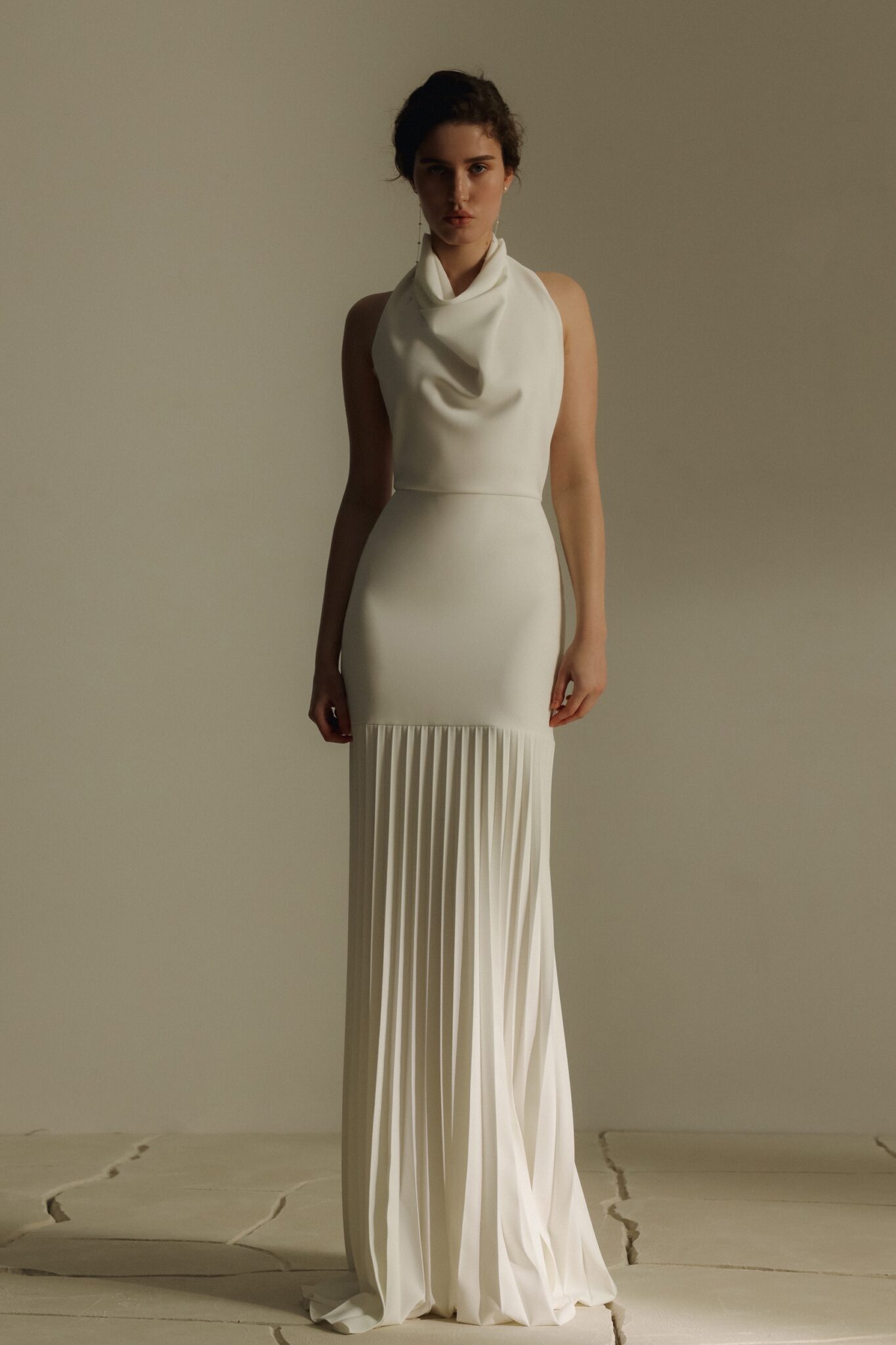 Таке поєднання приталених і струмливих фактур додає сукні глибини, зберігаючи при цьому її чисту, сучасну сутність.
