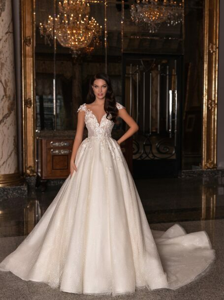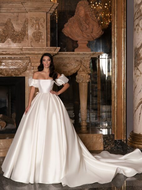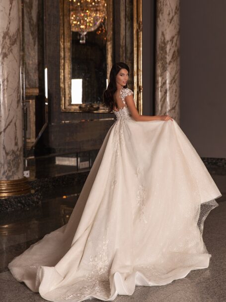 Фантастична весільна сукня з квадратним декольте та живописно прикрашеним спинкою. Сукня у стилі “A-line” на широких бретелях виконана з атласу. Вона прикрашена поясом з квітами, виготовленими з намистин. Спина сукні вкрита вишивкою з квітами, які прикрашені намистинами, пайєтками та перлами. Також є рядок білих гудзиків. Ця вишивка також знаходиться на переді сукні. Витончений шлейф завершує образ.