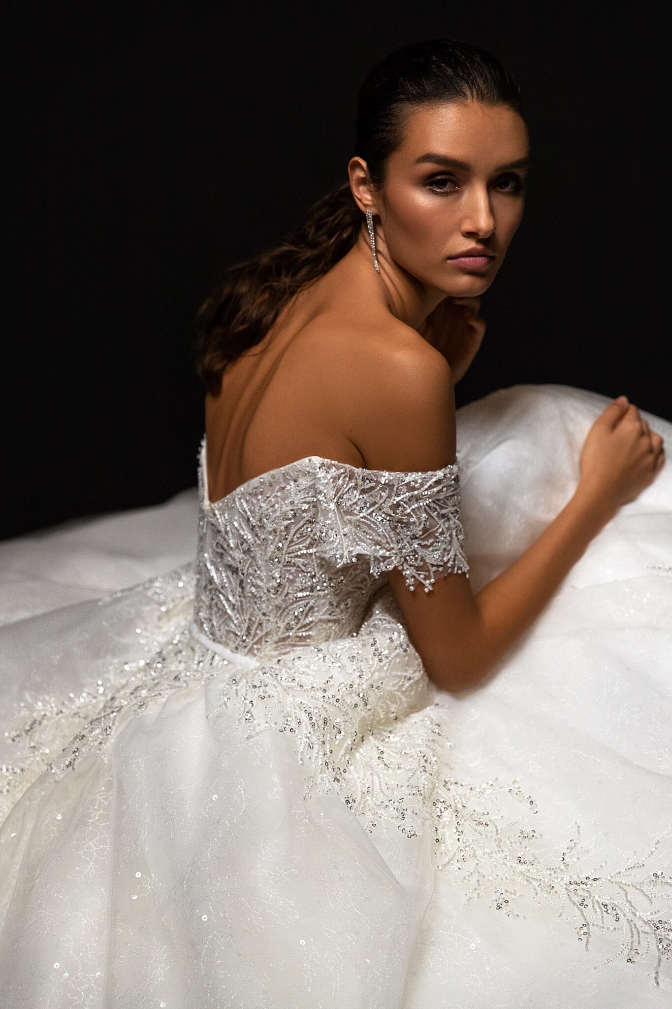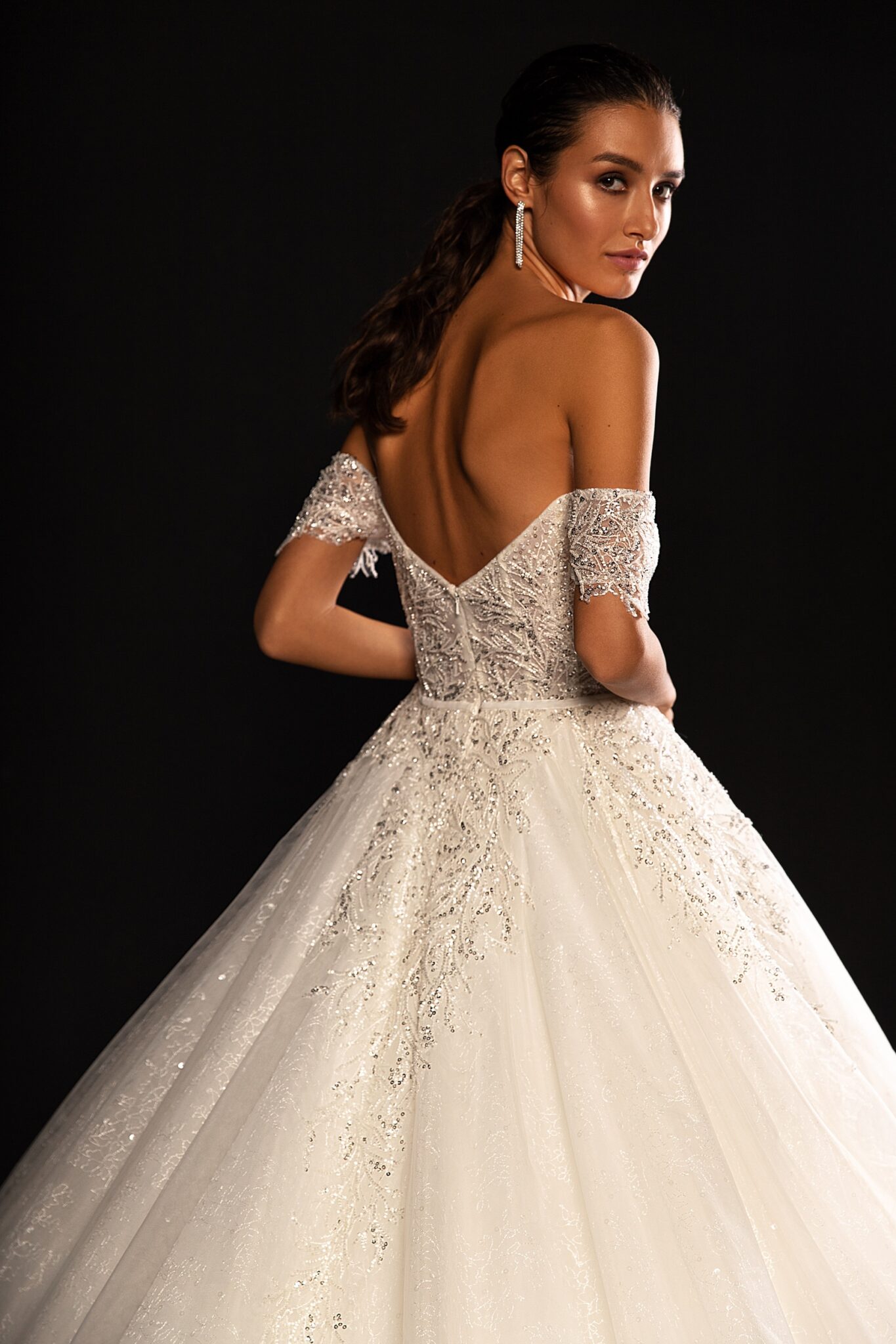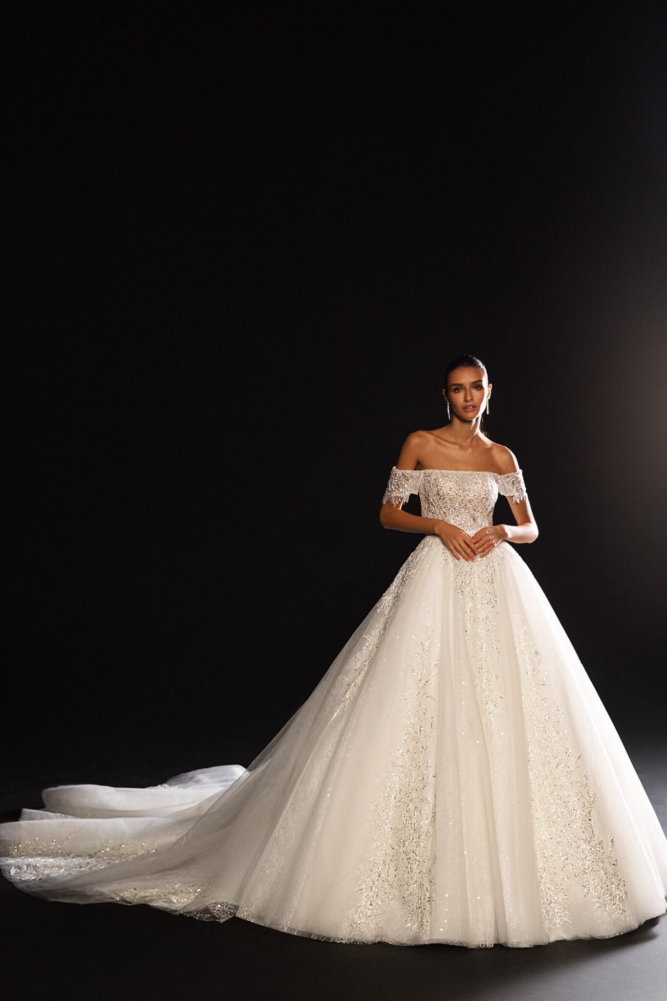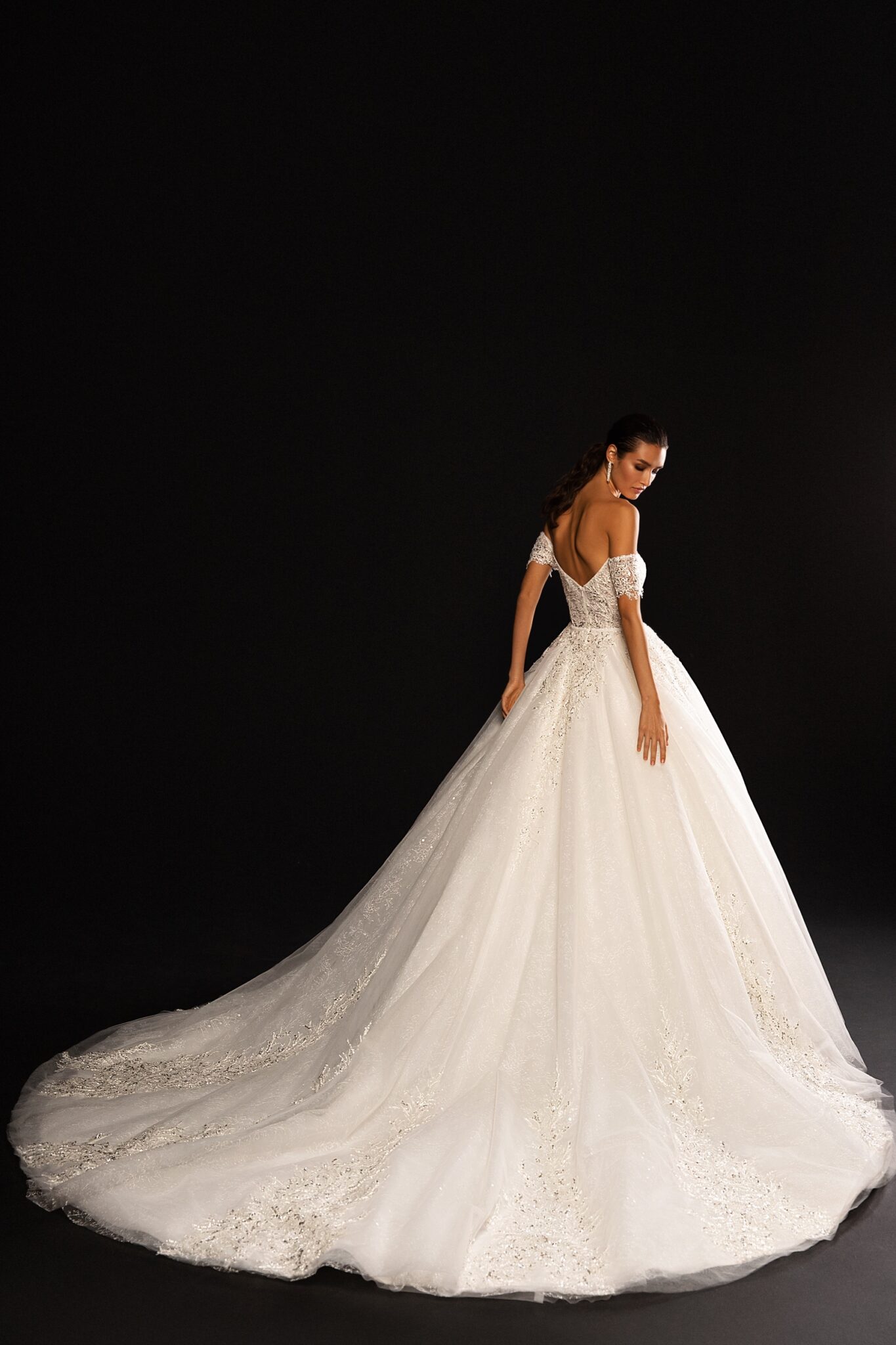 Ця весільна сукня виглядає дійсно велично. Вільна сукня з прямим вирізом на грудях прикрашена унікальною мереживною вишивкою. Дрібні рукавики додають романтики сукні. Фантастична спідниця переходить у чудовий шлейф.