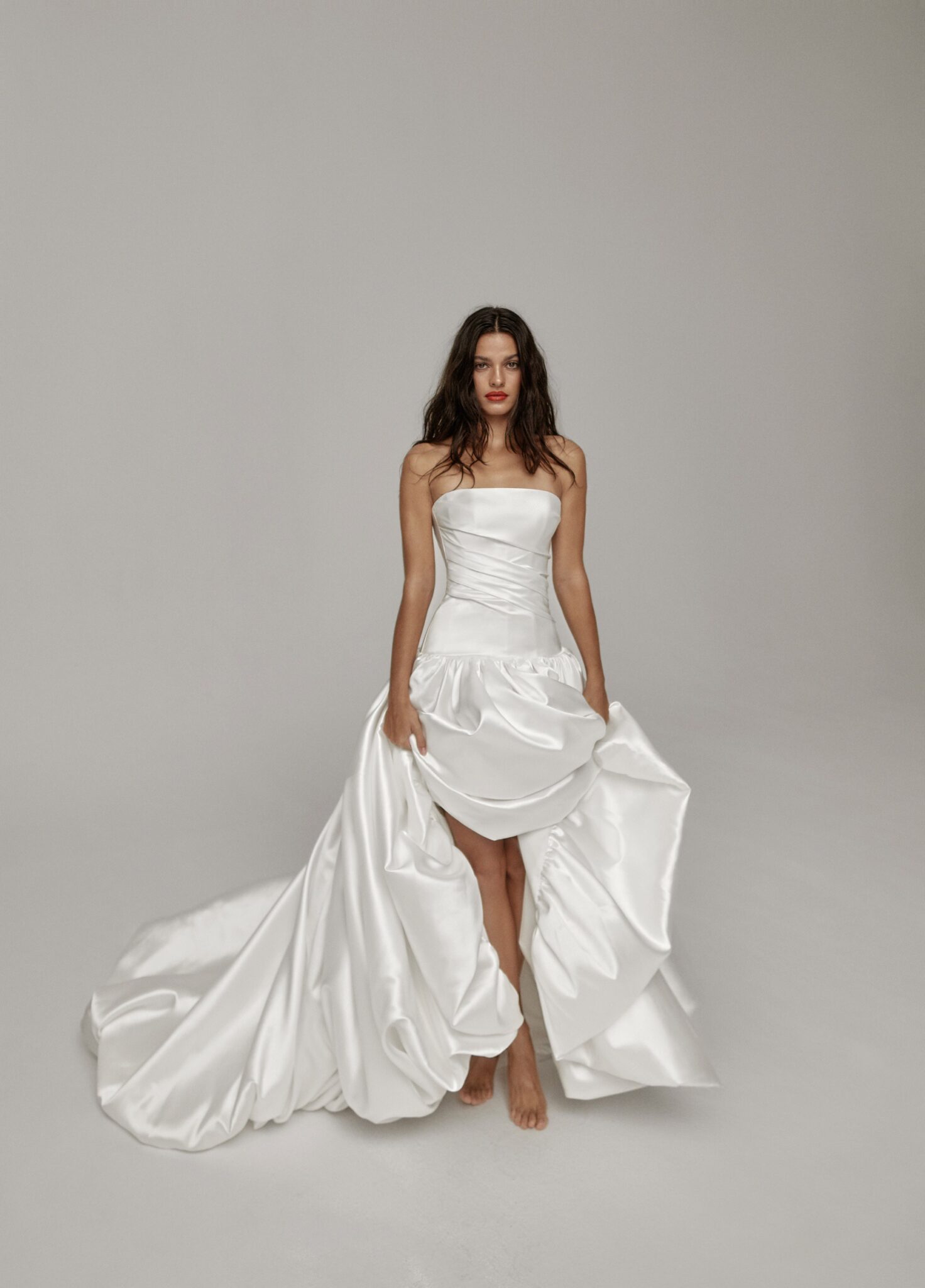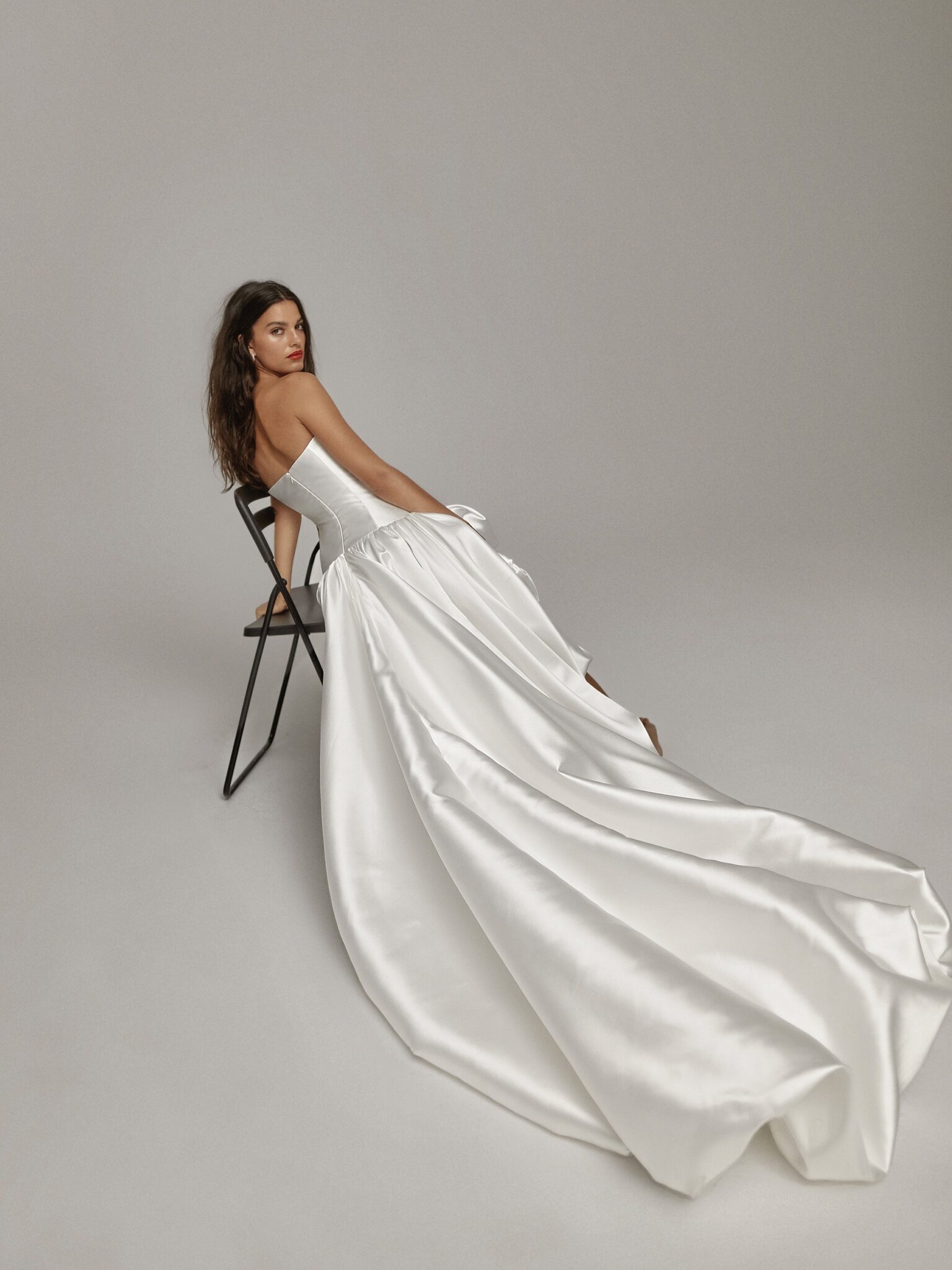 Об’ємна асиметрична спідниця та краї, які загорнуті всередину додають образу драматичності. Ідеальна сукня для нареченої, яка цінує позачасову елегантність та сучасні акценти.
