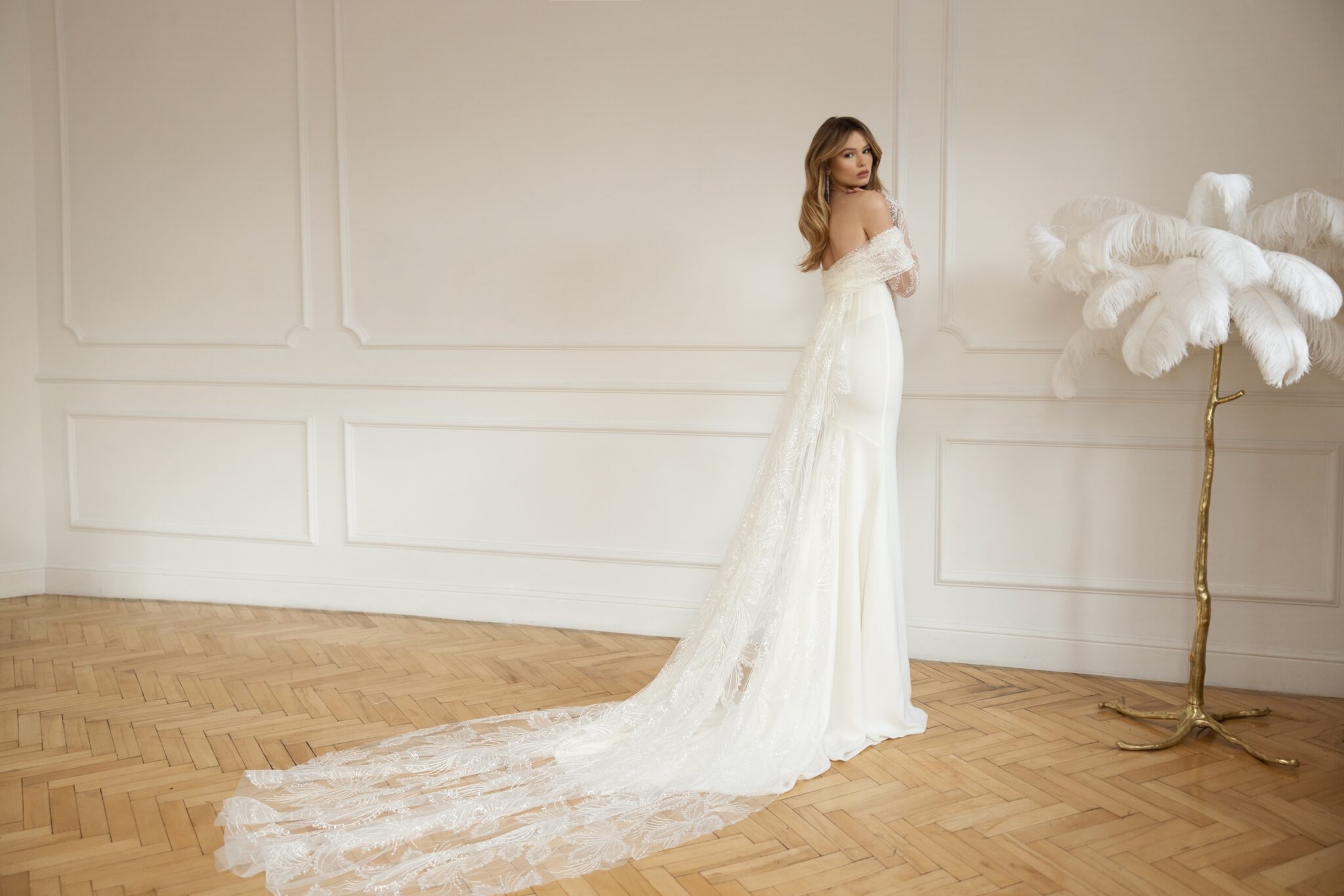 Це мінімалістична сукня створена з м’якого, розкішного крепу. Вільний силует русалки з класичним безплічним корсетом і витонченим V-подібним вирізом переходить у гладку спідницю з катедральним шлейфом. Вражаюча вишивана накидка з мережива з квітковим малюнком повністю трансформує сукню для церемонії весілля.