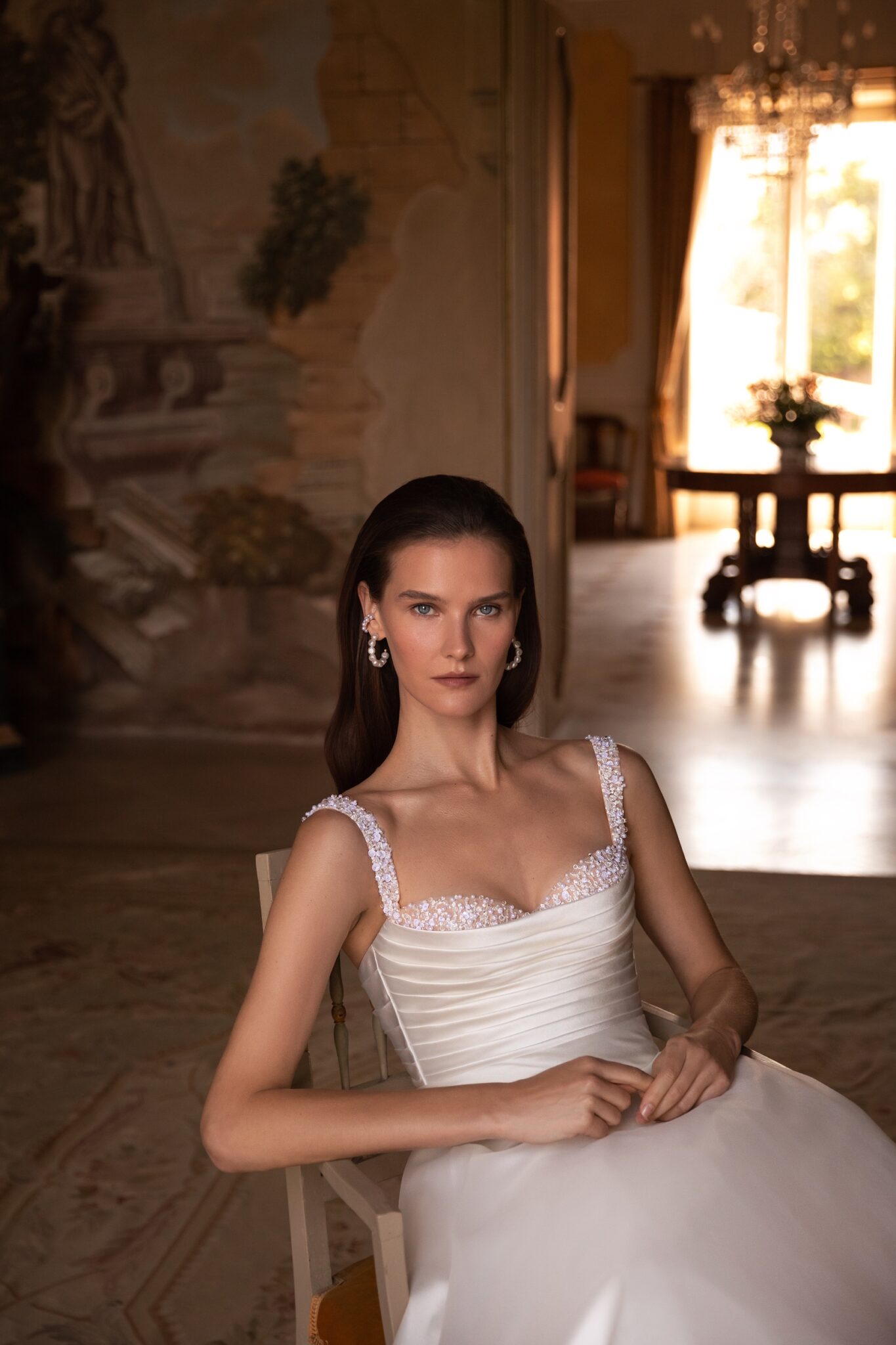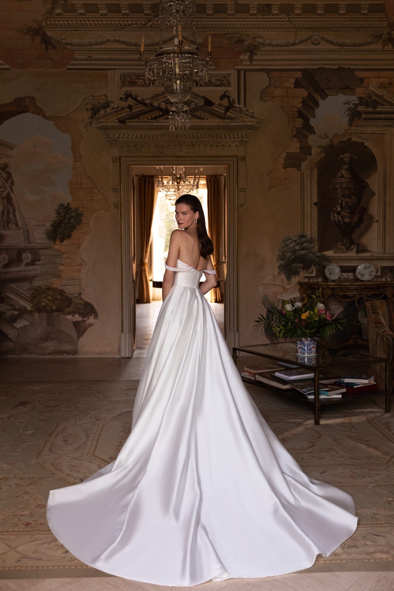 Приваблива і романтична – ця бальна сукня виконана з м’якого атласу з фантастичним декорованим ліфом. Геометричне драпірування виглядає розкішно в поєднанні з перлами, якими прикрашені бретелі і виріз декольте. Кремова тюлева спідниця А-силуету переходить у м’який довгий шлейф.
