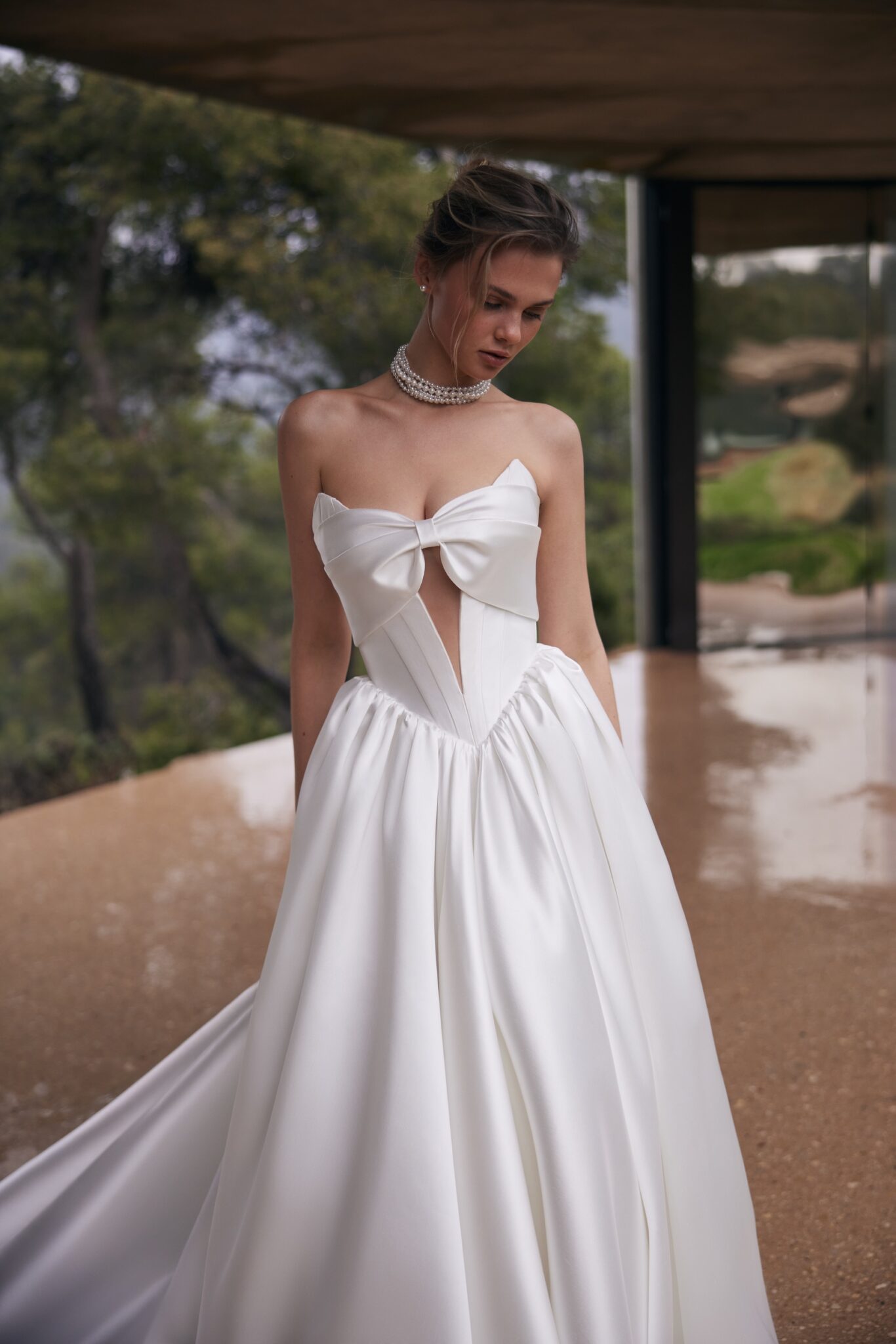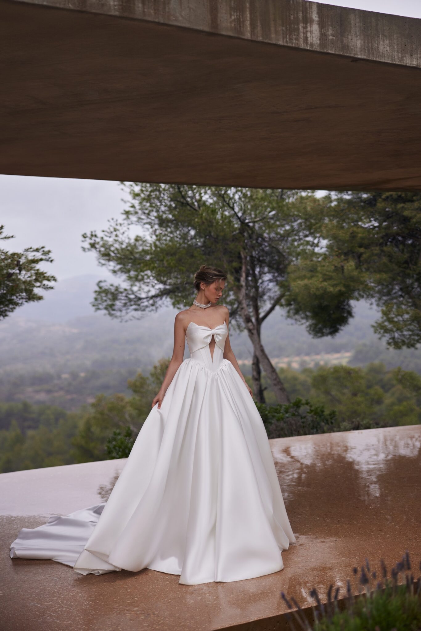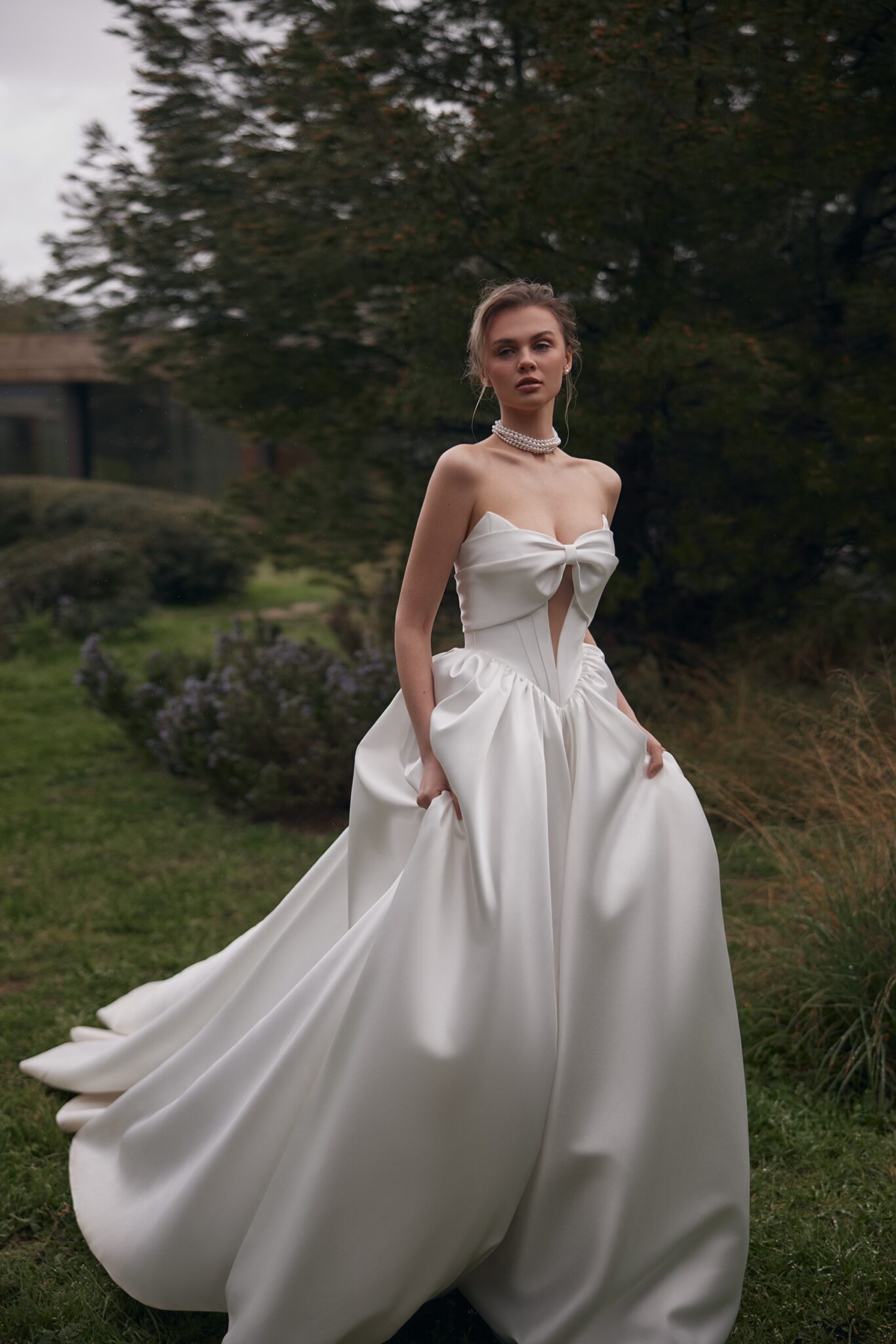 Крім того, структурована тканина Мікадо забезпечує бездоганний силует, а мінімалістичний, але стильний дизайн робить її ідеальною як для класичних, так і для сучасних наречених. Деталь банта підкреслює романтичний шарм, роблячи сукню позачасовим вибором для весільного образу.